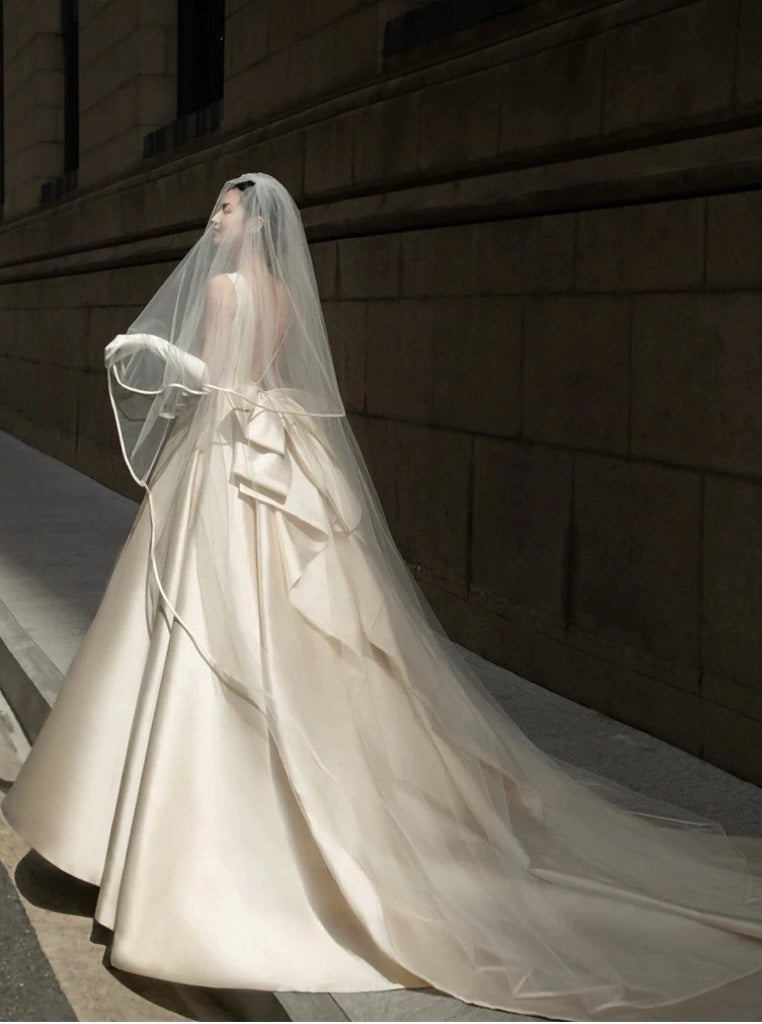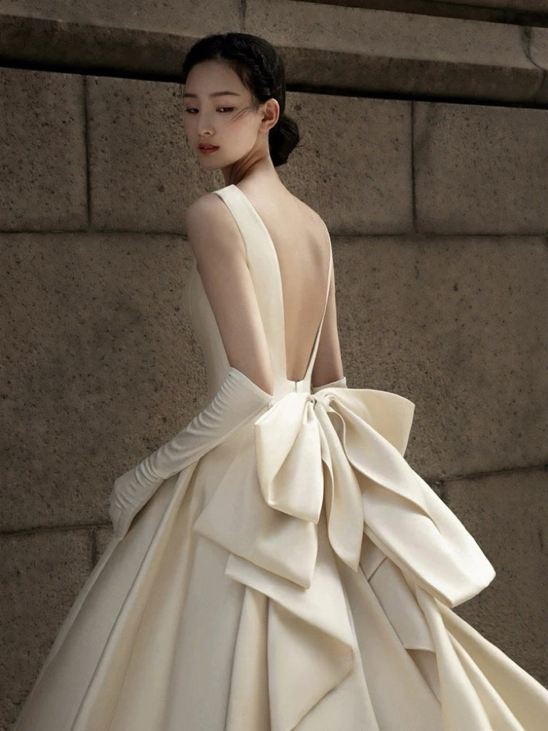 バックには大きなリボンがあしらわれ、クラシカルな中にもモダンなアクセントをプラス。ロングトレーンが優雅に広がり、歩くたびにドラマティックな雰囲気を演出します。格式高い教会式から、モダンなホテルウェディングまで、あらゆるシーンにふさわしい一着です。