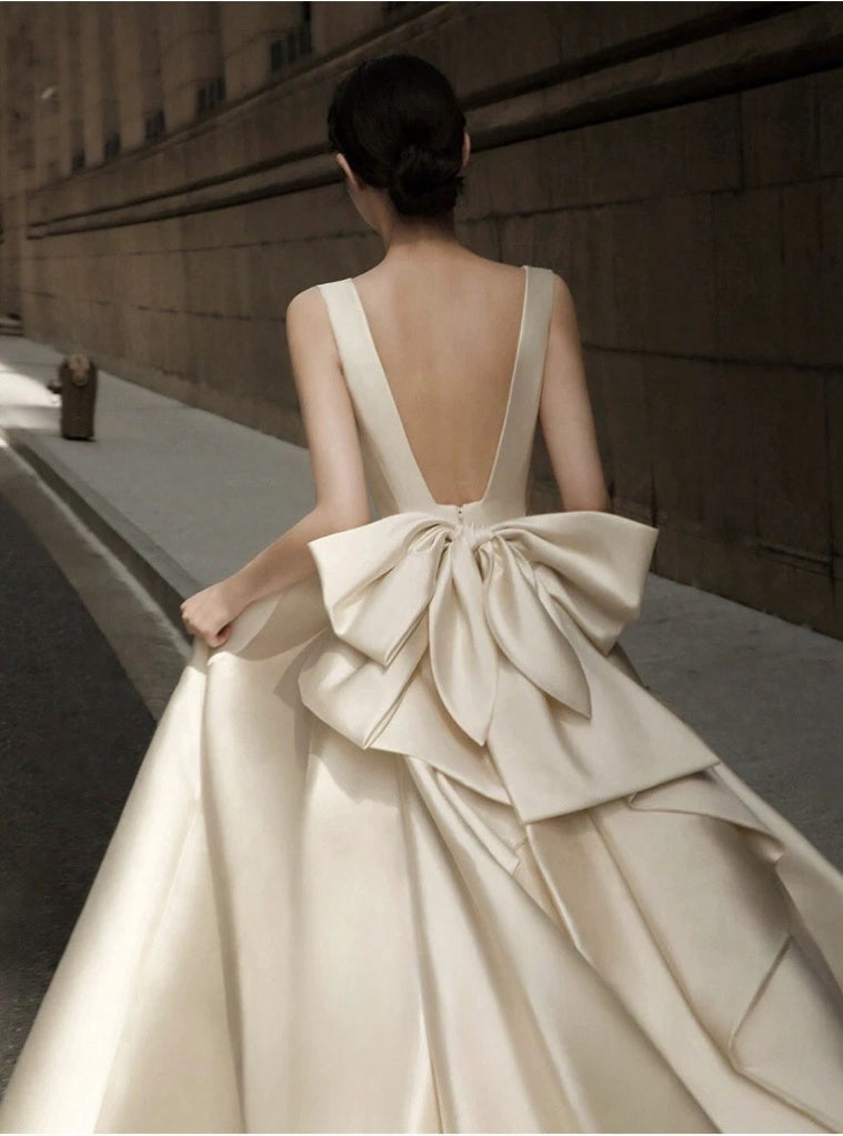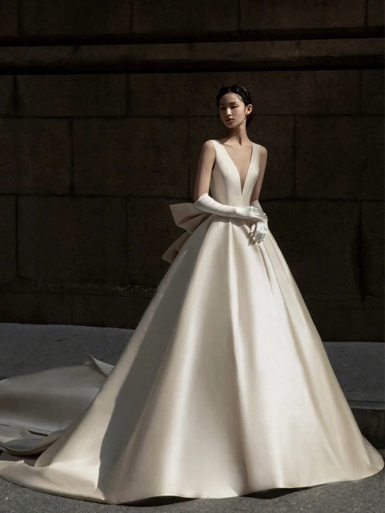 洗練されたシンプルな美しさが際立つAラインのウェディングドレス。上質なサテン生地が放つ上品な光沢が、花嫁の気品を引き立てます。深めのVネックラインがデコルテを美しく見せ、スタイリッシュで洗練された印象に。