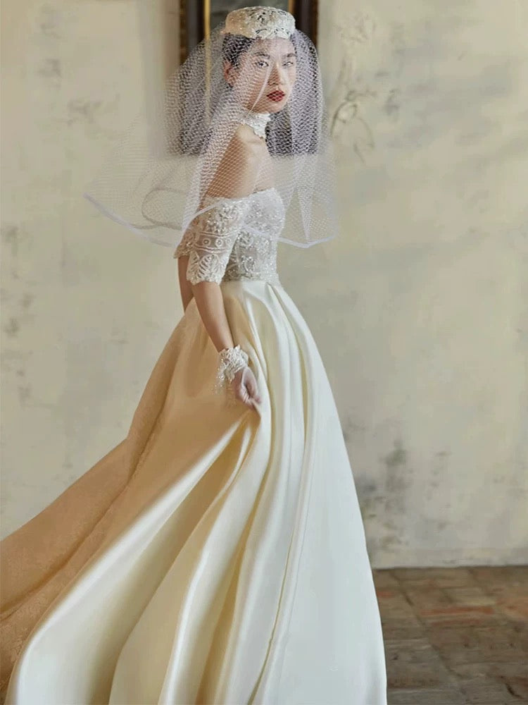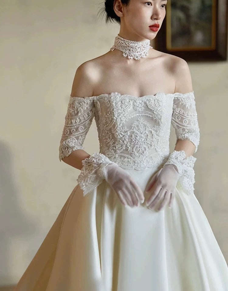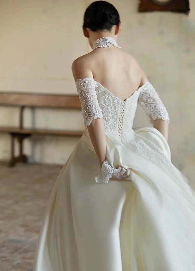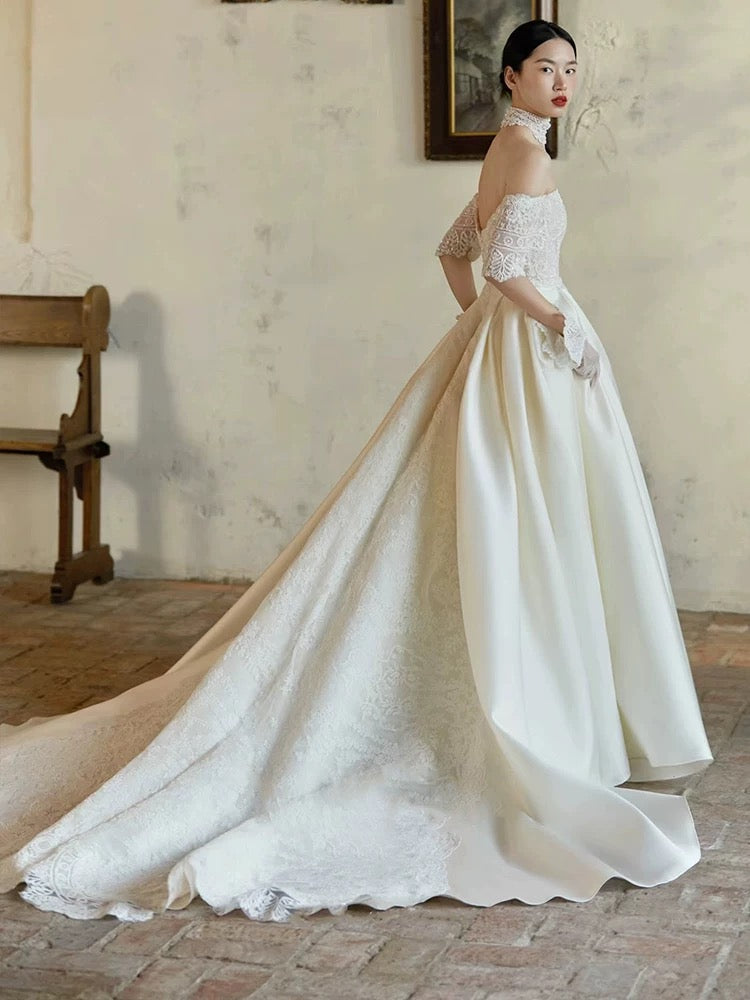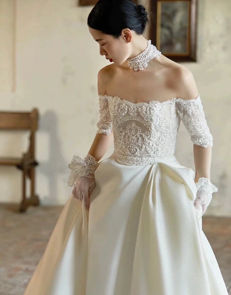 洗練された美しさが際立つ、オフショルダーのウェディングドレス。繊細なレース刺繍が施されたボディスは、ロイヤルな雰囲気を演出し、花嫁の魅力を最大限に引き出します。