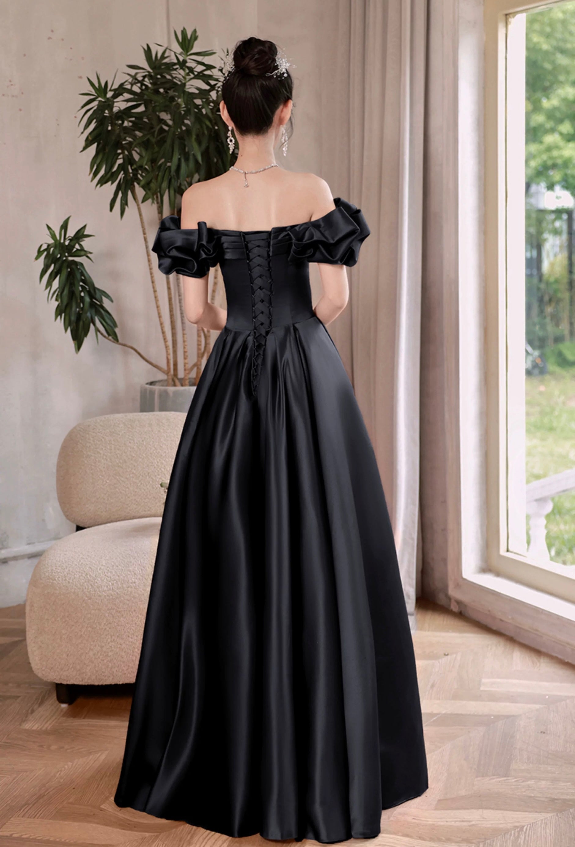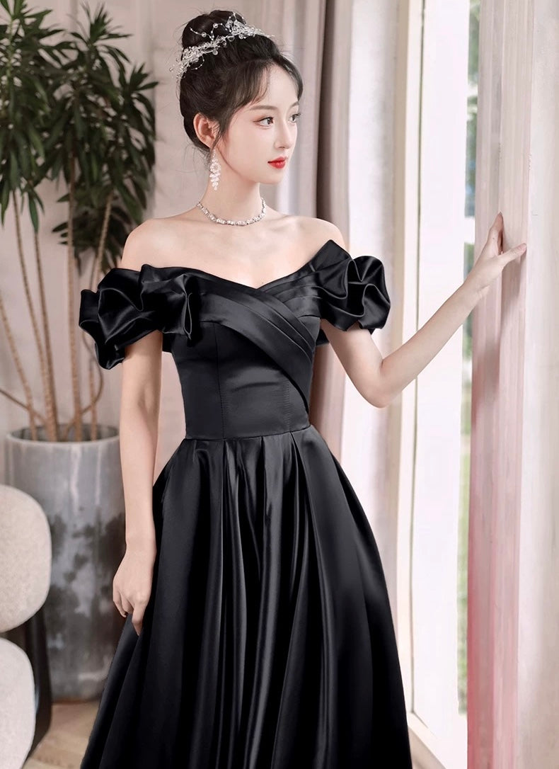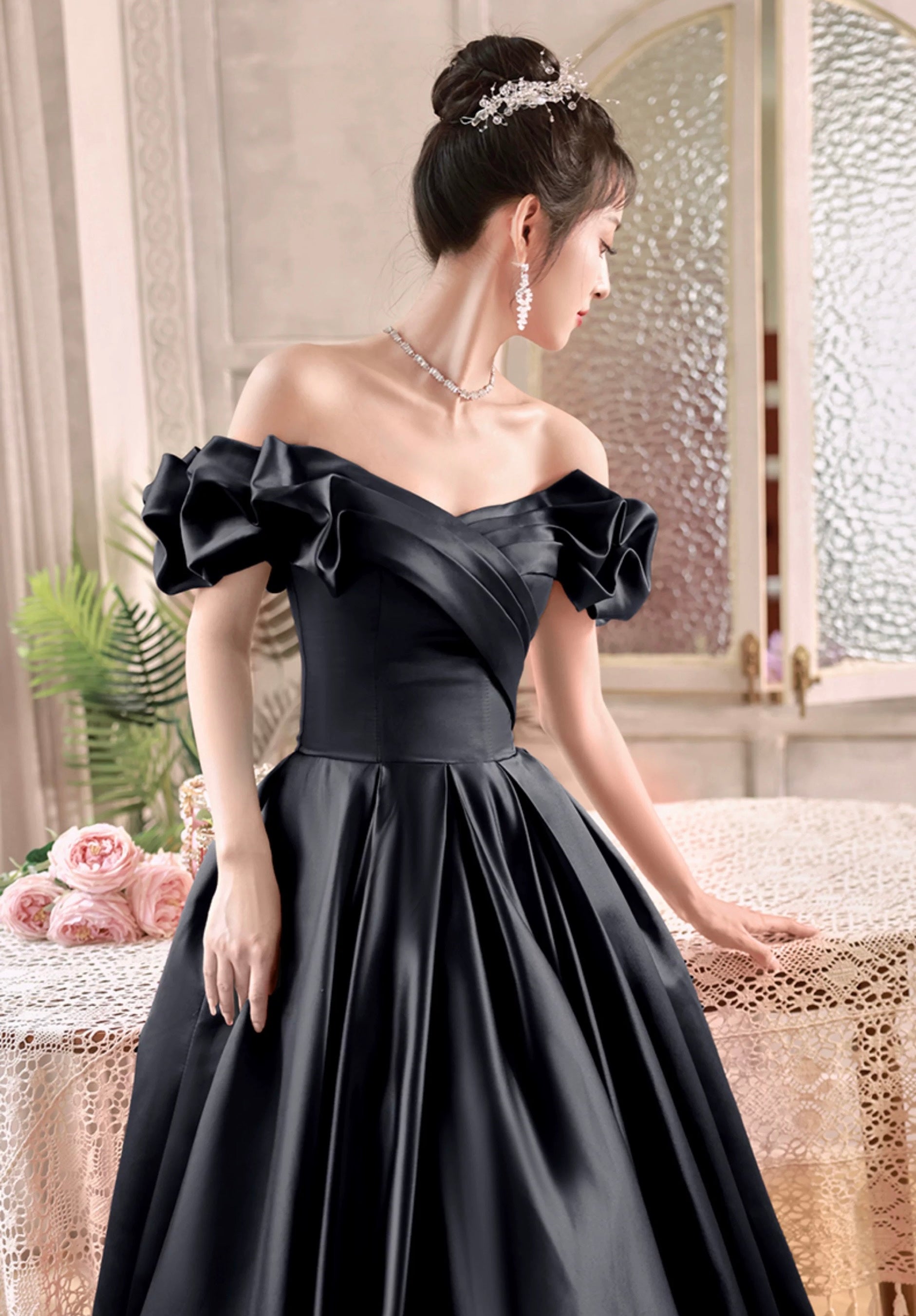 シックで洗練された印象を与える、美しいブラックのオフショルダードレス。立体的なフリルスリーブとクロスデザインのボディスが、華やかさとエレガンスを演出します。滑らかなサテン生地が贅沢な光沢を放ち、動くたびに上品なドレープを描くAラインシルエットが特徴。