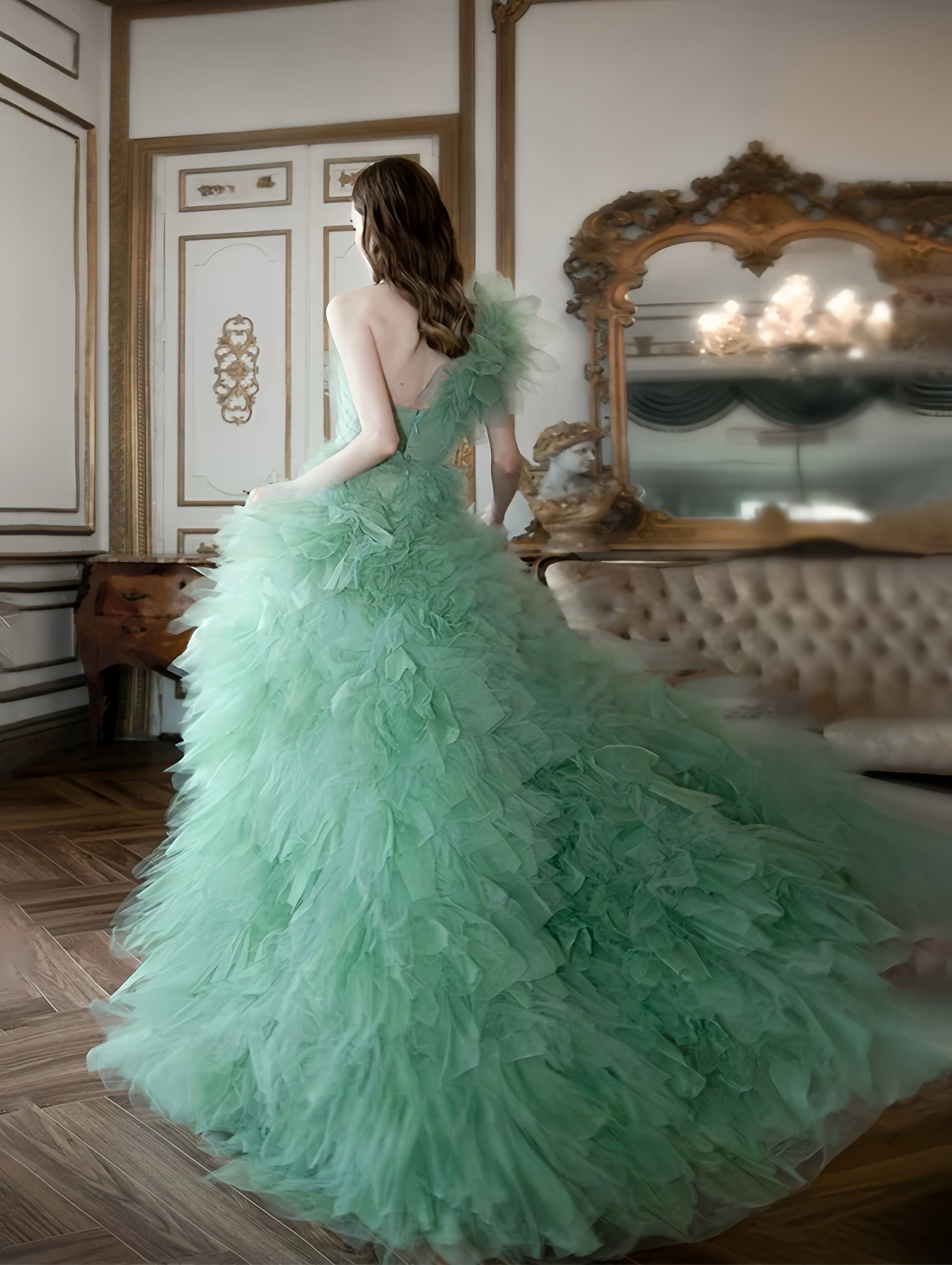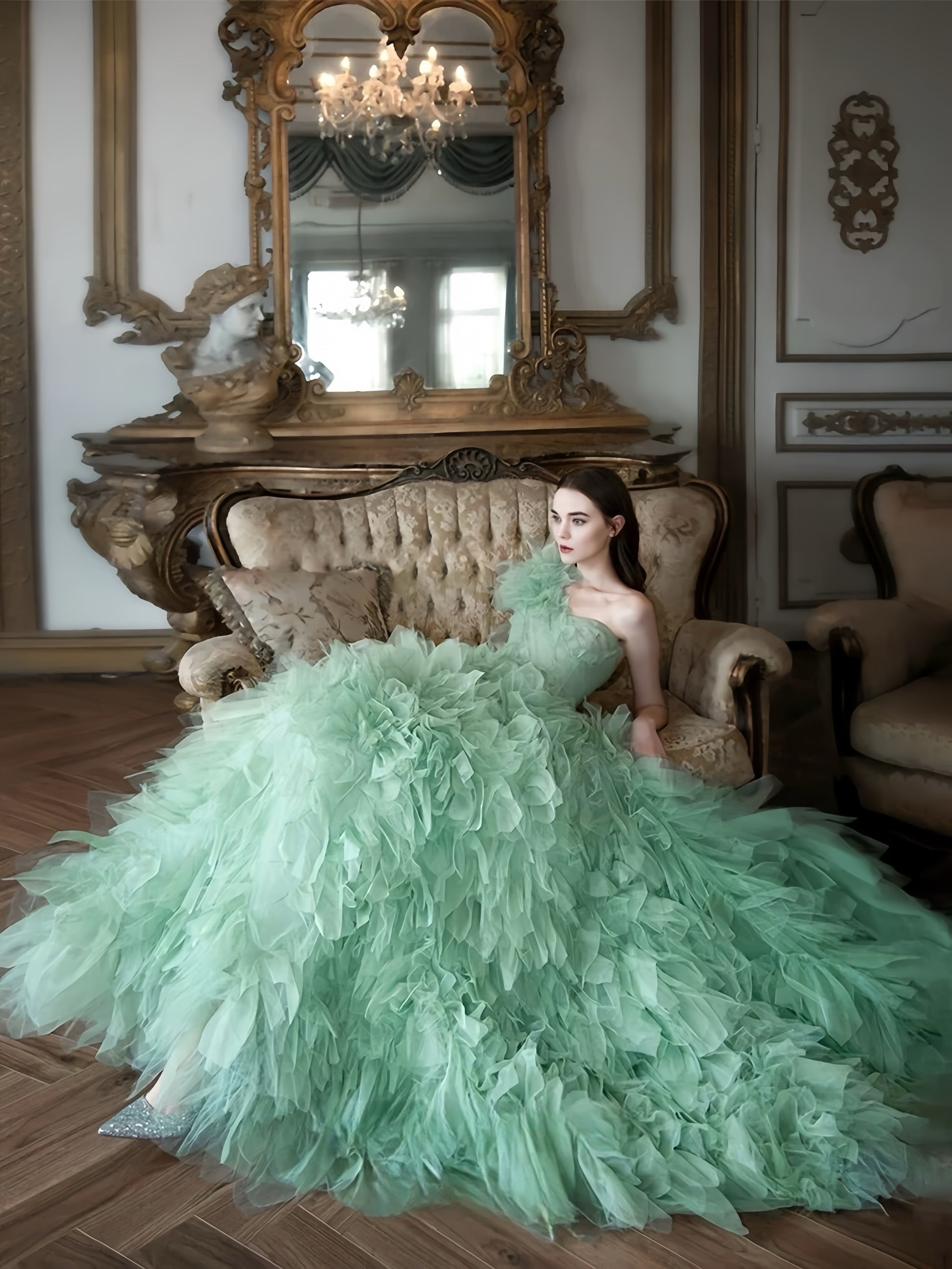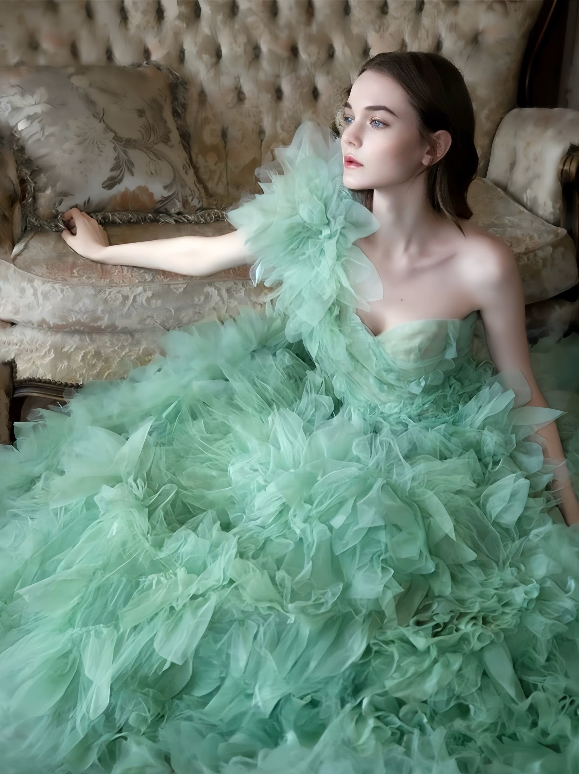 華やかで洗練されたデザインが特徴のワンショルダードレス。柔らかなミントグリーンのチュールが幾重にも重なり、まるで雲のような軽やかさを演出します。片肩のフリルがエレガントなアクセントとなり、ロイヤルな雰囲気を引き立てます。