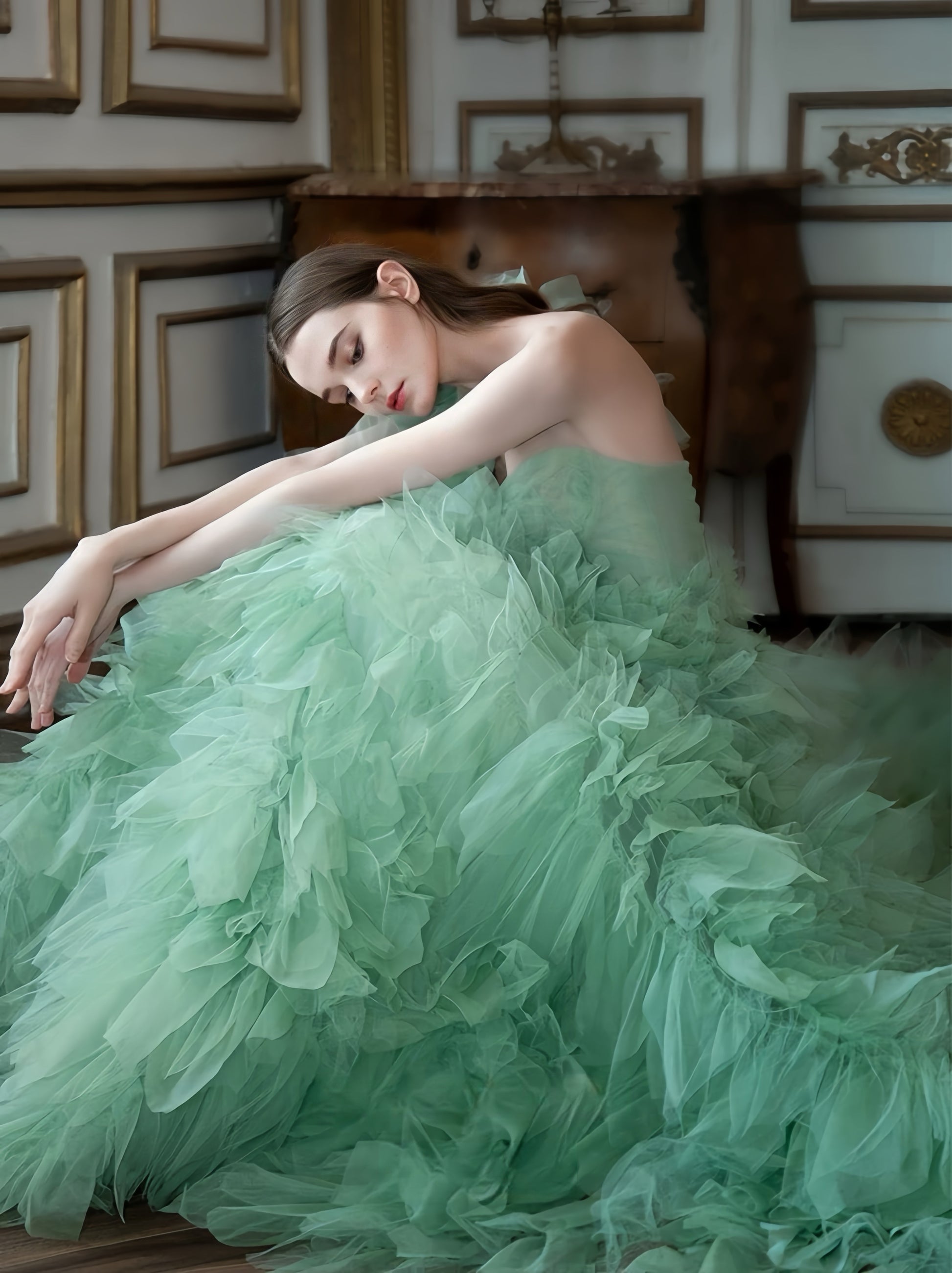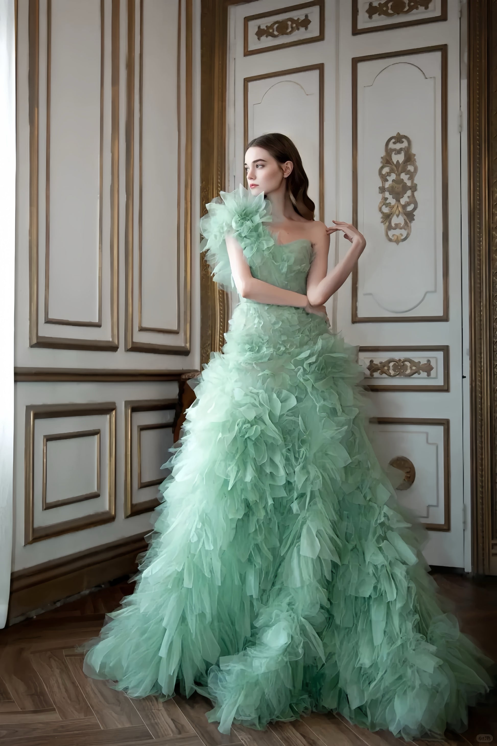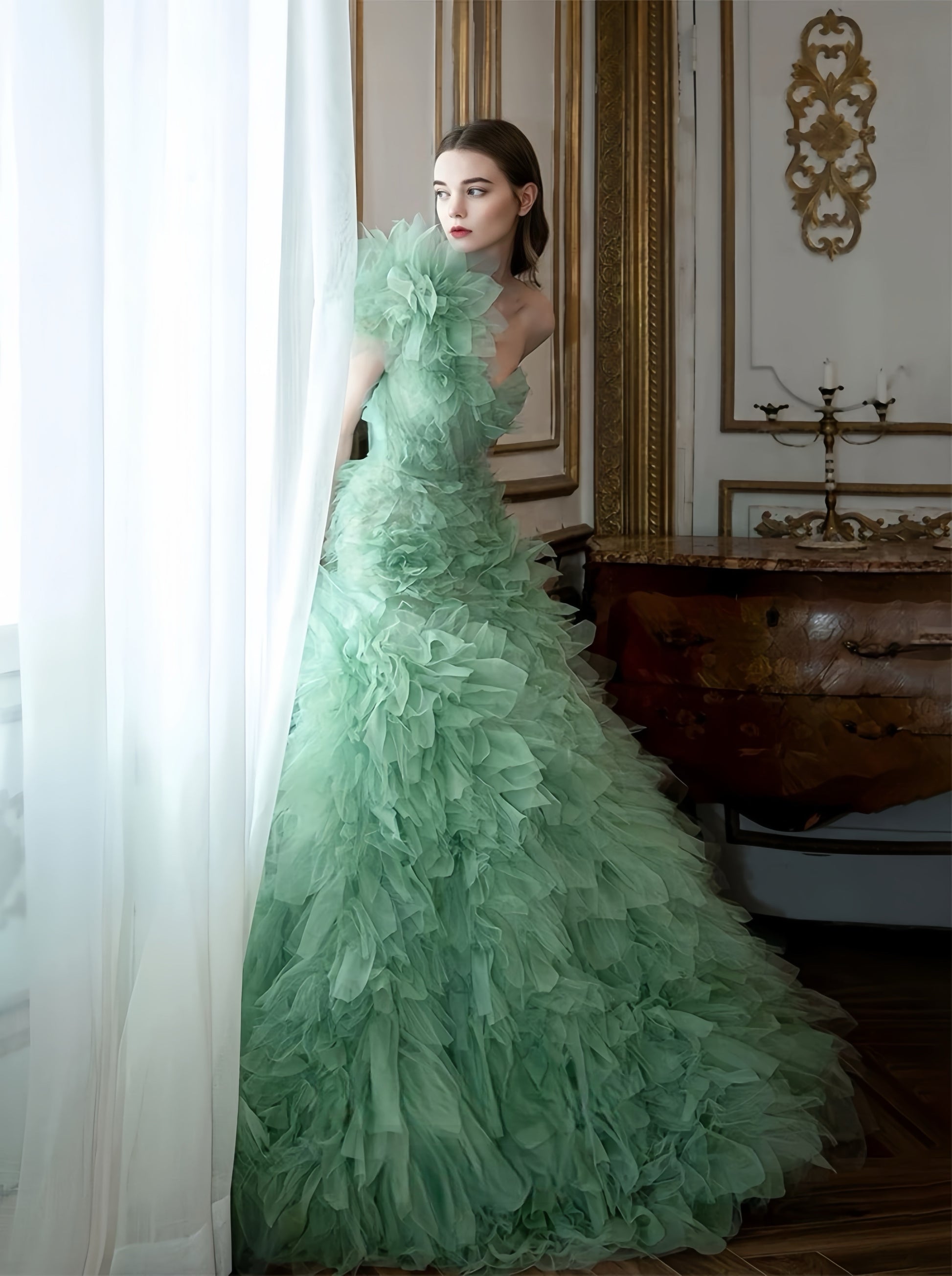 華やかで洗練されたデザインが特徴のワンショルダードレス。柔らかなミントグリーンのチュールが幾重にも重なり、まるで雲のような軽やかさを演出します。片肩のフリルがエレガントなアクセントとなり、ロイヤルな雰囲気を引き立てます。