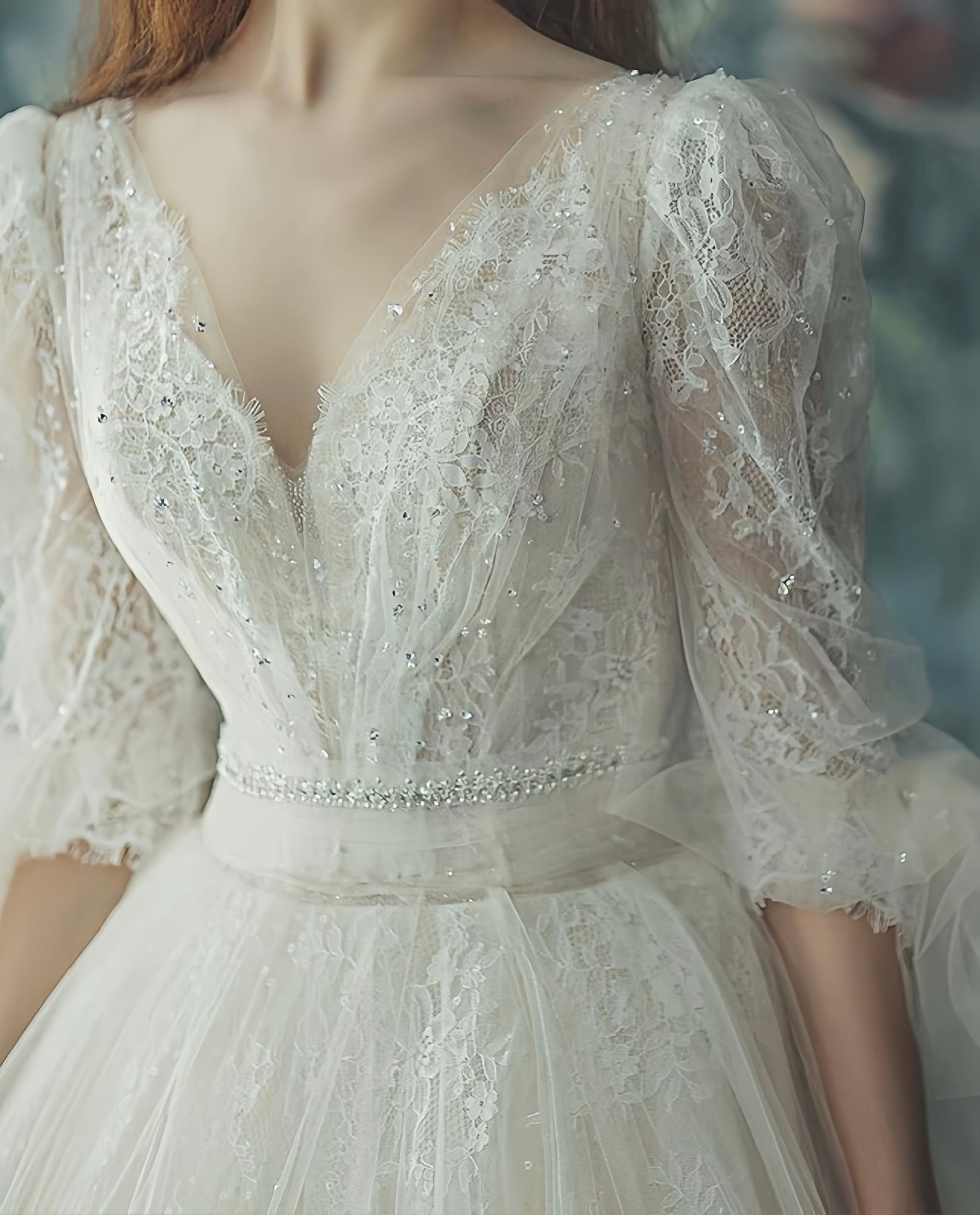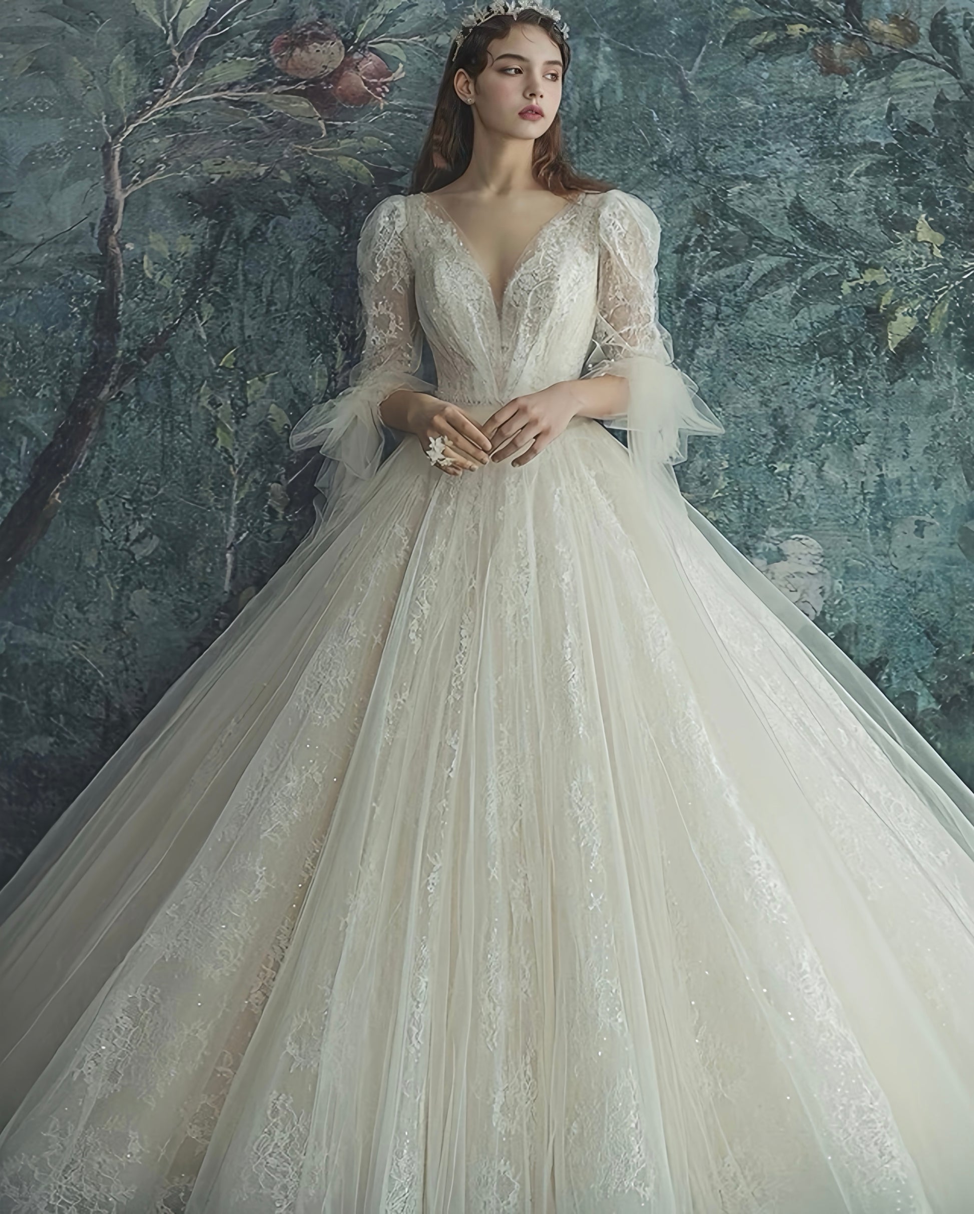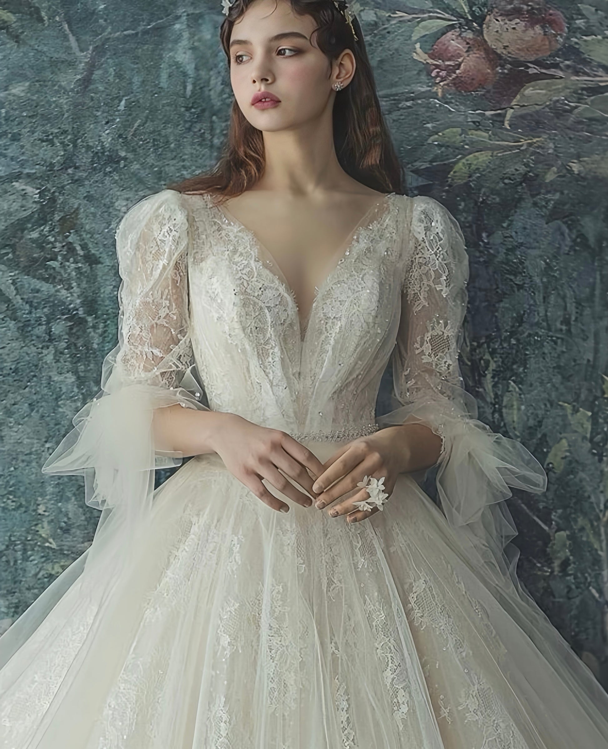 繊細なレースとふんわりと広がるチュールが美しいAラインシルエットのウェディングドレス。深めのVネックがデコルテを優雅に引き立て、上品な透け感のあるパフスリーブがクラシカルでロマンティックな雰囲気を演出します。スカートには繊細な刺繍が施され、動くたびに上品な輝きを放ちます。まるで絵画の中から抜け出したような美しさを叶える一着です。