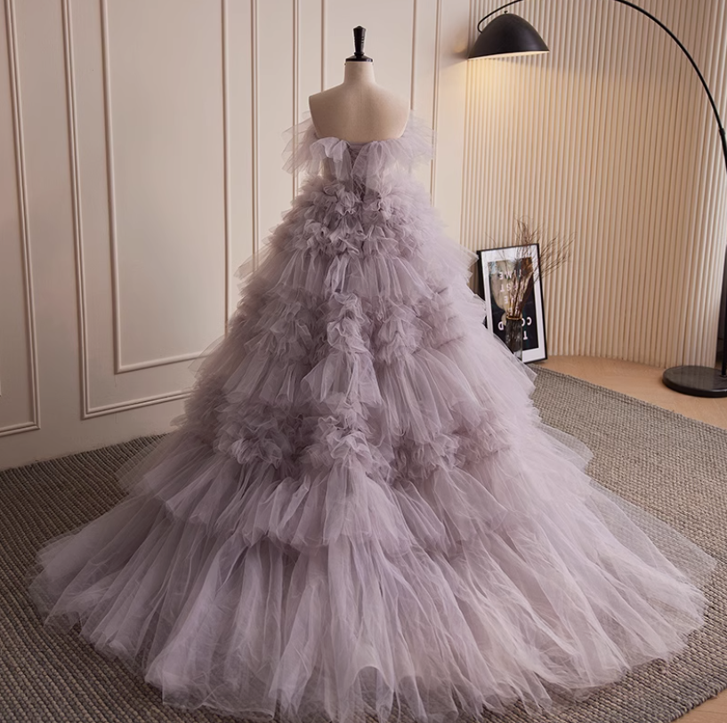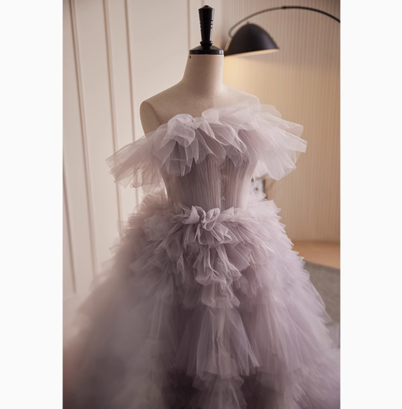 上半身はシンプルなコルセットスタイルで、肩のフリルがロマンティックな雰囲気を添えています。複数のティアードスカートが華やかでありながらも、落ち着いたカラーが上品さを引き立てる一着