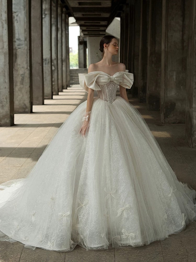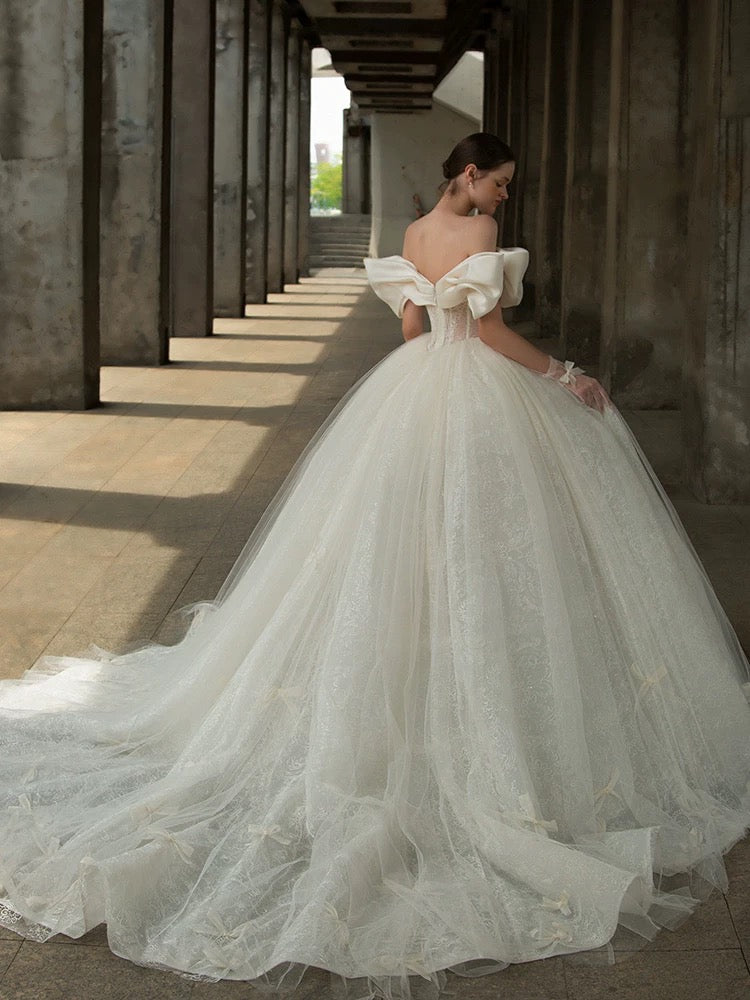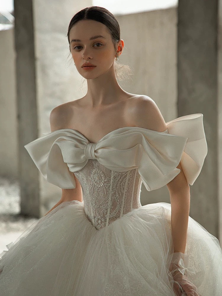 華やかさと気品を兼ね備えた、ボリューム感たっぷりのプリンセスラインドレス。オフショルダー部分に施された大きなリボンデザインが目を引き、花嫁様の可憐さを一層引き立てます。繊細なレースが全体に施され、スカート部分には小さなリボンのアクセントが愛らしさをプラス。トレーンが優雅に広がり、後ろ姿も完璧です。