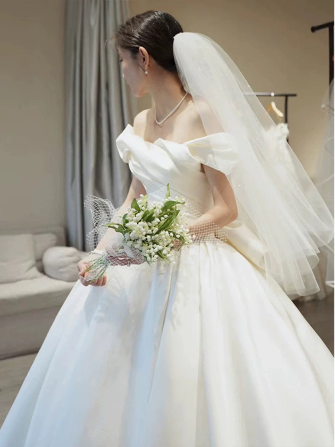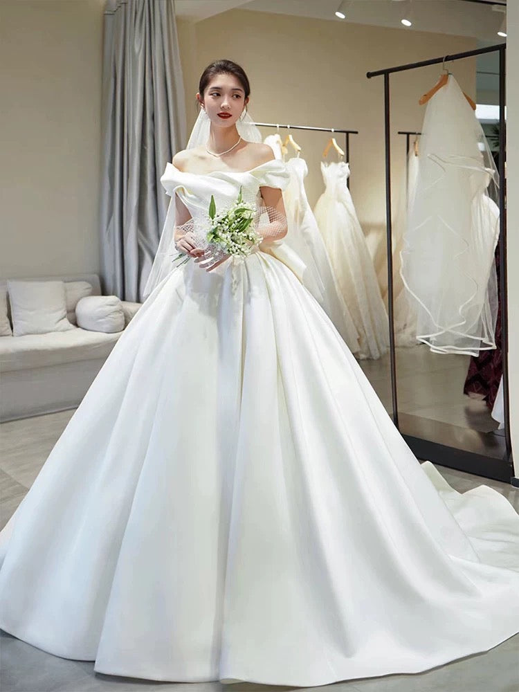 高級感のあるサテン生地が花嫁の美しさをより際立たせ、タイムレスな魅力を持つドレスです。