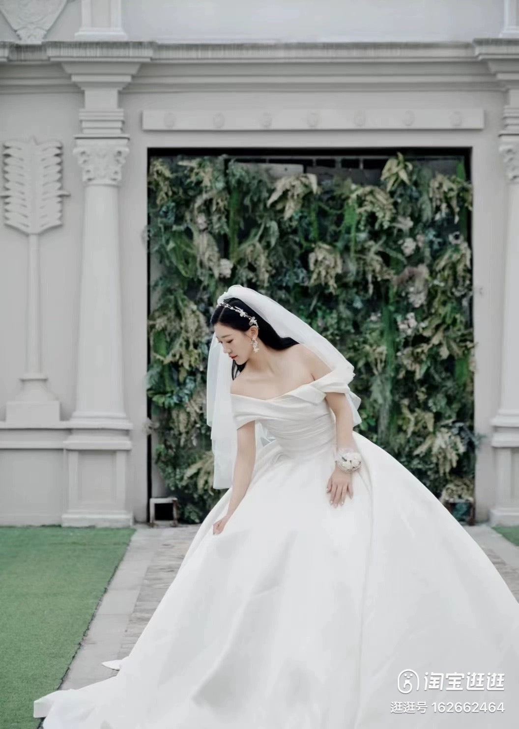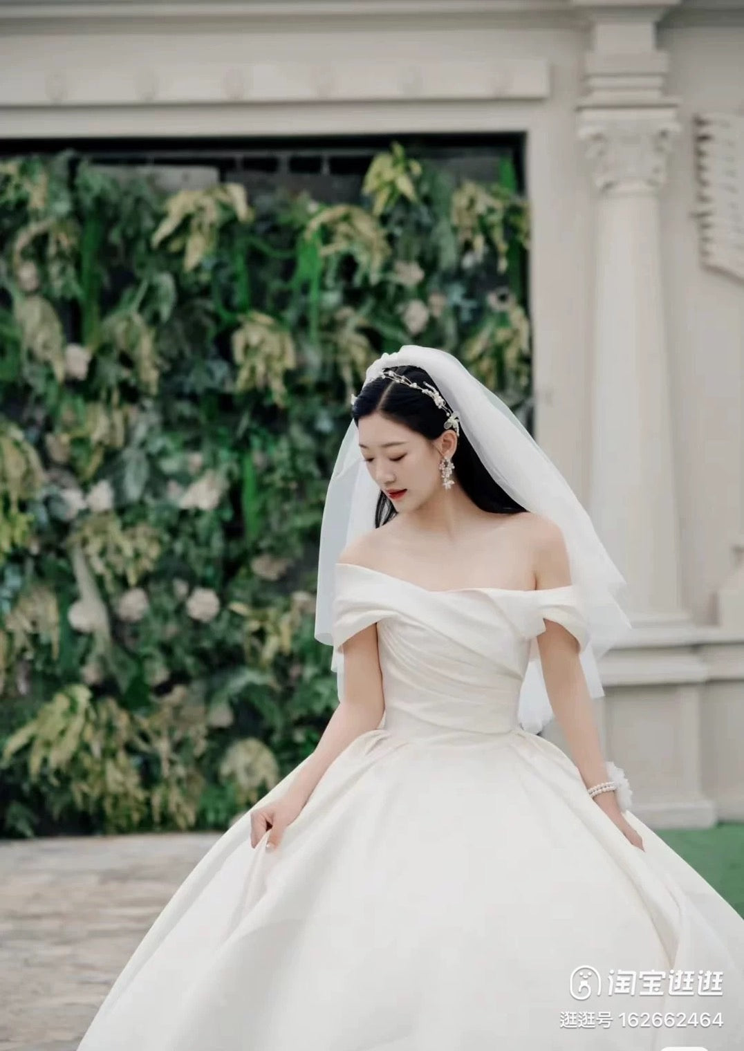 オフショルダーのデザインがデコルテラインを優雅に引き立て、大きく広がるボリューム感のあるスカートがクラシカルでエレガントな雰囲気を演出します。