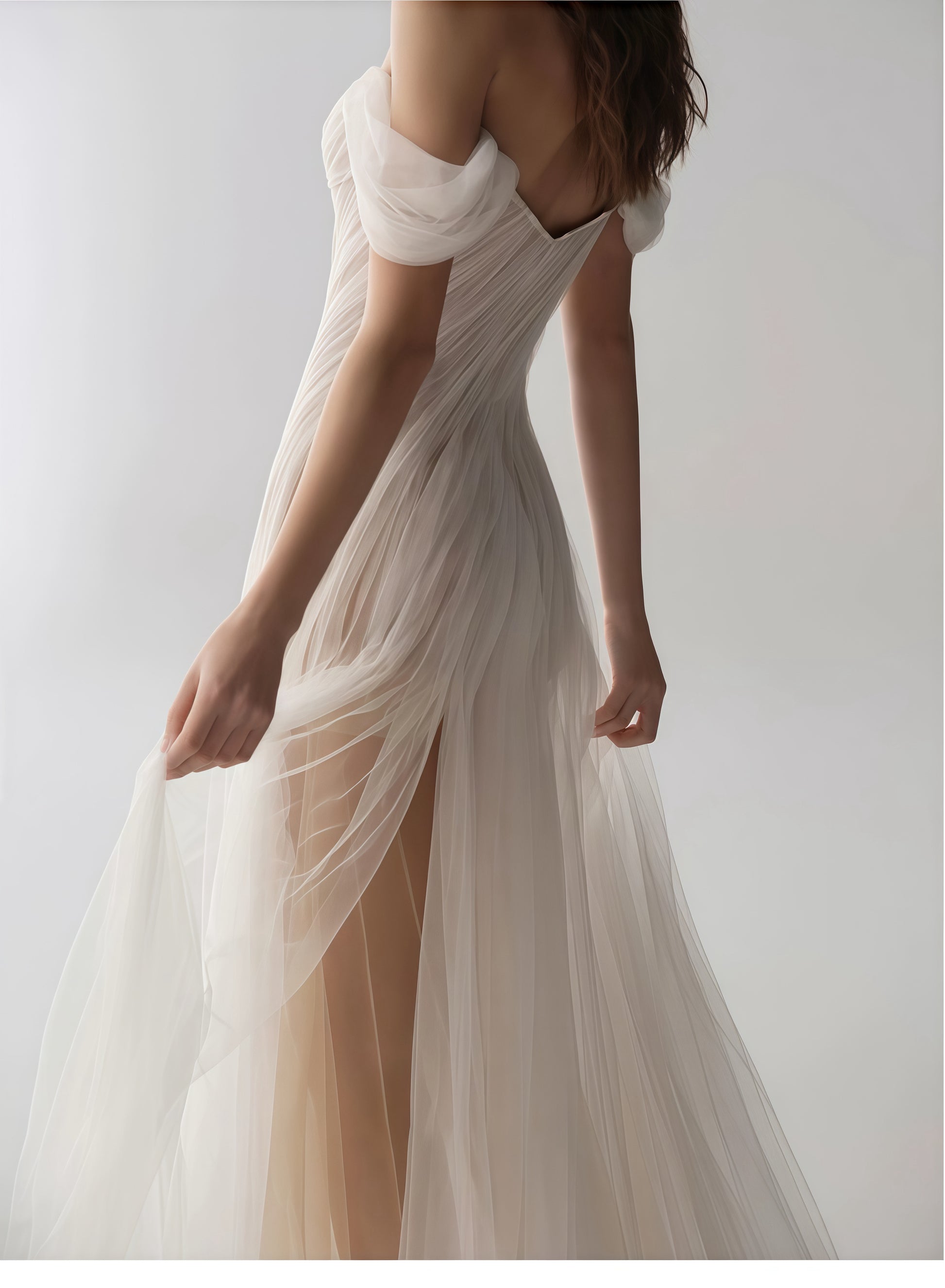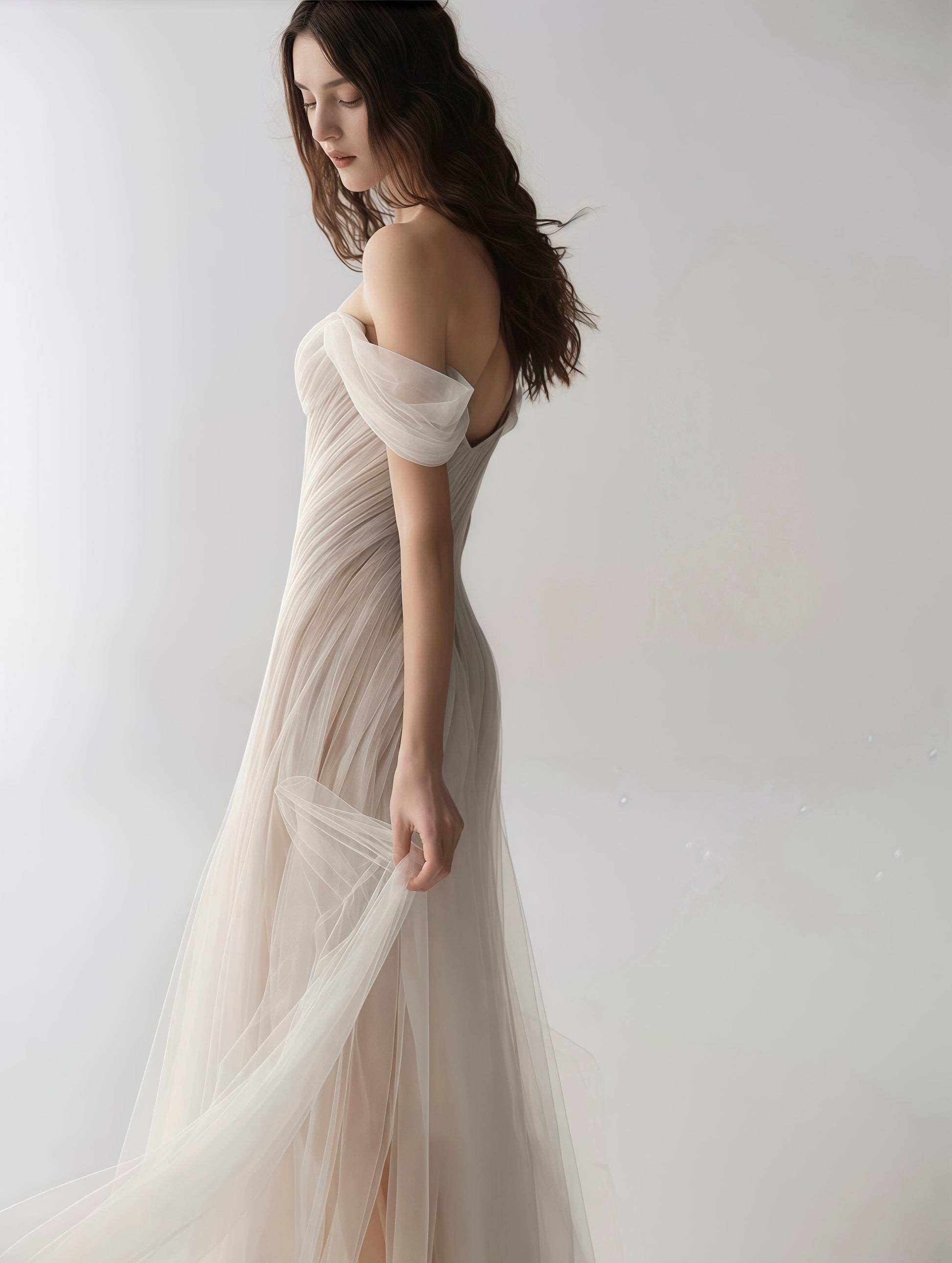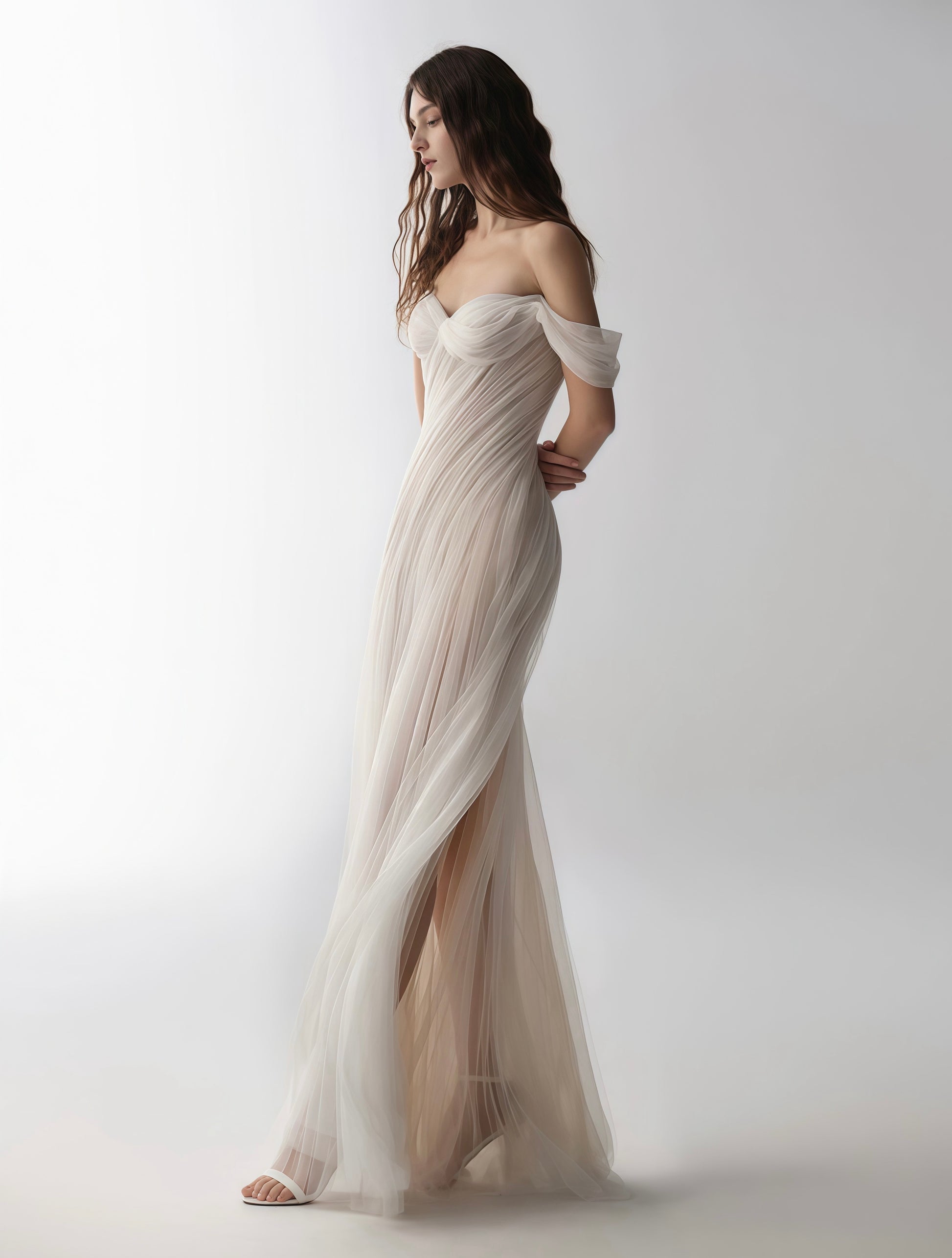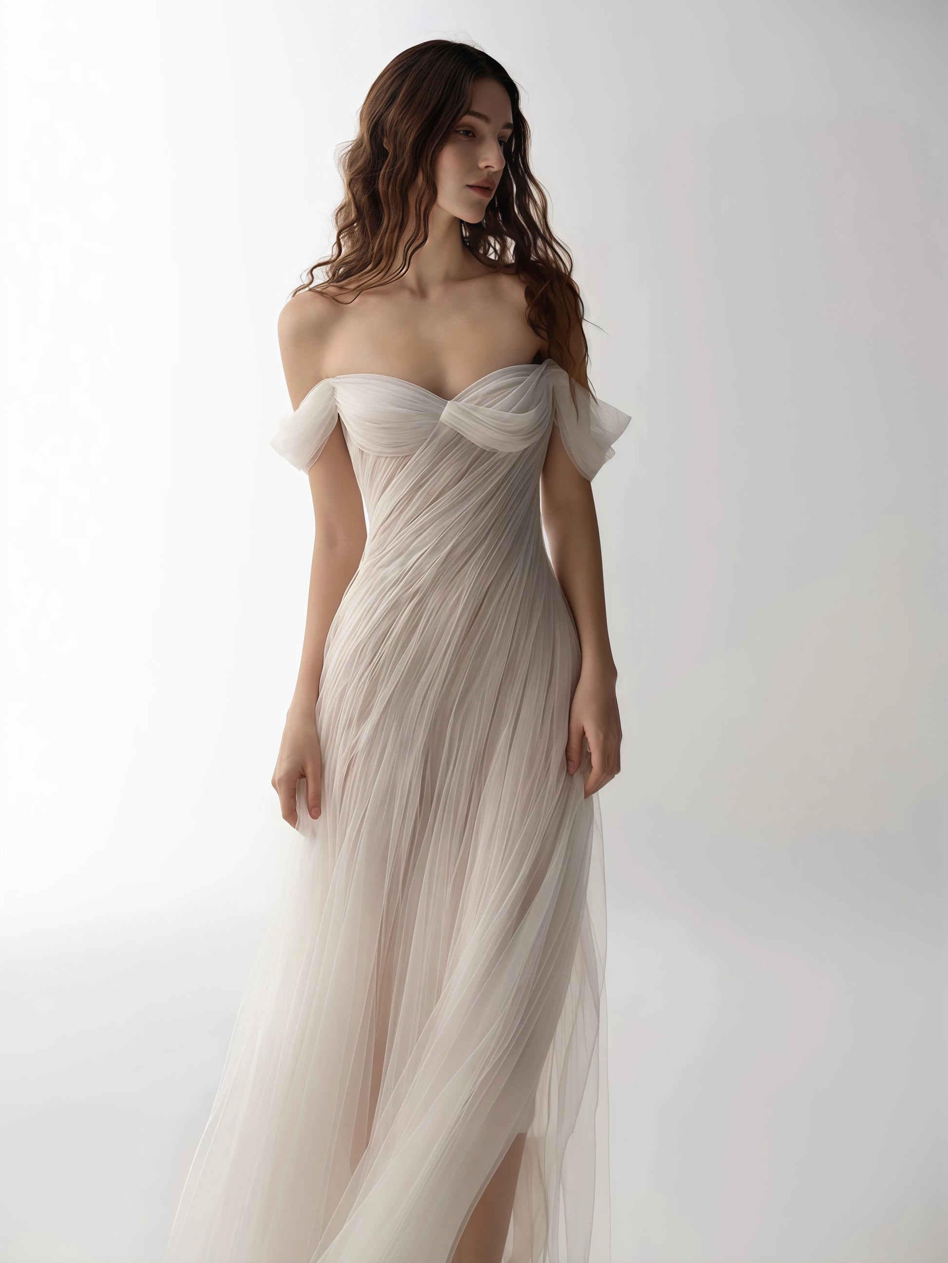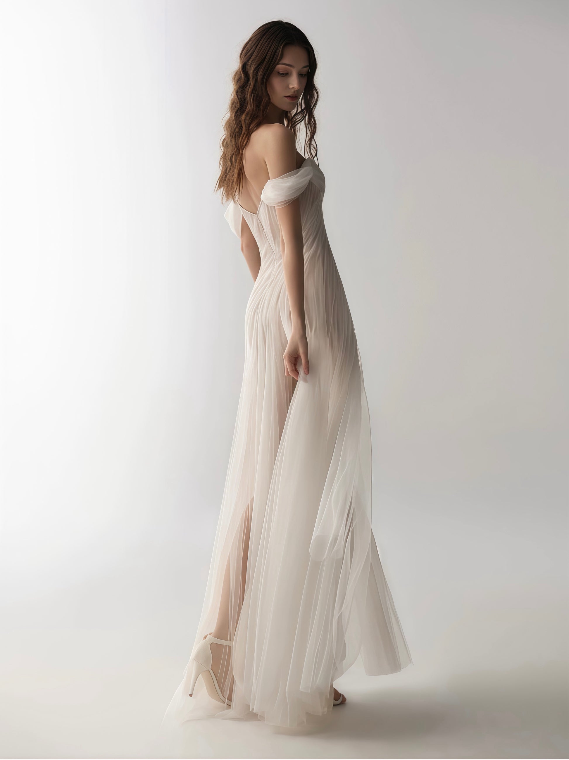 ナチュラルな魅力とフェミニンなシルエットが融合した、エレガントなウェディングドレス。繊細なドレープが施されたオフショルダーデザインが、肩元を美しく引き立て、洗練された印象を与えます。
