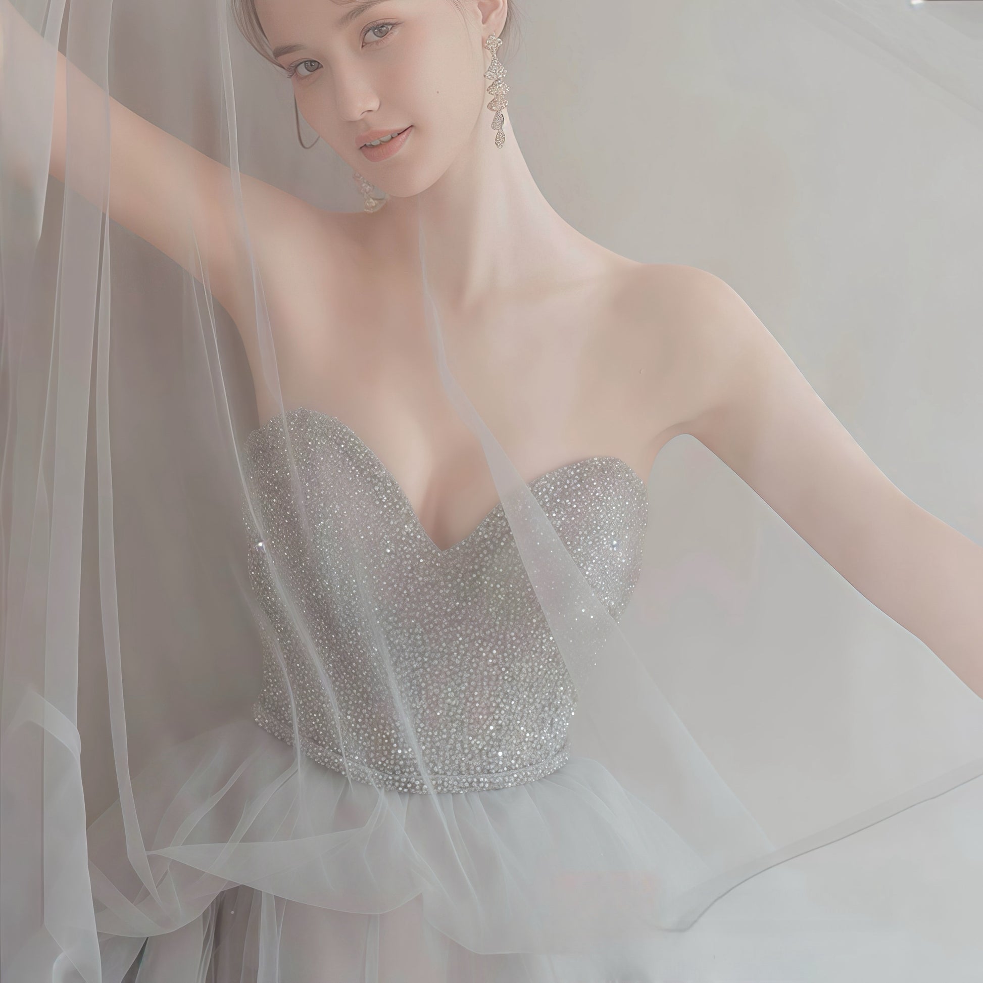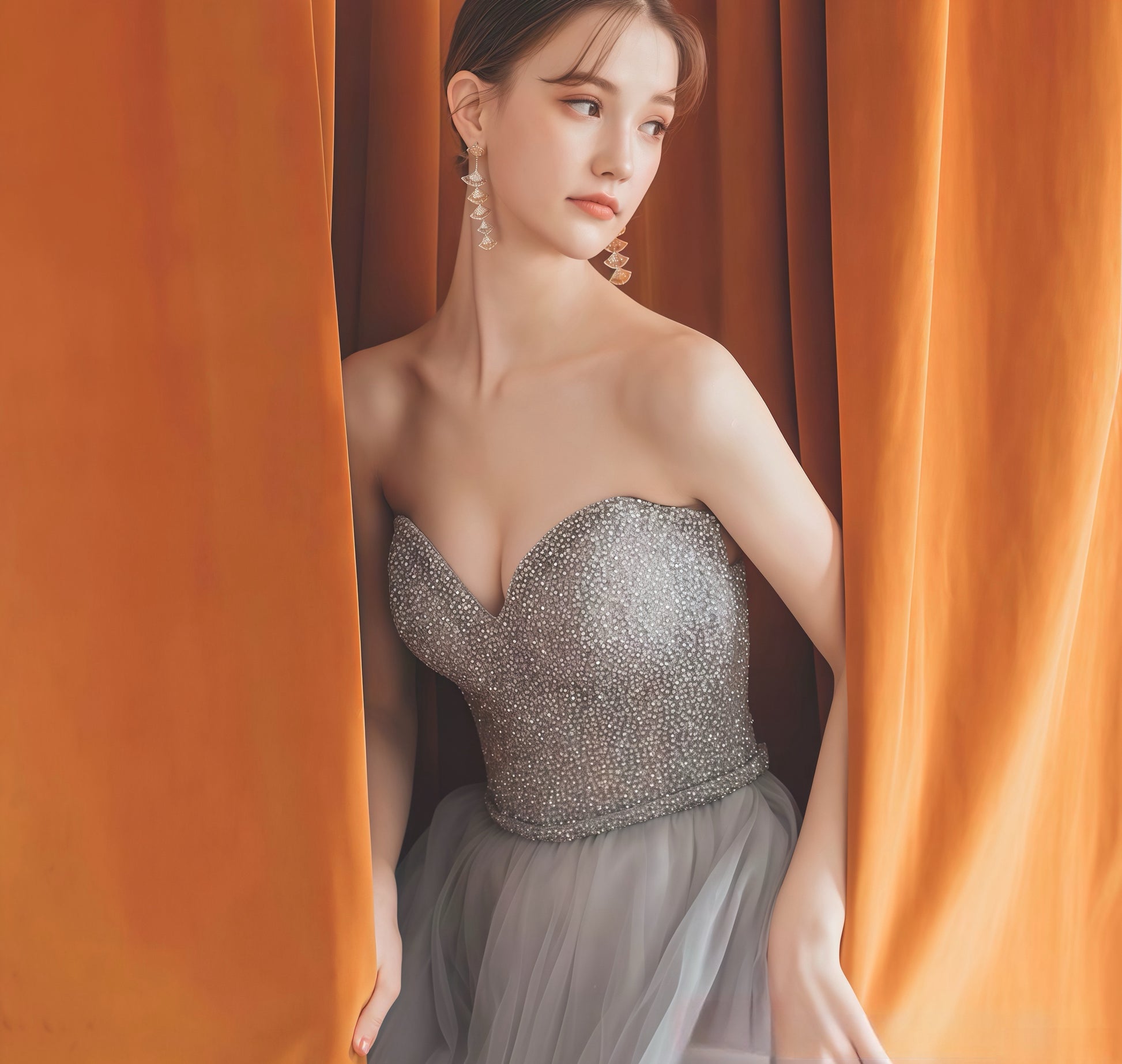 柔らかなピンクトーンのドレスは、軽やかなチュール素材で仕立てられた優美なデザインが特徴です。オフショルダーのトップスが肩のラインを美しく際立たせ、フェミニンさと洗練さを兼ね備えたシルエットを演出します。ボリュームたっぷりのスカートは、繊細なフリルが幾重にも重なり、動くたびにドラマチックな表情を見せます。