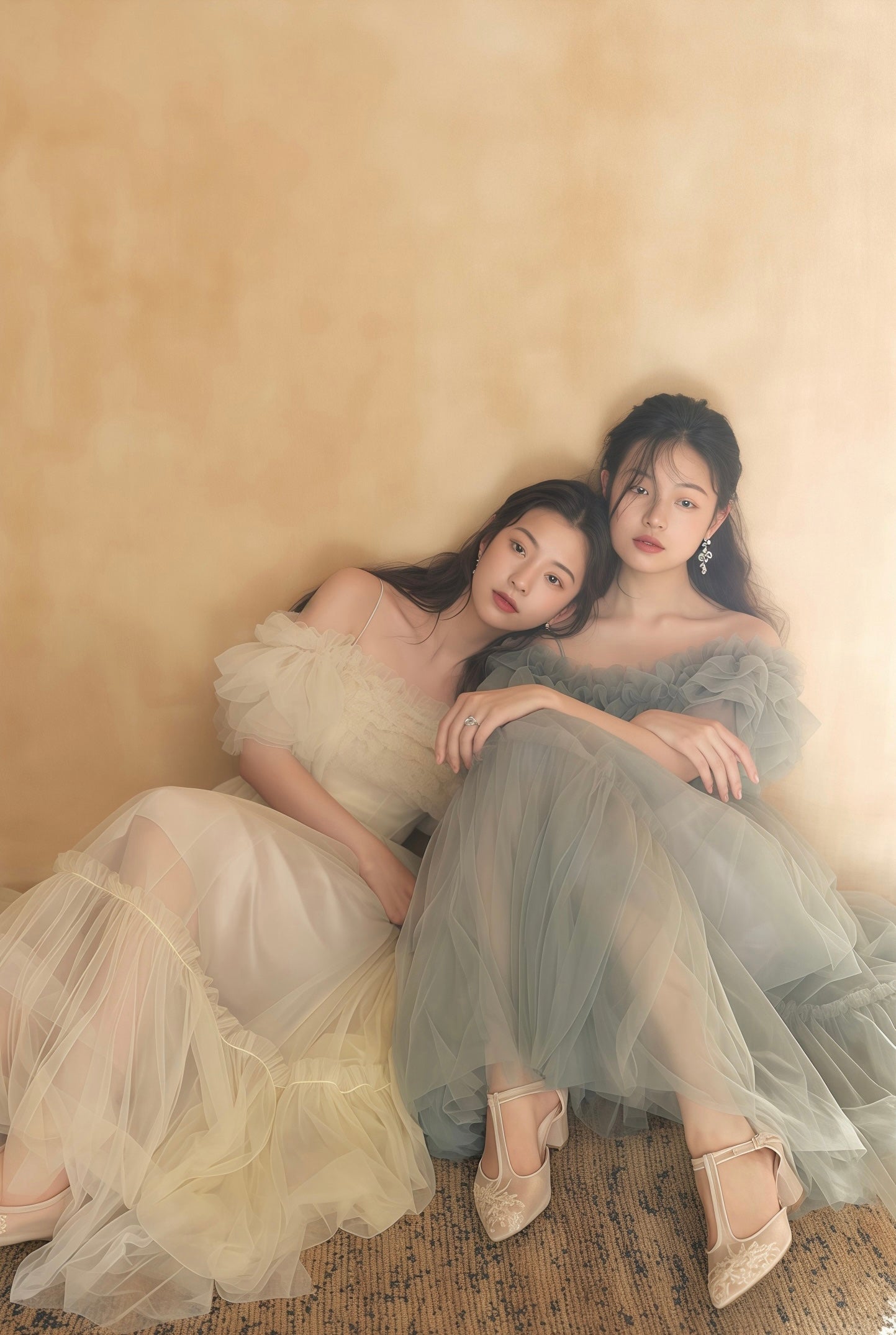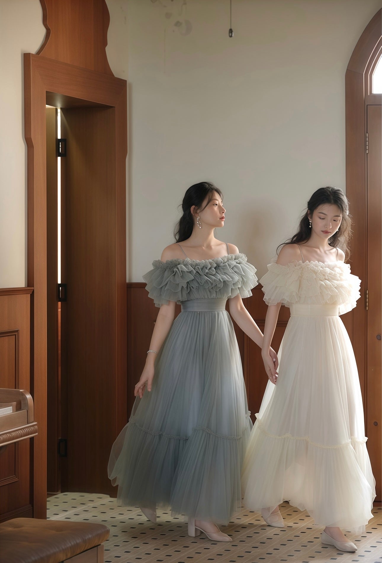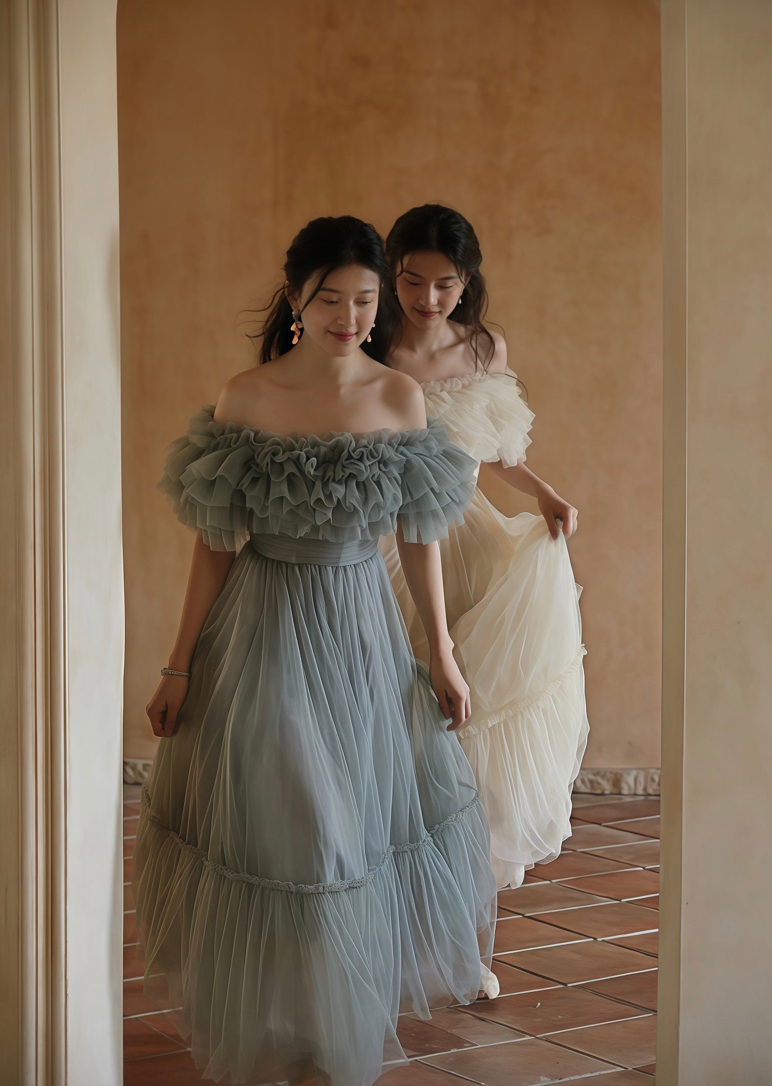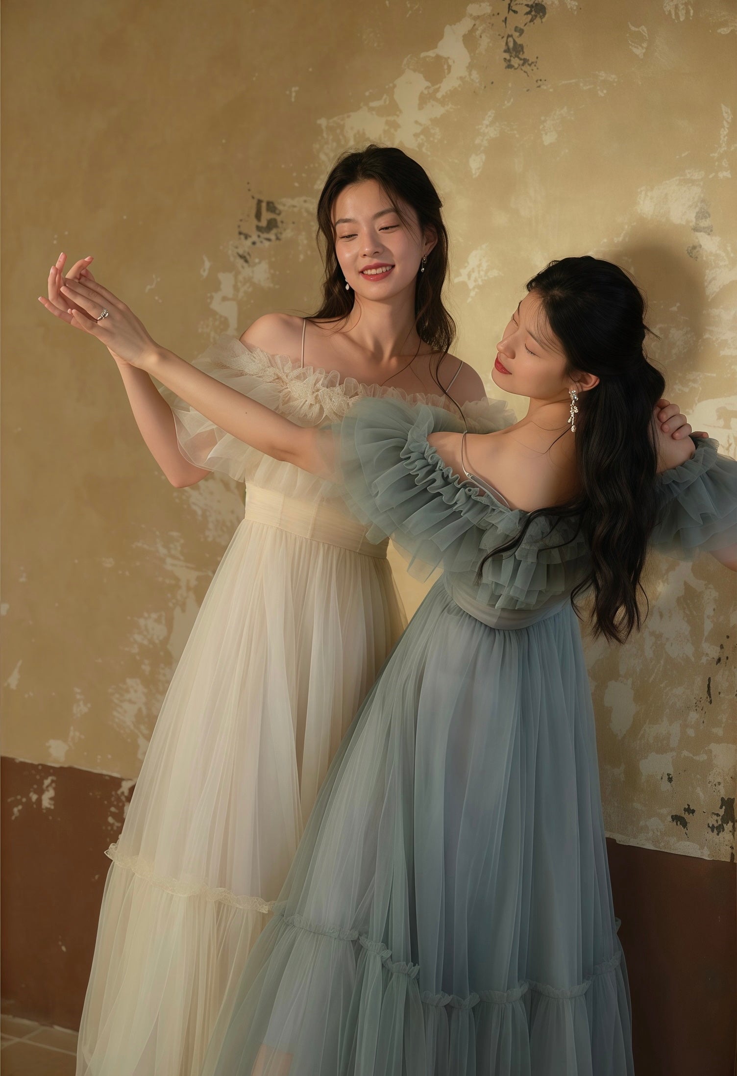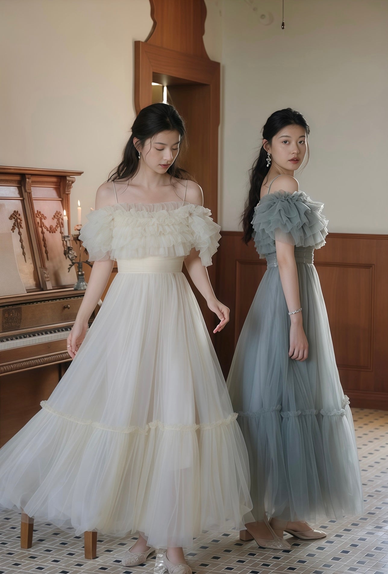 フルレングスのスカート部分は、軽やかに揺れるチュールが歩くたびに優雅な動きを見せ、特別な日の装いにぴったりです。パーティーや結婚式、写真撮影など、どんなシーンでも注目を集めること間違いなしの一着です。