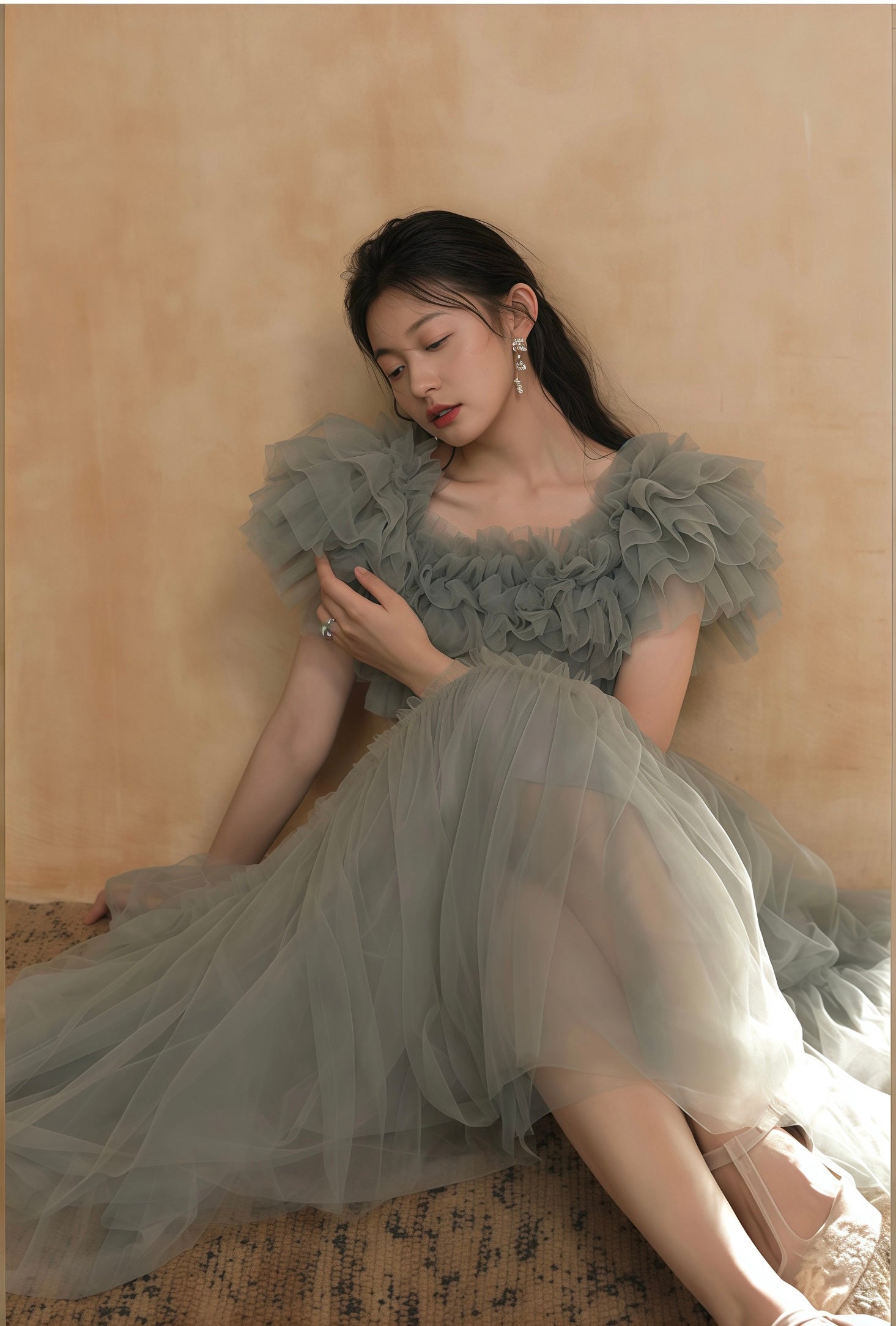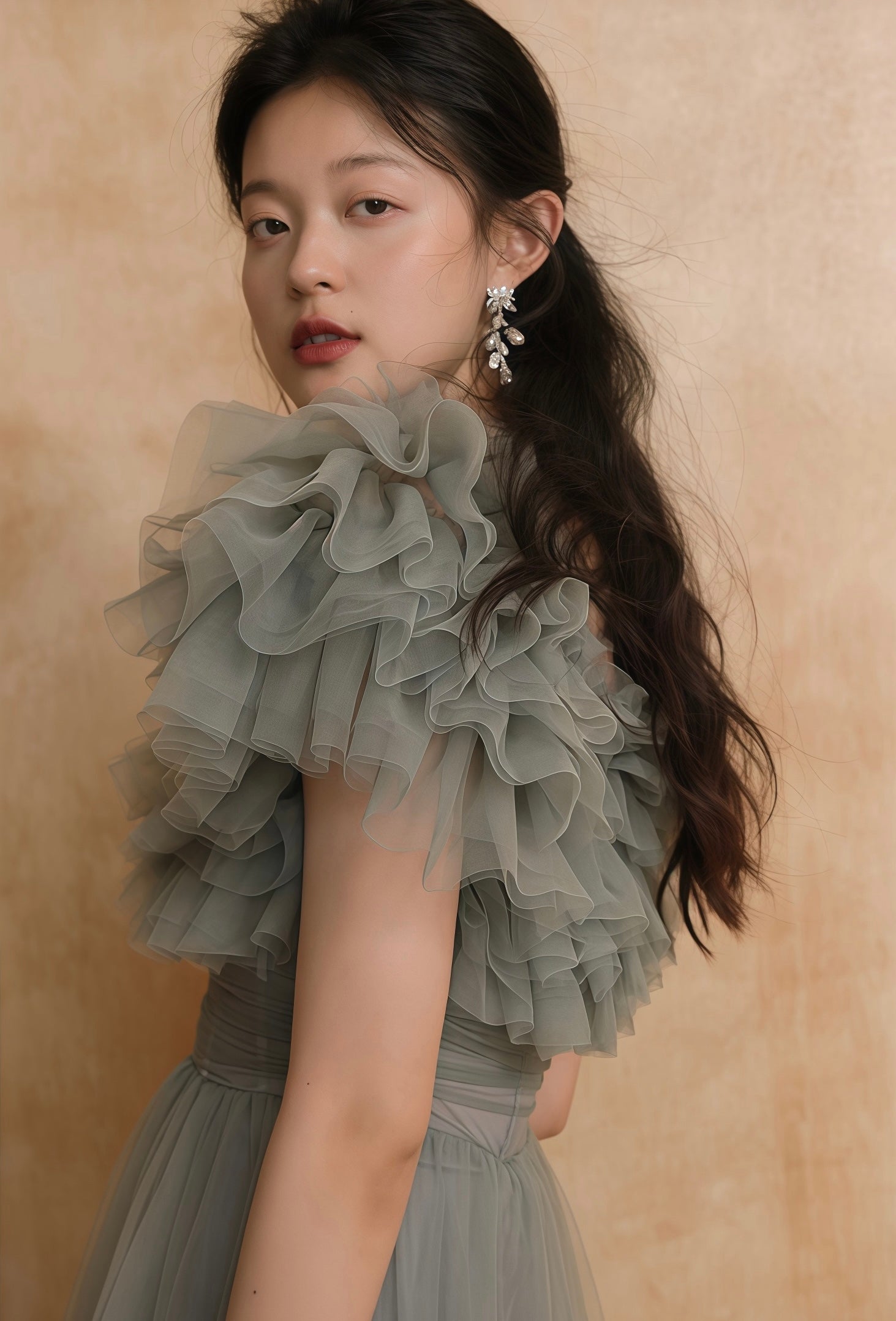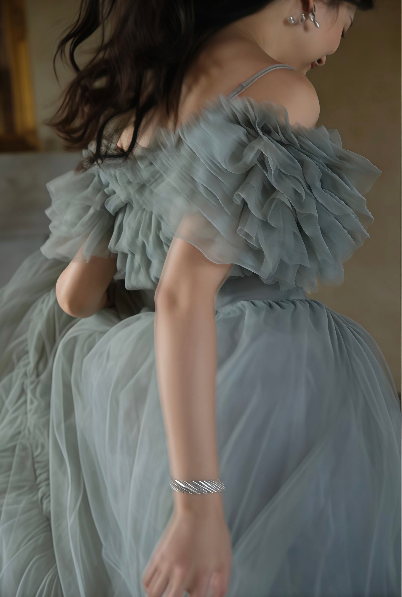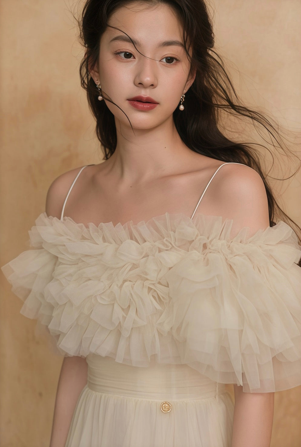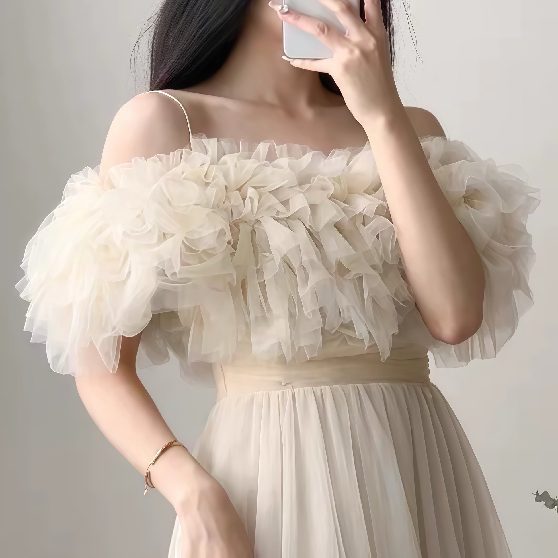 エレガントなチュール素材で仕立てられたオフショルダードレスです。幾層にも重ねられたフリルが肩元を美しく彩り、柔らかなボリューム感を演出します。ウエストはフィット感のあるデザインで、女性らしいシルエットを際立たせます。
