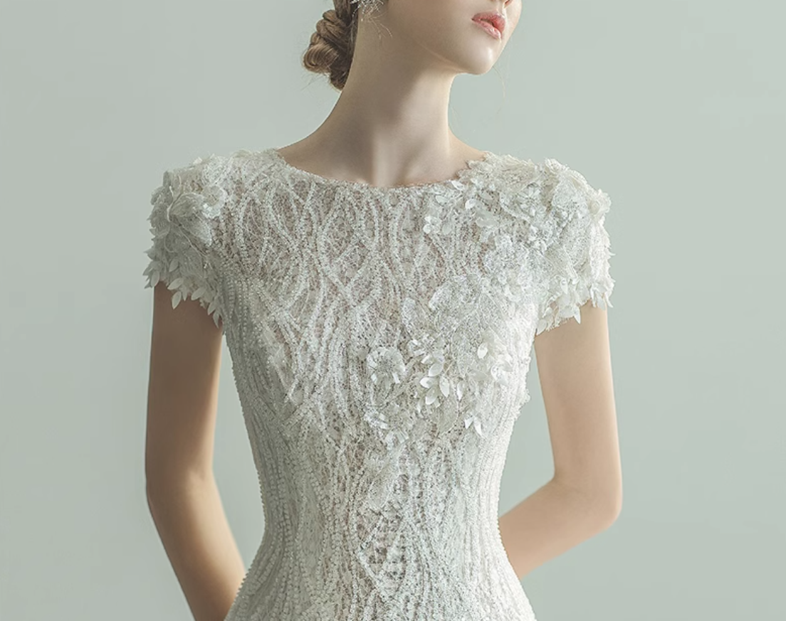 繊細なレースが全体に施され、上品で高級感のあるデザインが特徴です。肩から袖までのディテールが控えめながらも華やかさを演出し、ボディラインを美しく引き立てます。