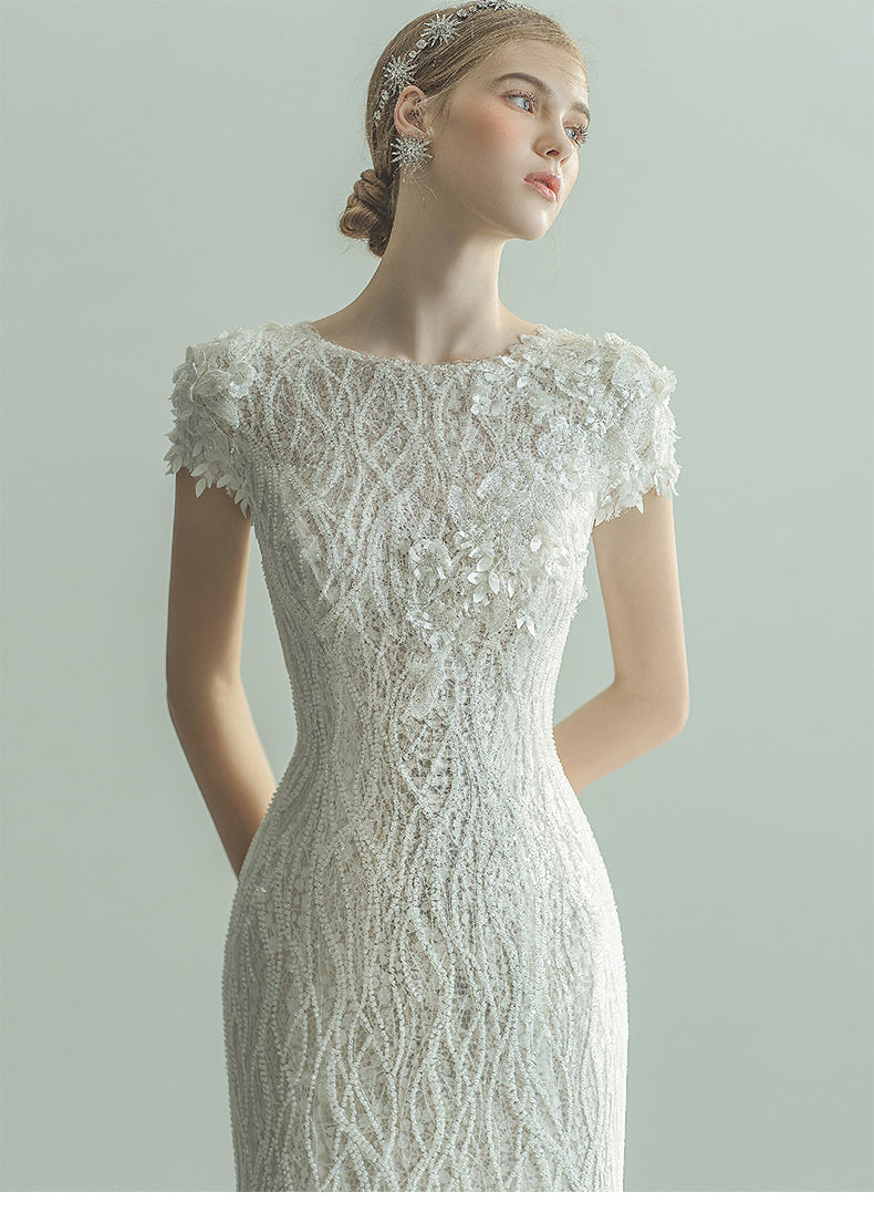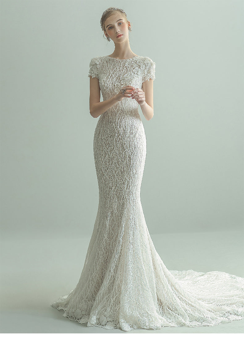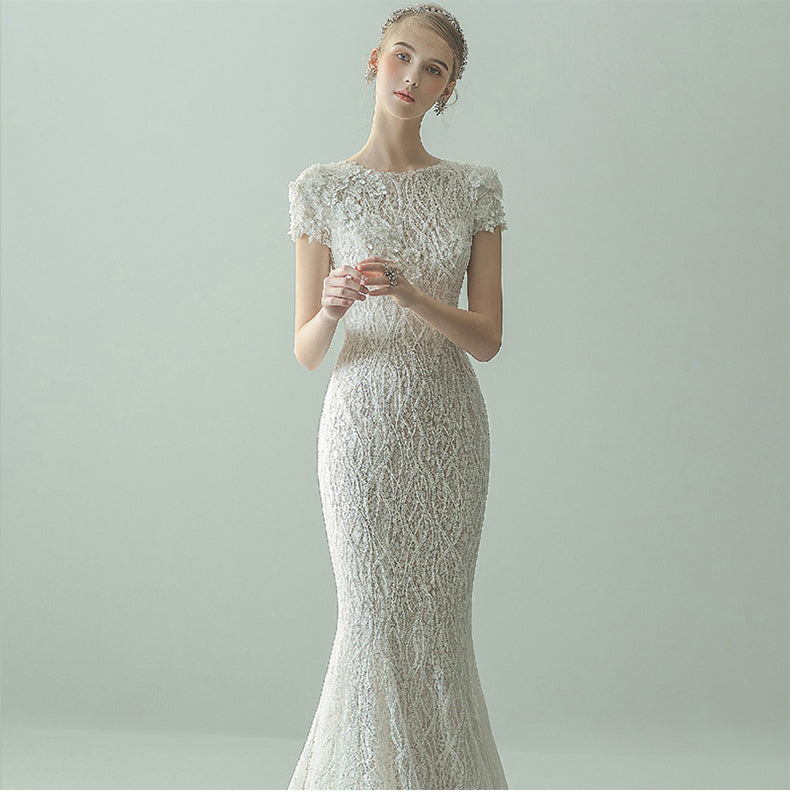 エレガントで洗練されたマーメイドシルエットのウェディングドレスです。