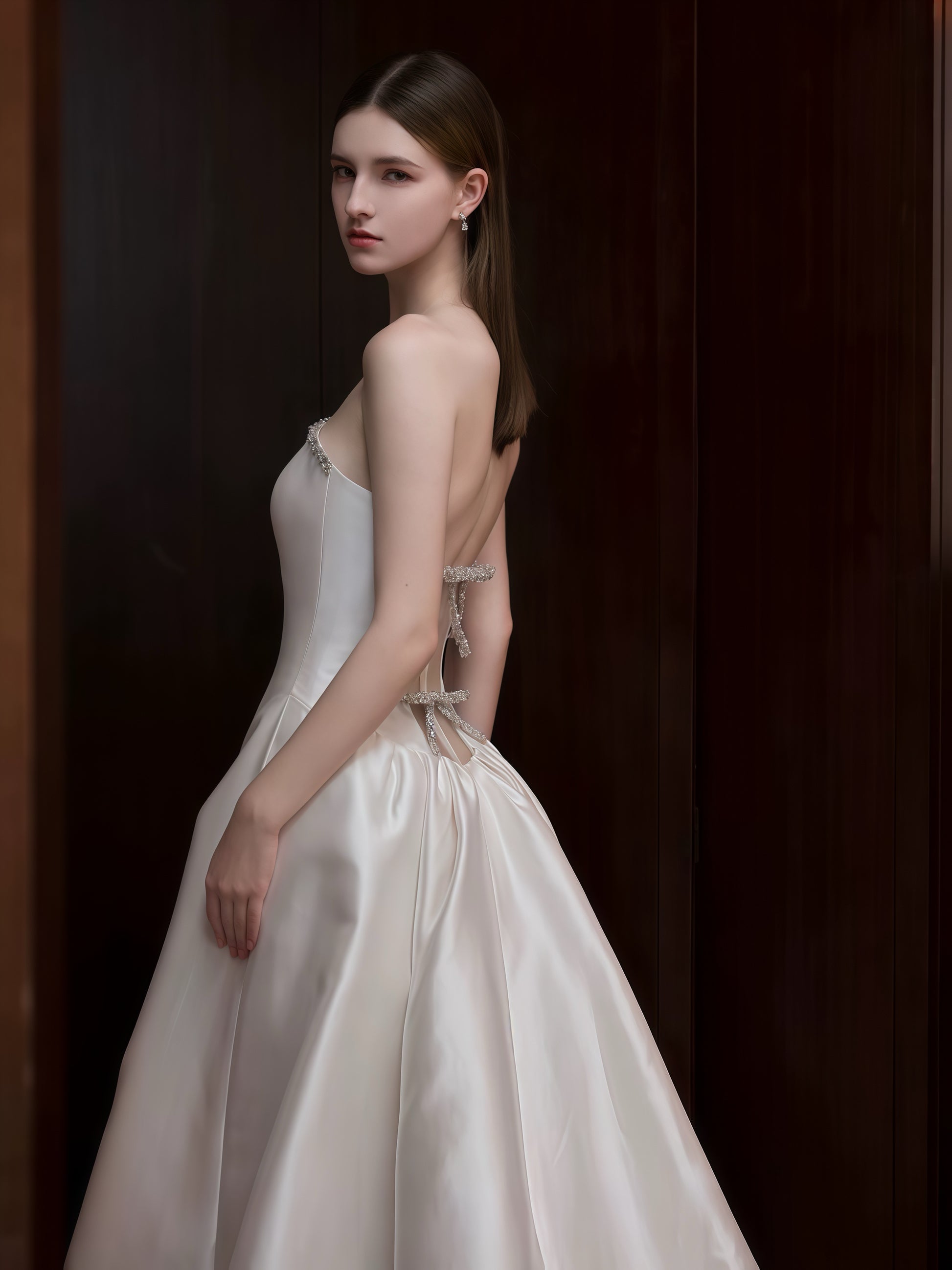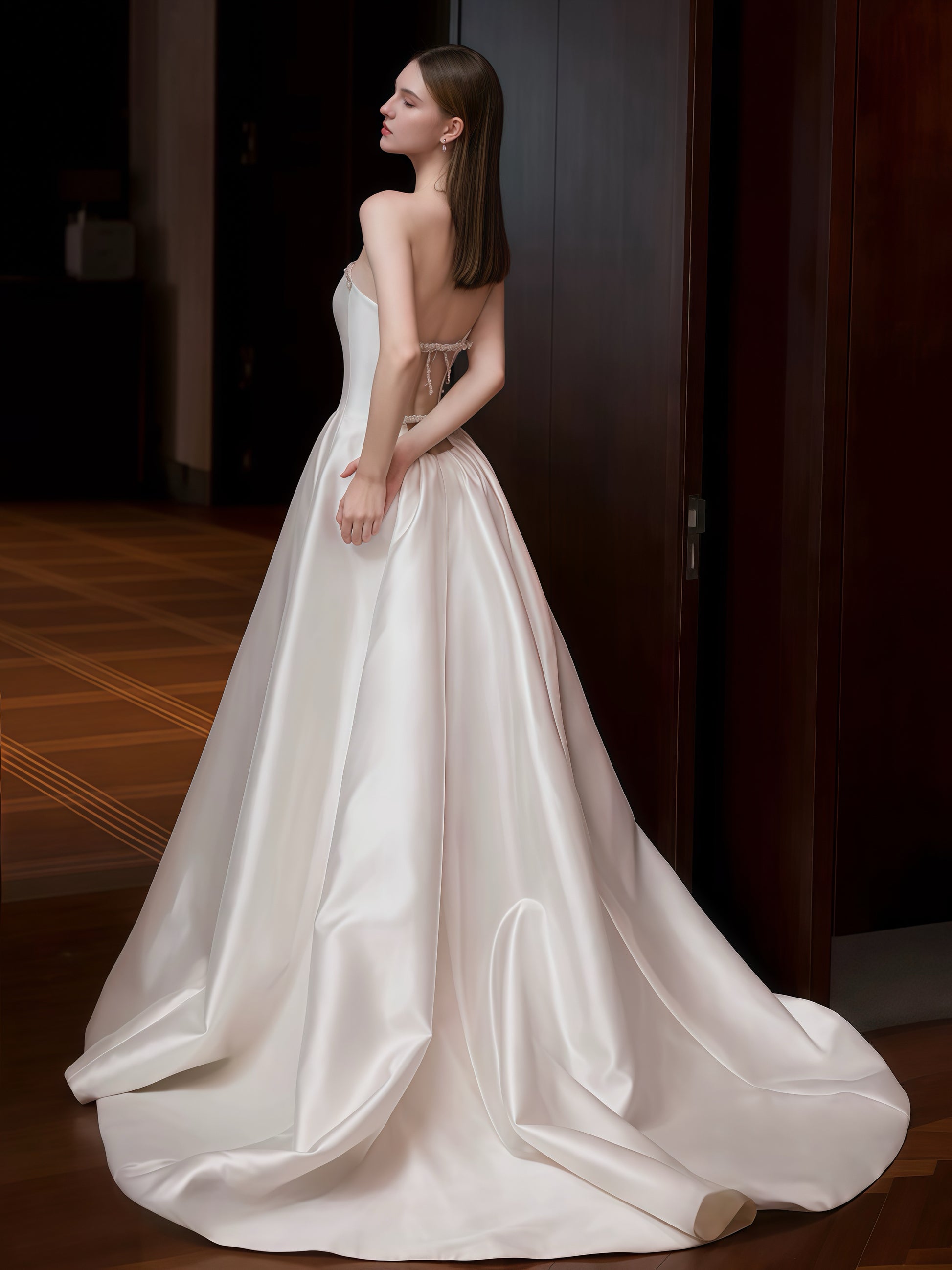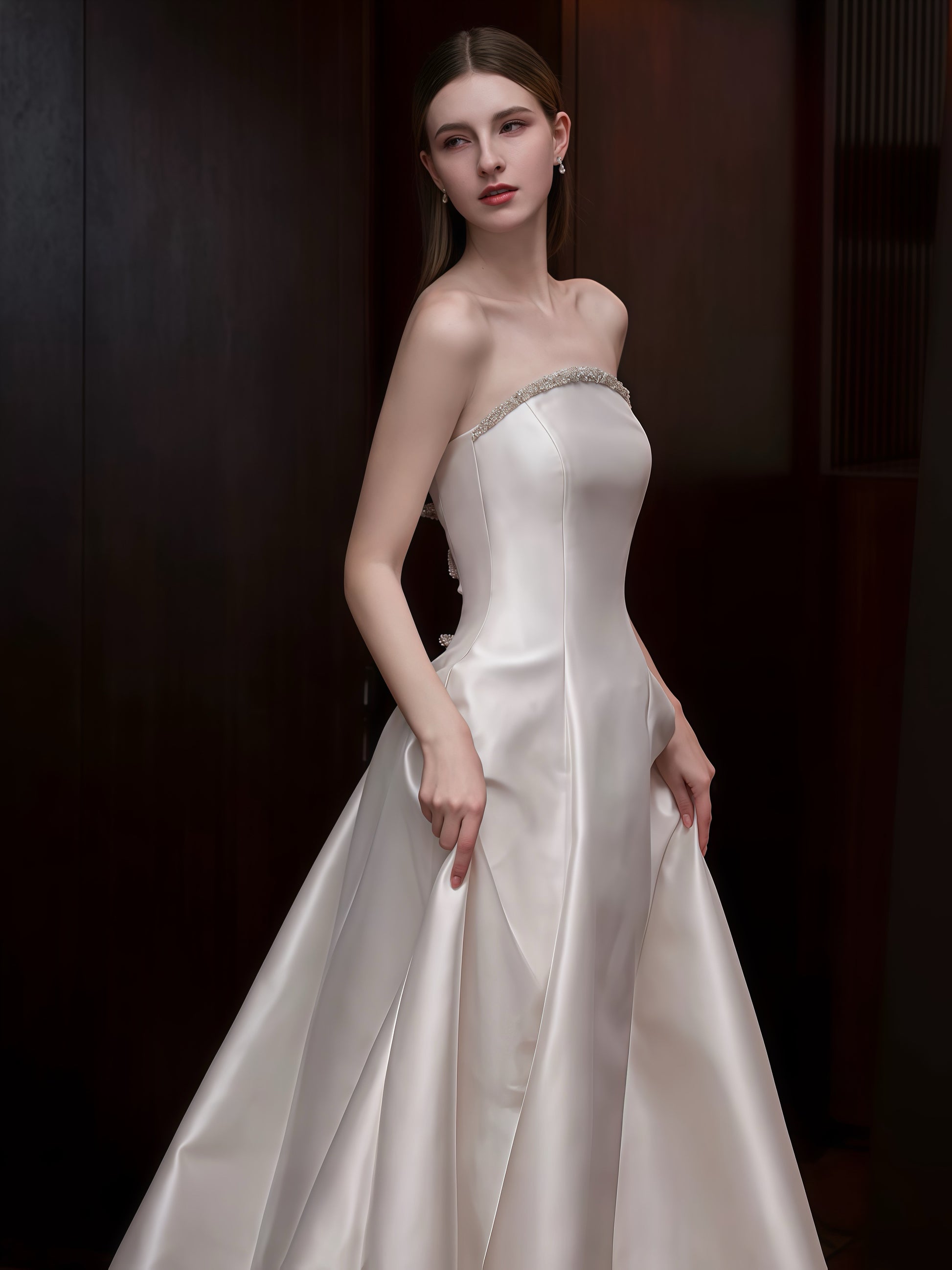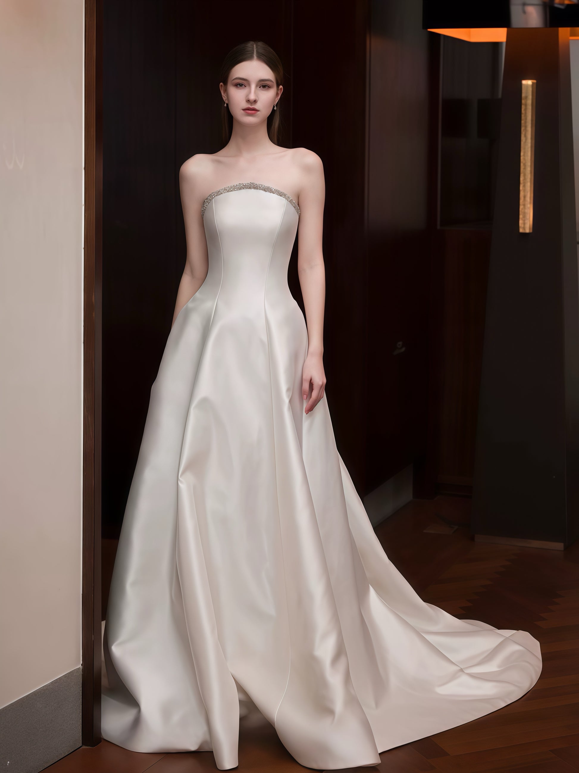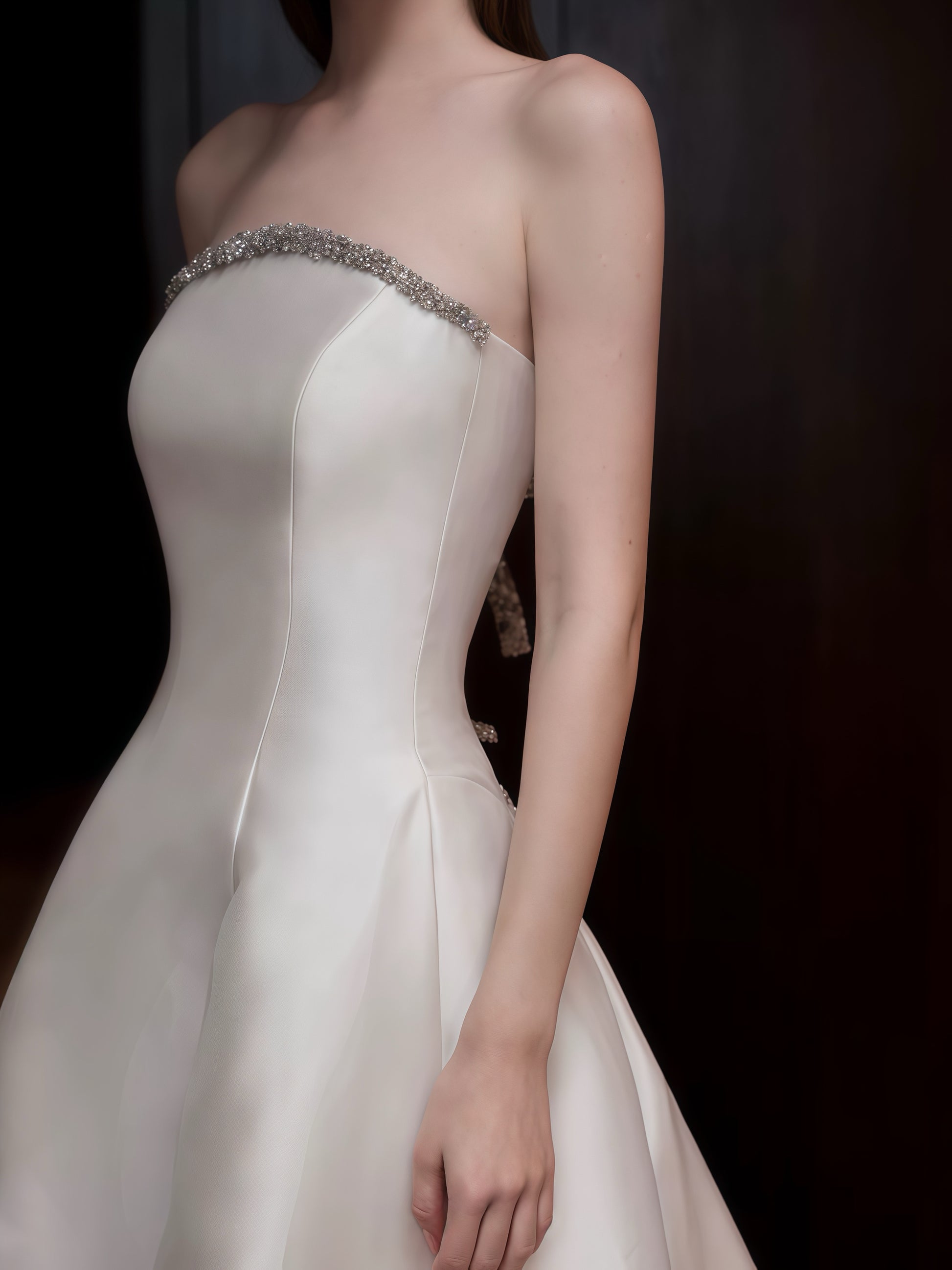 シンプルながらも洗練された美しさを追求したストラップレスウェディングドレスです。上質なサテン素材が上品な光沢を放ち、流れるようなラインがエレガントなシルエットを際立たせます。