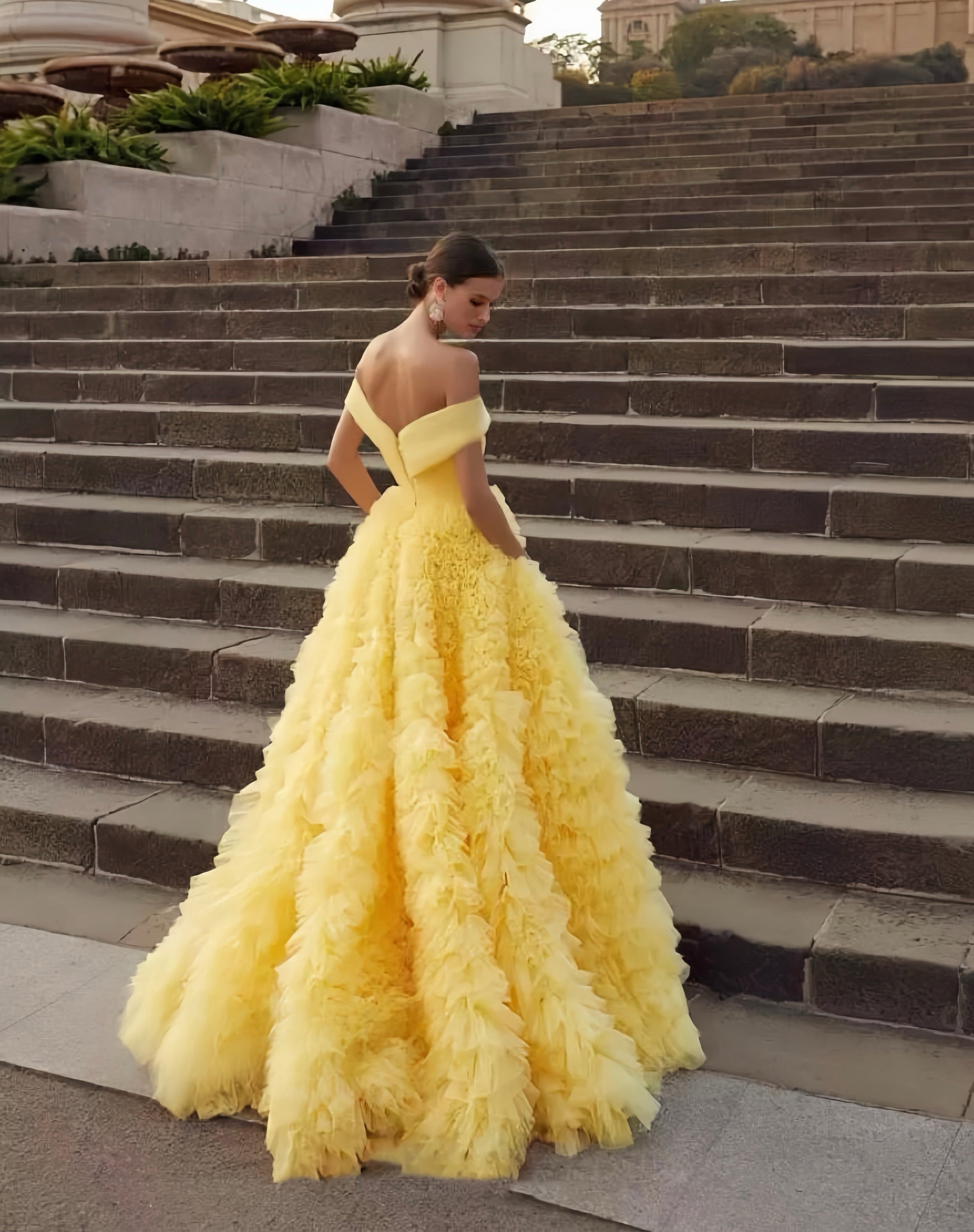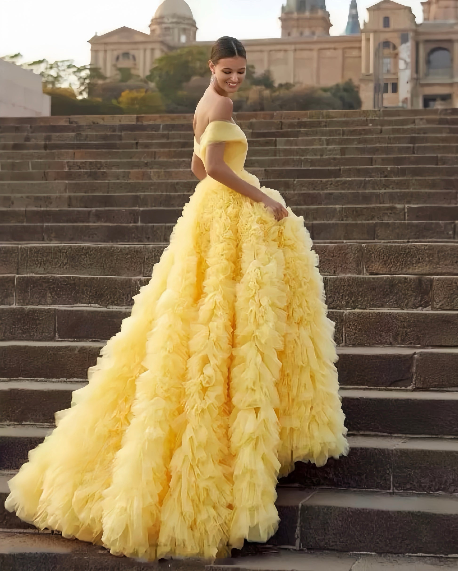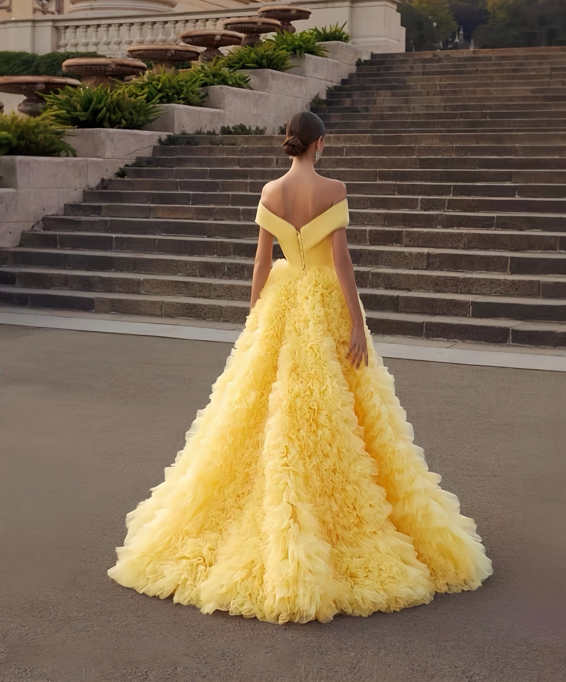 華やかでロマンティックな雰囲気を演出する、美しいイエローのオフショルダープリンセスドレス。上品なオフショルダーデザインがデコルテラインを美しく魅せ、フェミニンな印象を与えます。スカート部分には繊細なティアードフリルがふんだんに施され、まるで花びらが舞うような優雅なシルエットを実現。歩くたびに軽やかに揺れるフリルが、特別な日のあなたをより一層引き立てます。