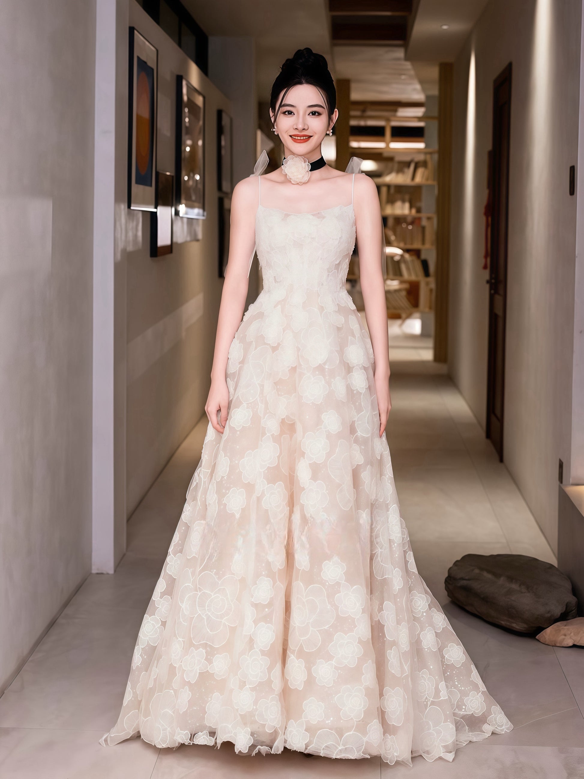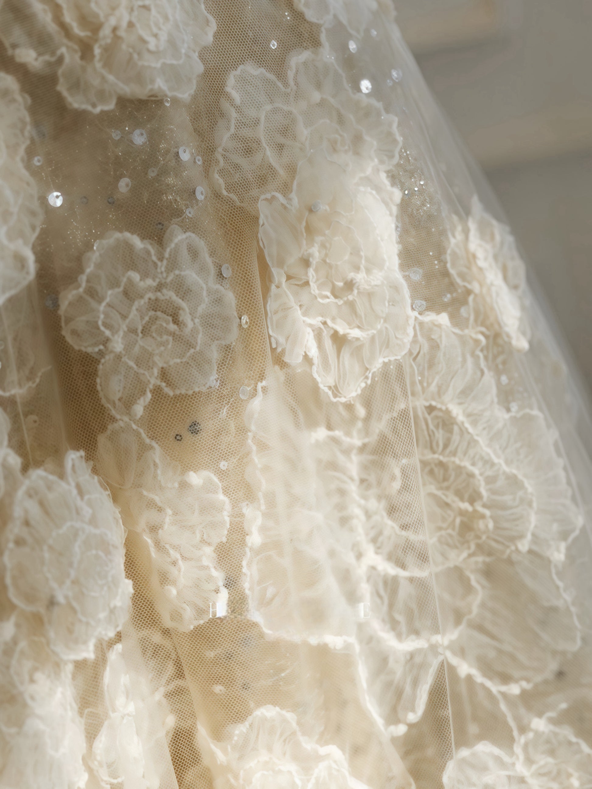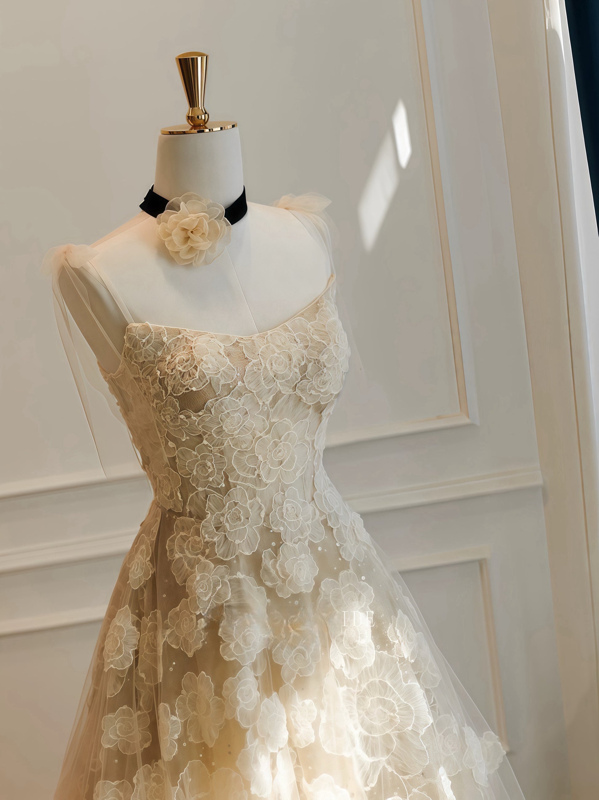 繊細なフラワーモチーフがあしらわれたロマンチックなチュールドレス。軽やかな素材感と上品なAラインシルエットが特徴で、歩くたびに優美な動きを演出します。肩部分のストラップが透明感を与え、デコルテラインを美しく見せるデザインです。花嫁の魅力を引き立てる一着として、結婚式や特別な日のためにぴったりの選択です。