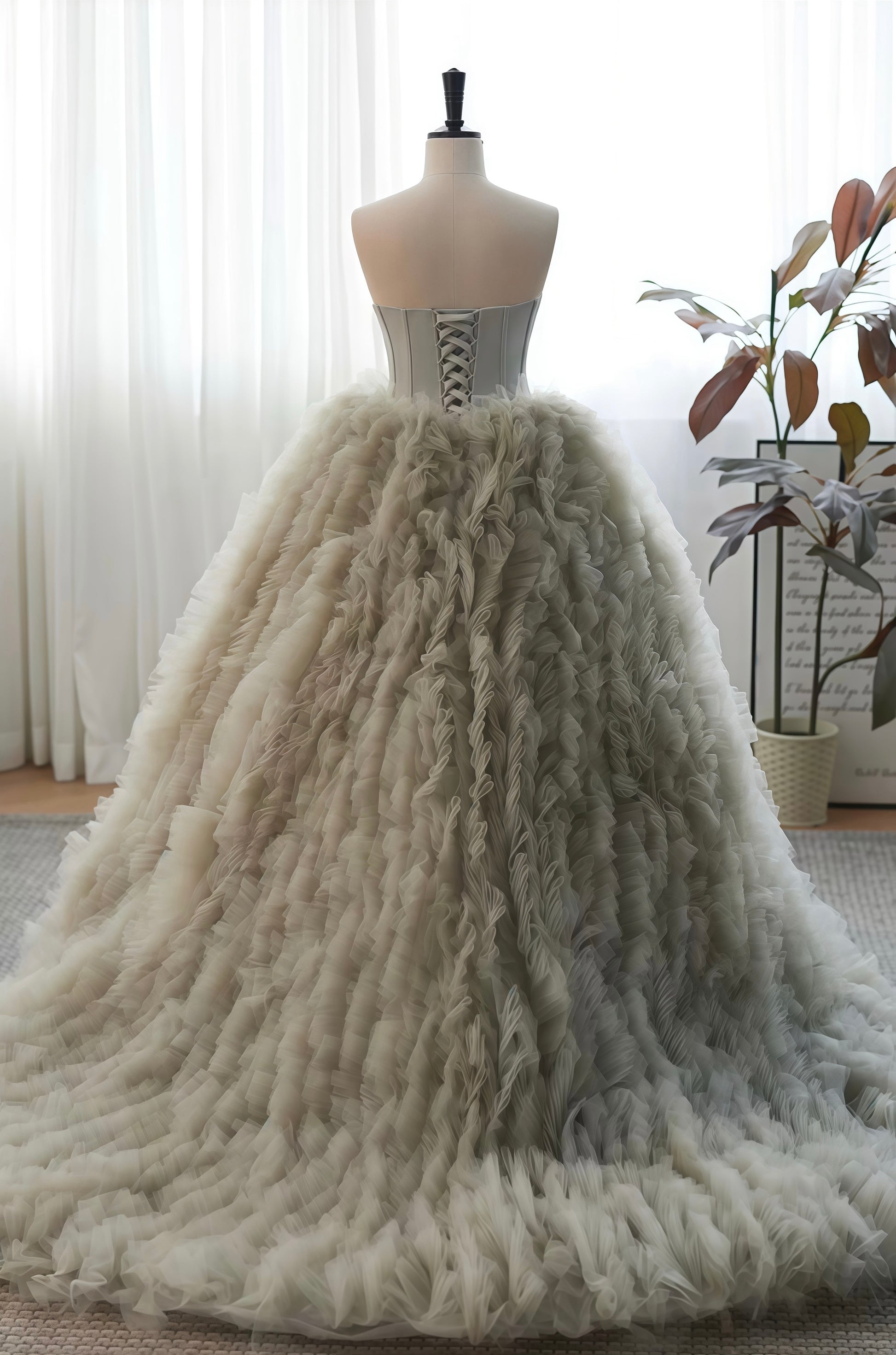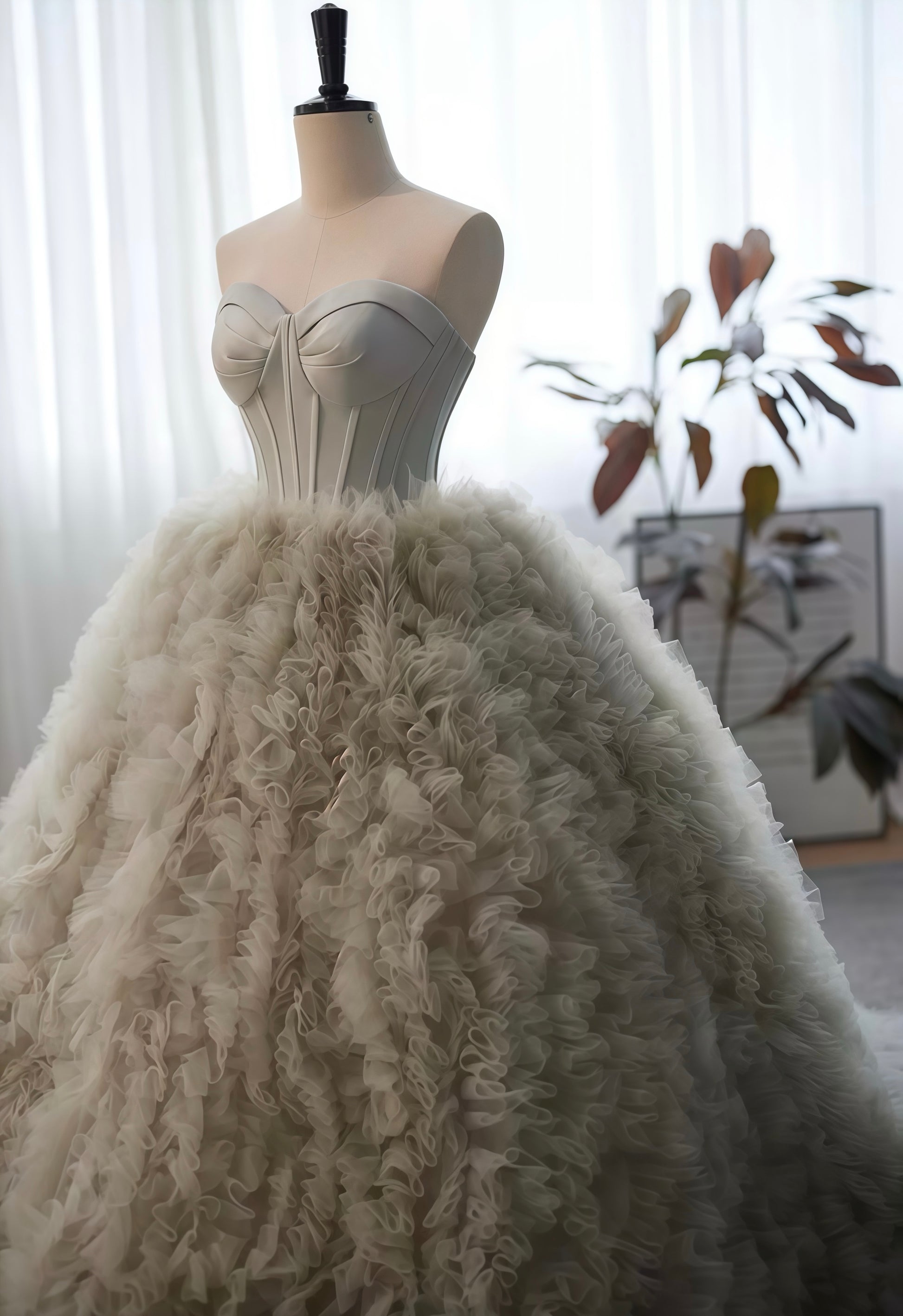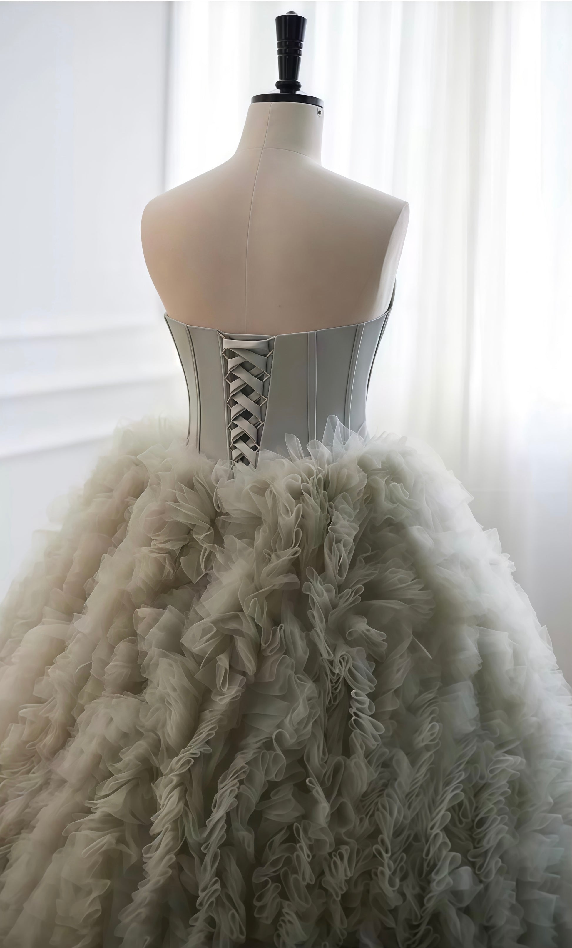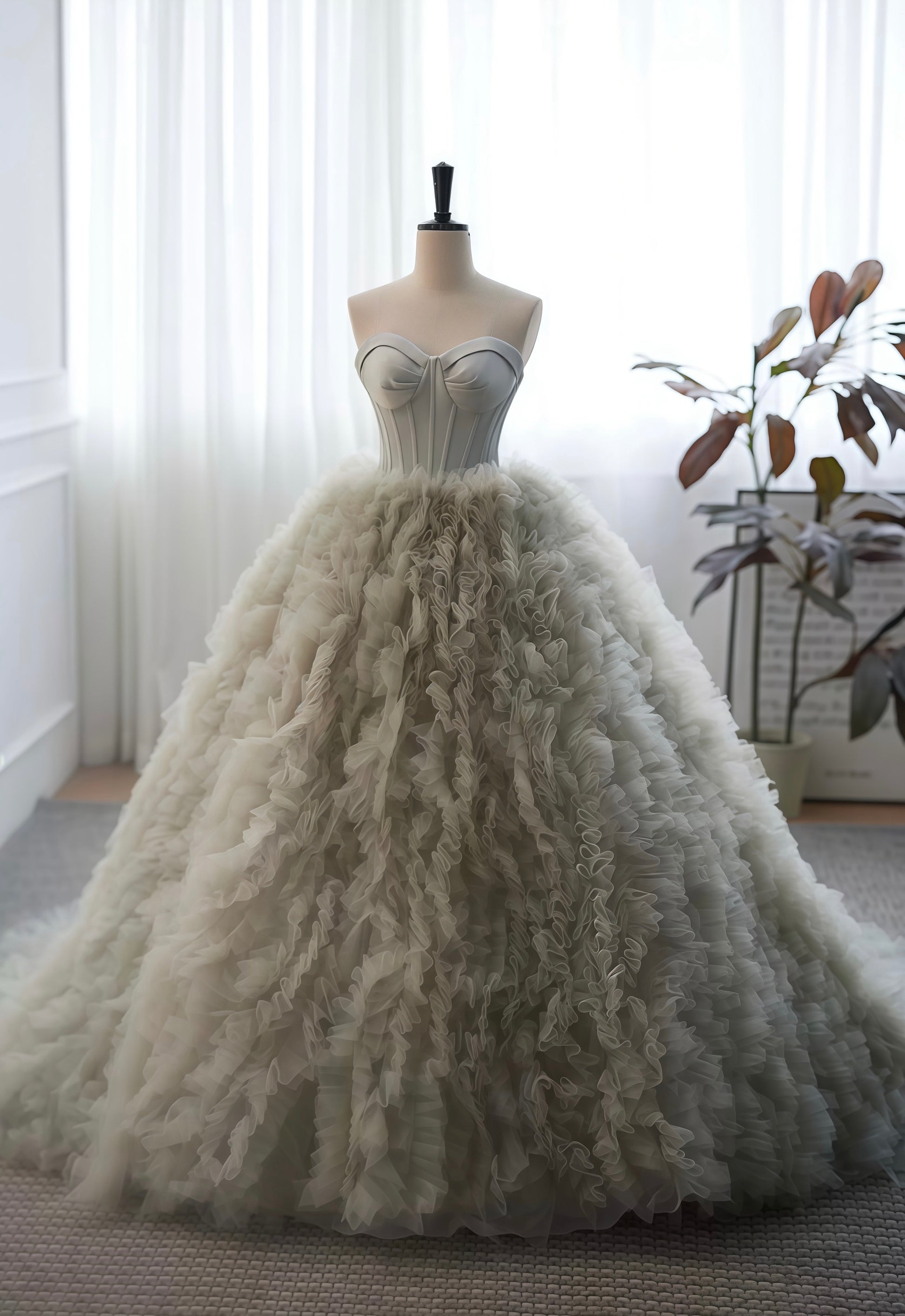 華やかで印象的なボリューム感が魅力の、チュール素材のプリンセスドレス。美しく立体的に重なるフリルが、歩くたびに優雅に揺れ、特別な一日をさらに華麗に演出します。コルセット風のボディラインを引き立てるトップスは、デコルテを美しく見せるデザインで、クラシックな中にもモダンな雰囲気を漂わせます。
