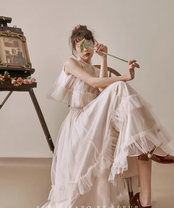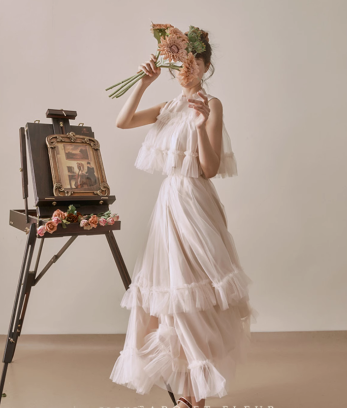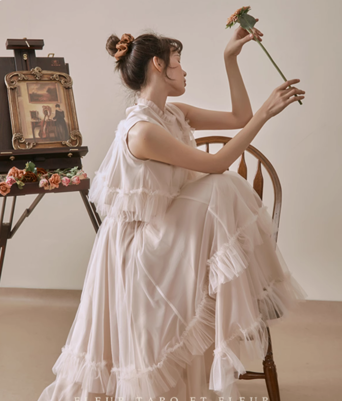 スカートも同様にティアードデザインで、ふんわりとしたシルエットを形成し、柔らかさとエレガンスを演出します。