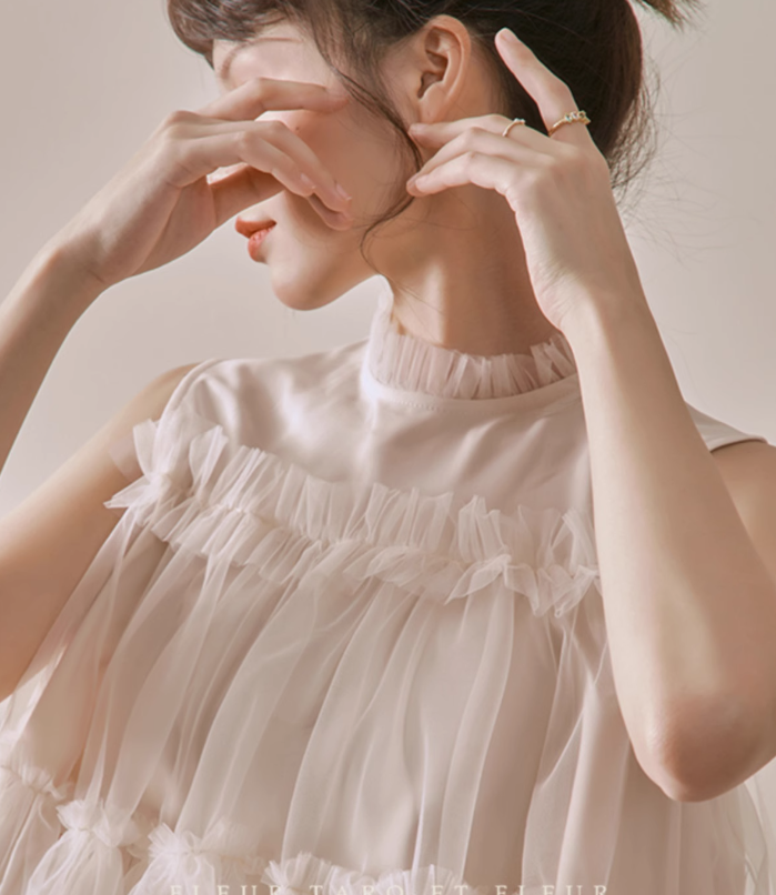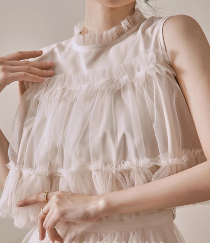 トップスとスカートはどちらもチュール素材をふんだんに使用しており、軽やかな印象を与えます。トップは短めのフリルが重なったデザインで、動くたびに優雅に揺れます。