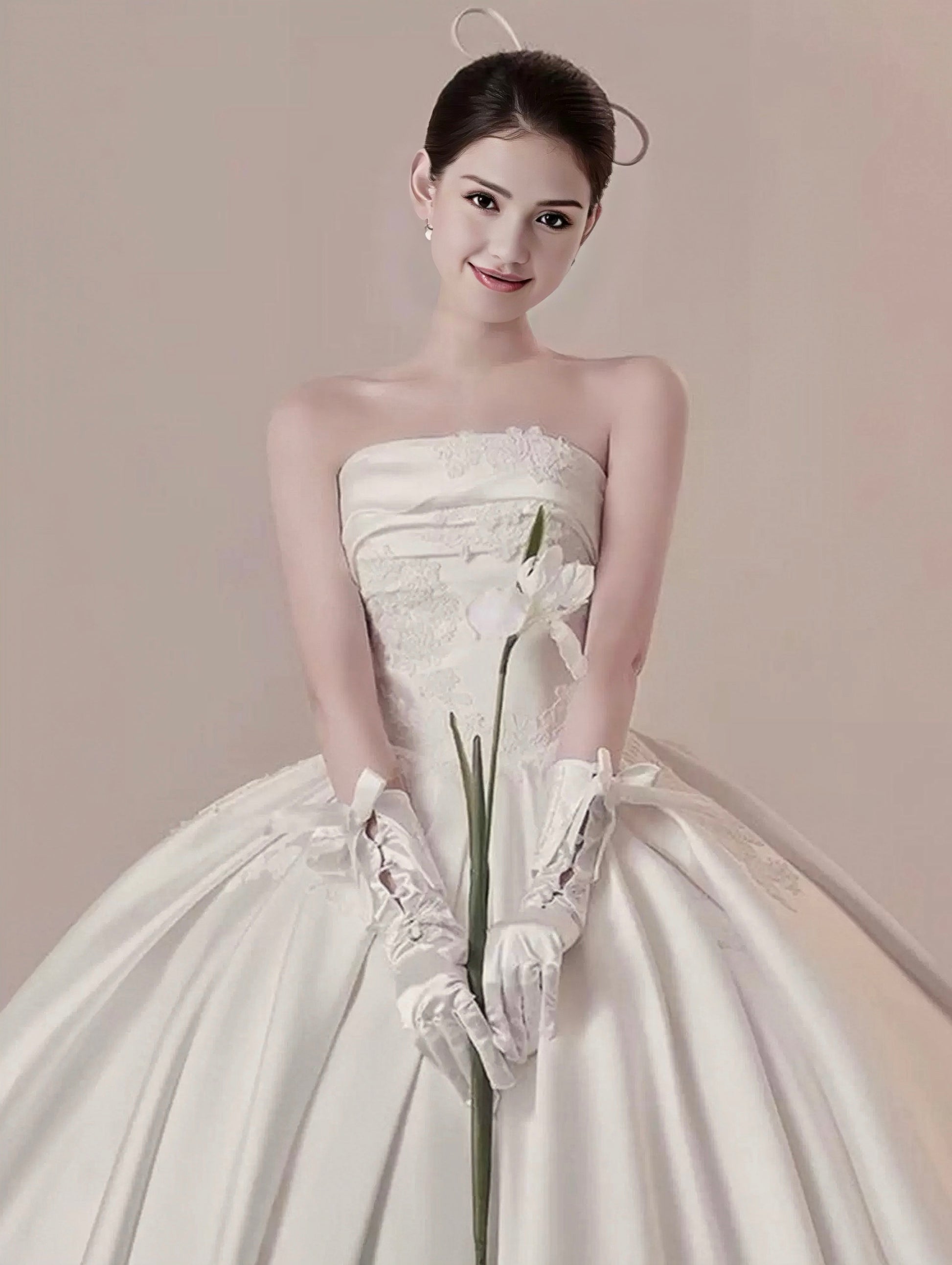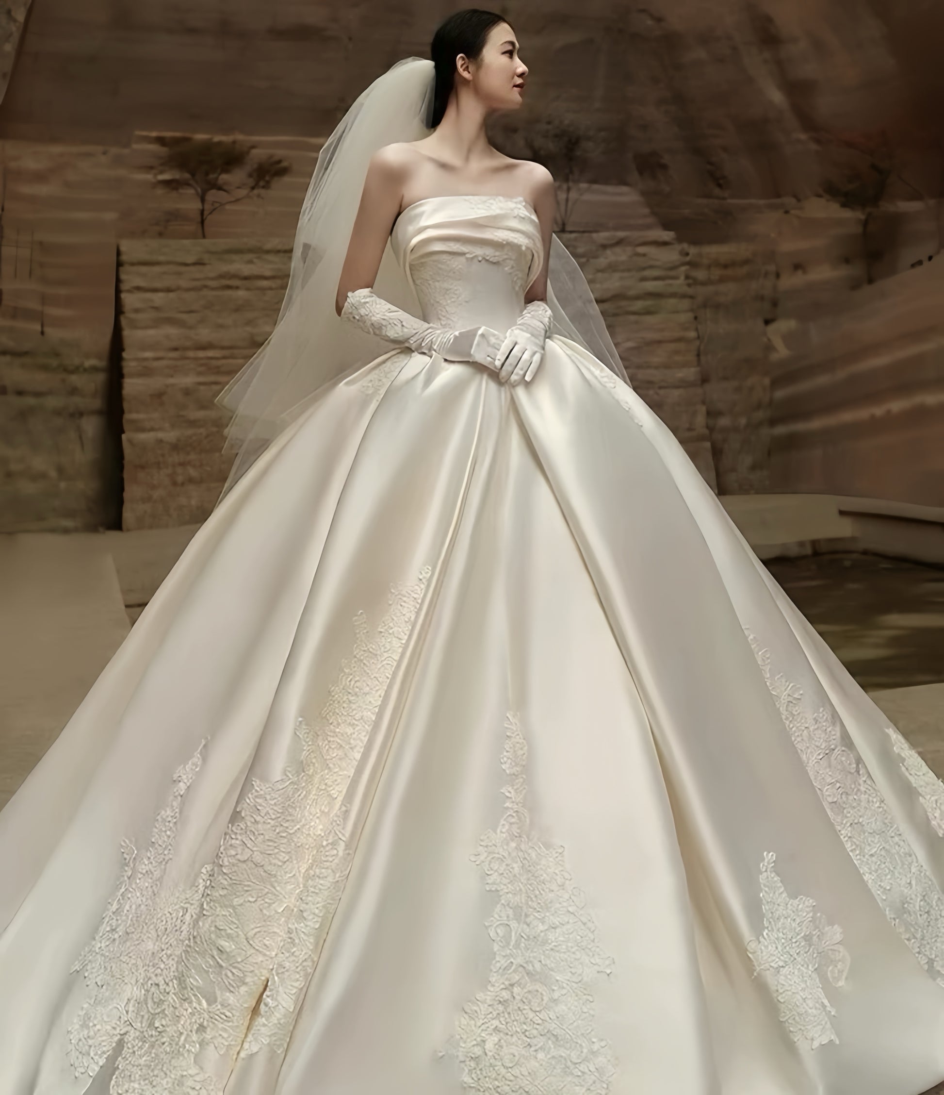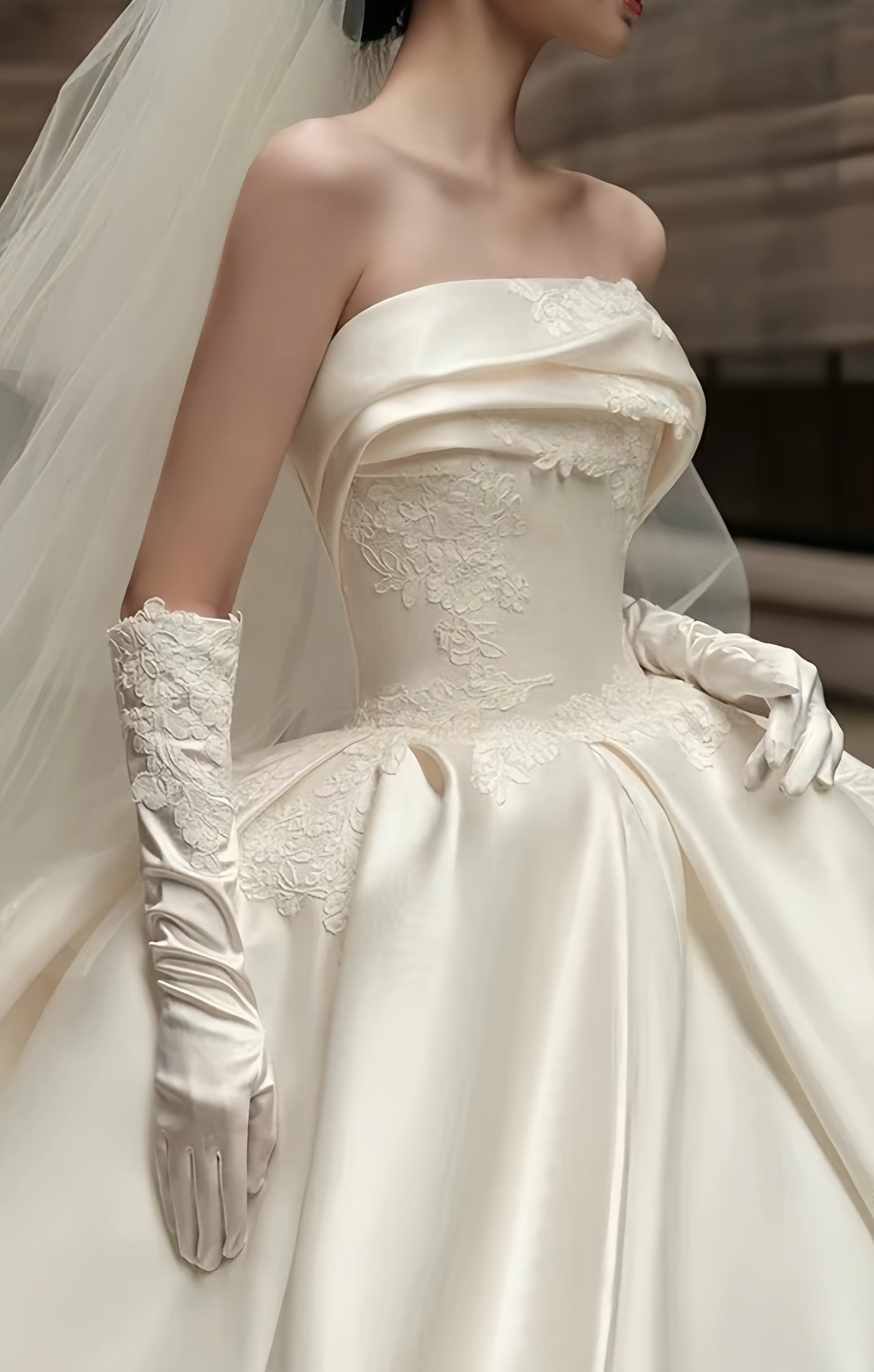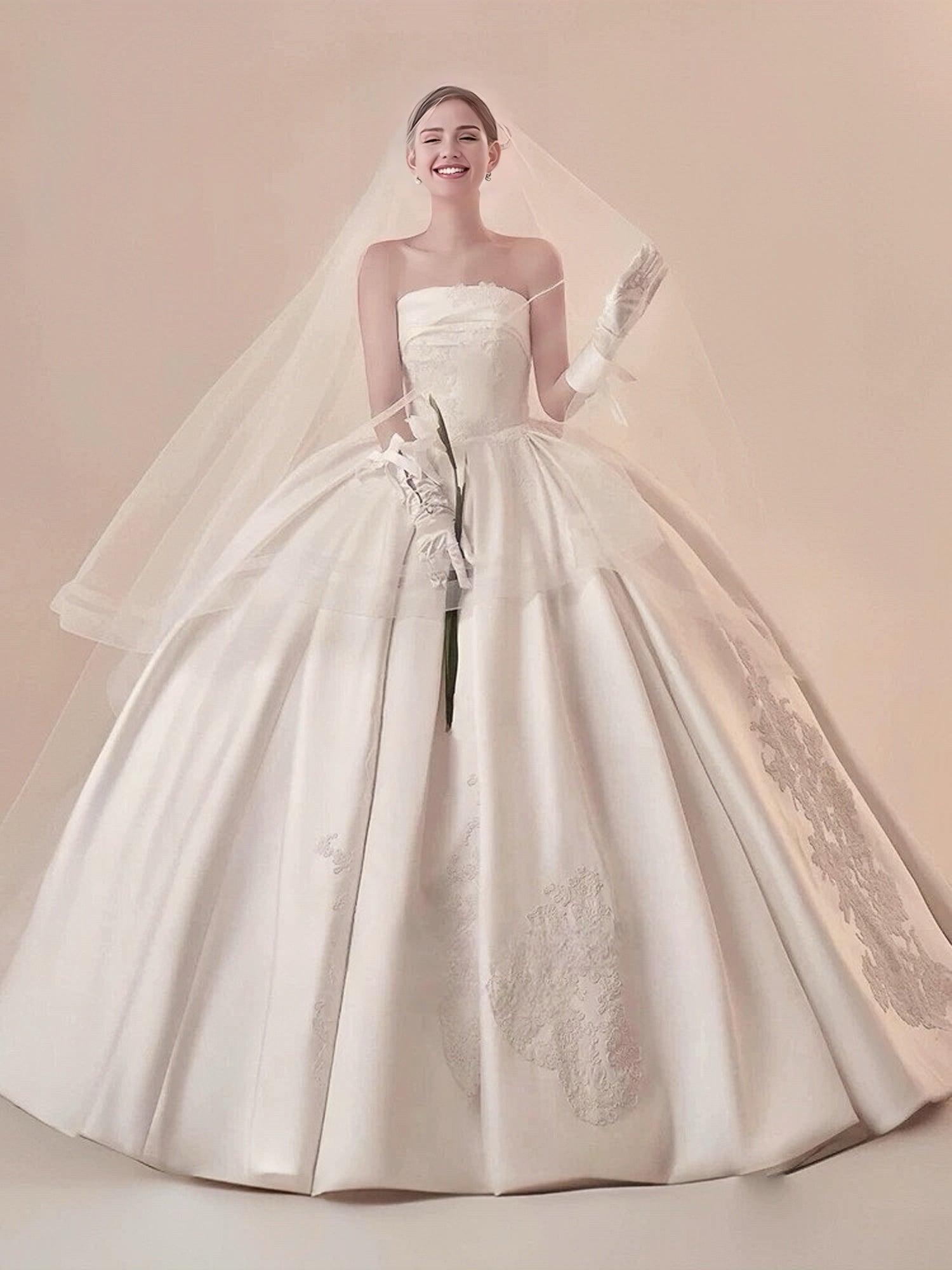 洗練されたシルエットと繊細なレースが魅力のAラインウェディングドレス。上品なストラップレスデザインがデコルテを美しく引き立て、クラシカルな雰囲気を演出します。