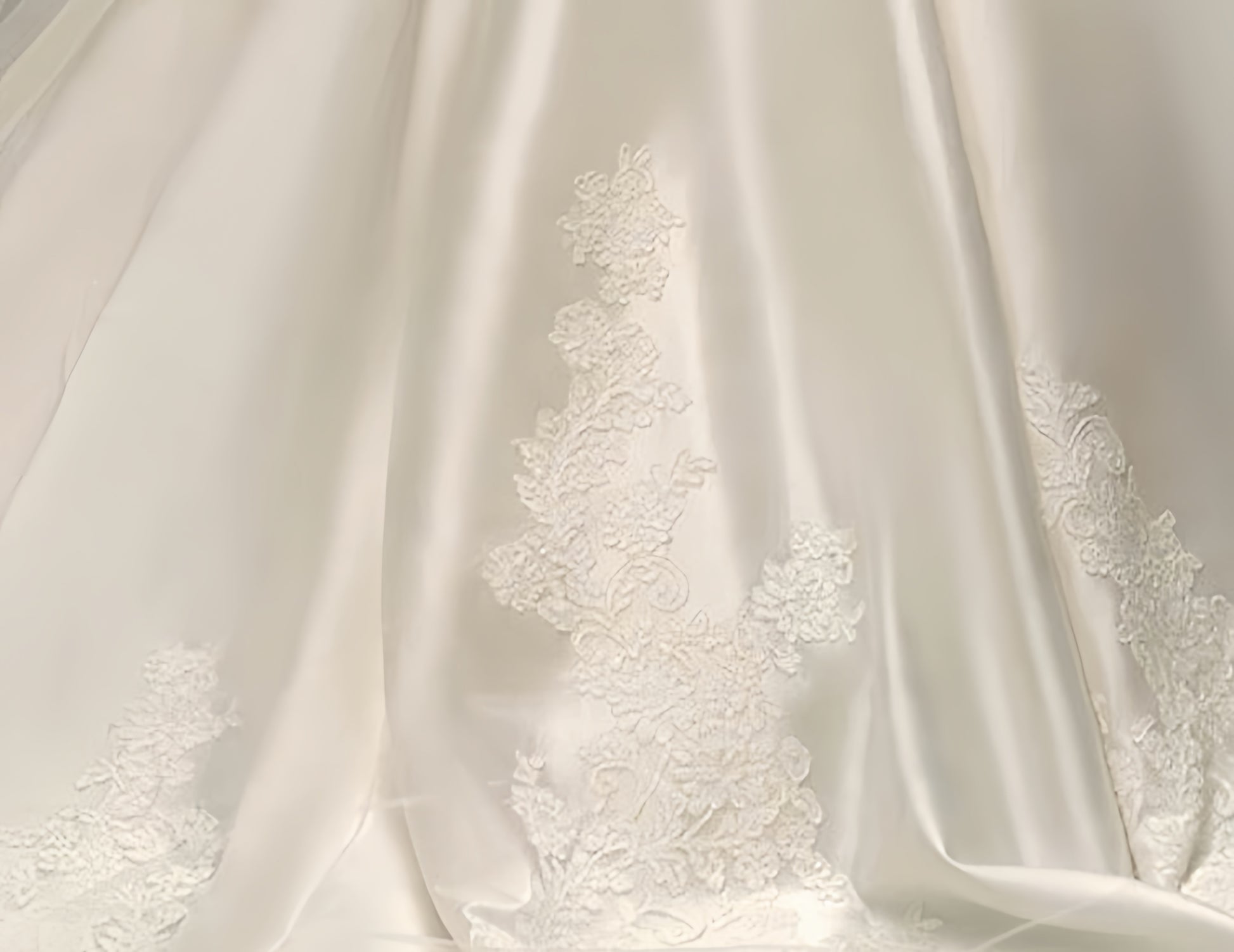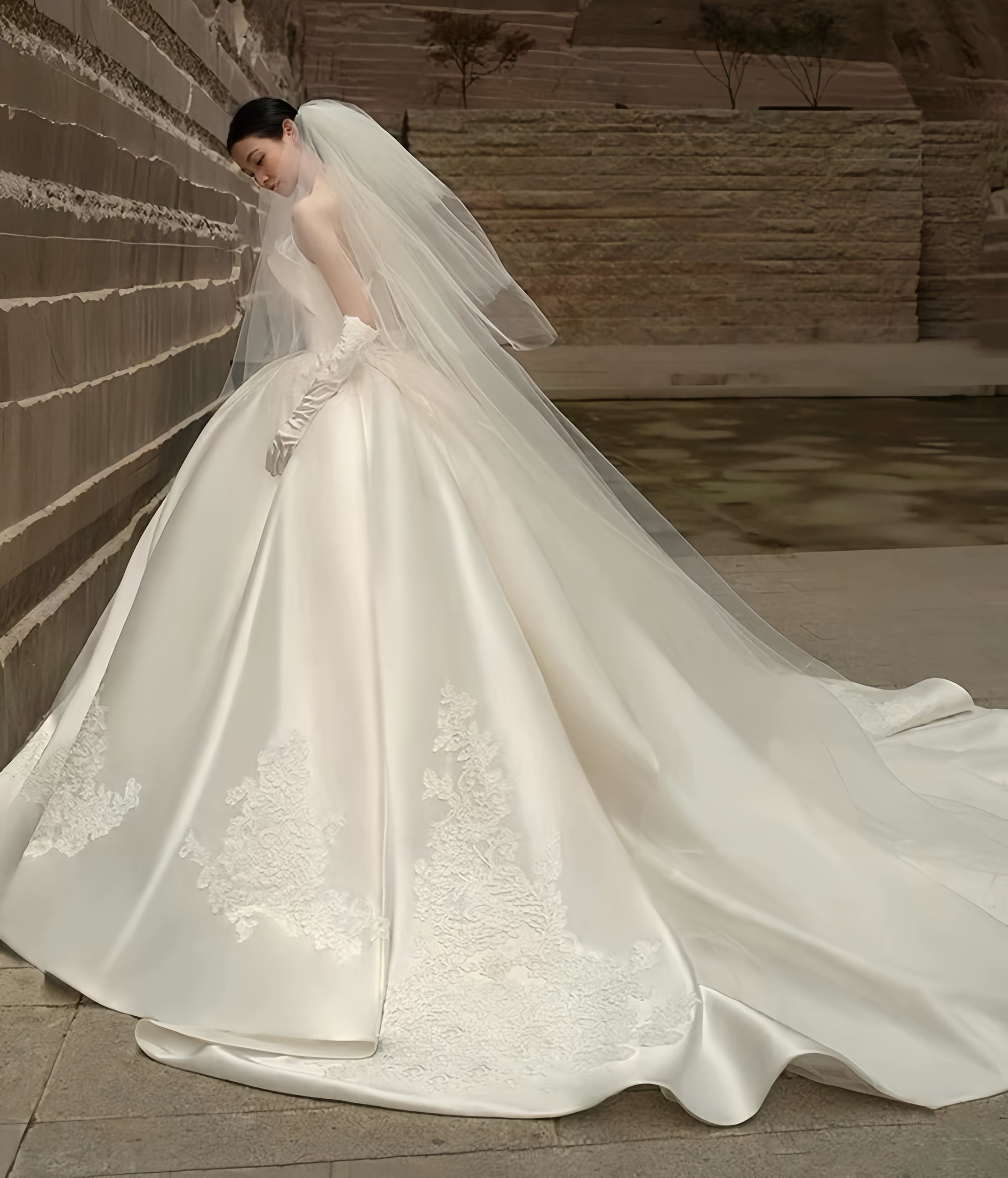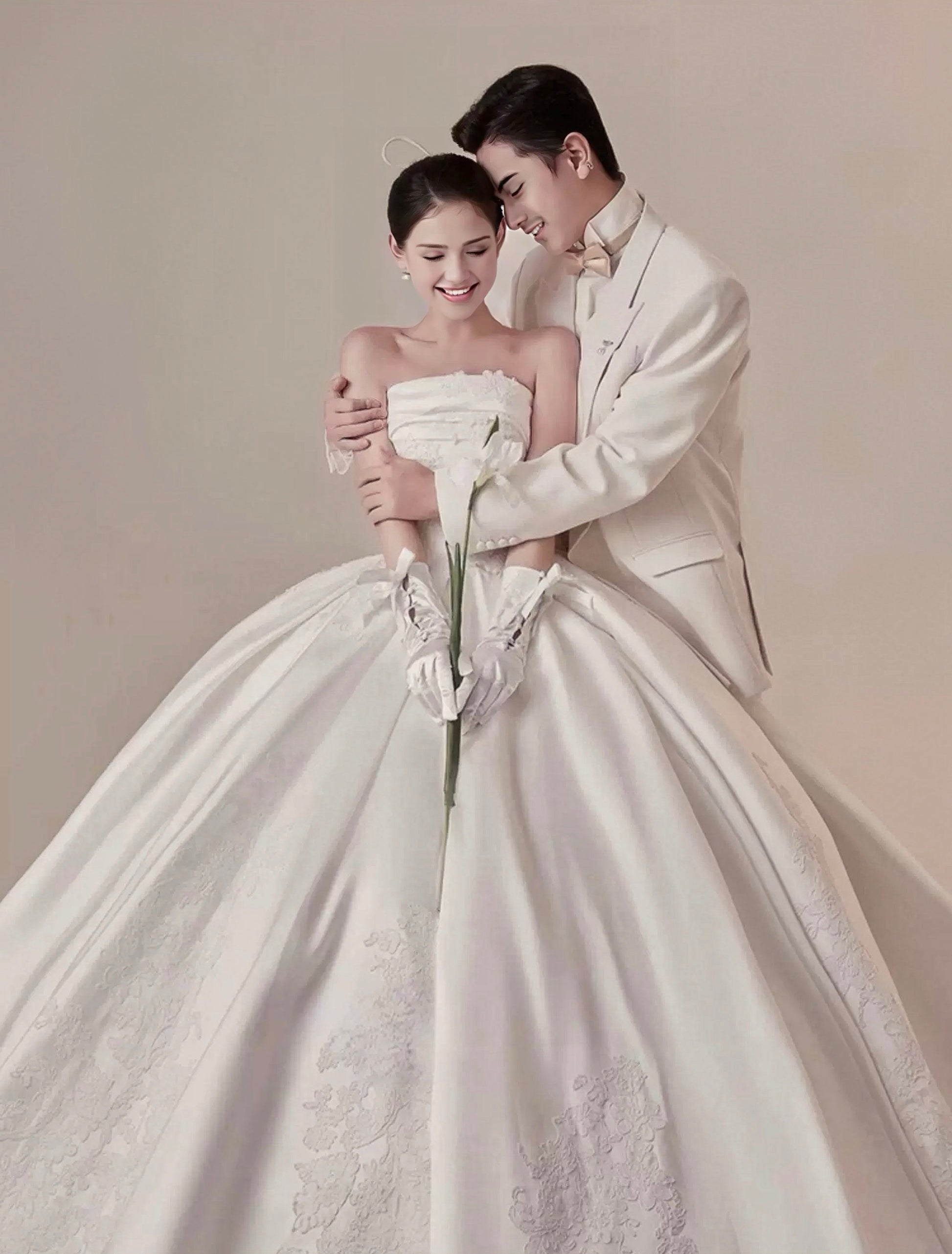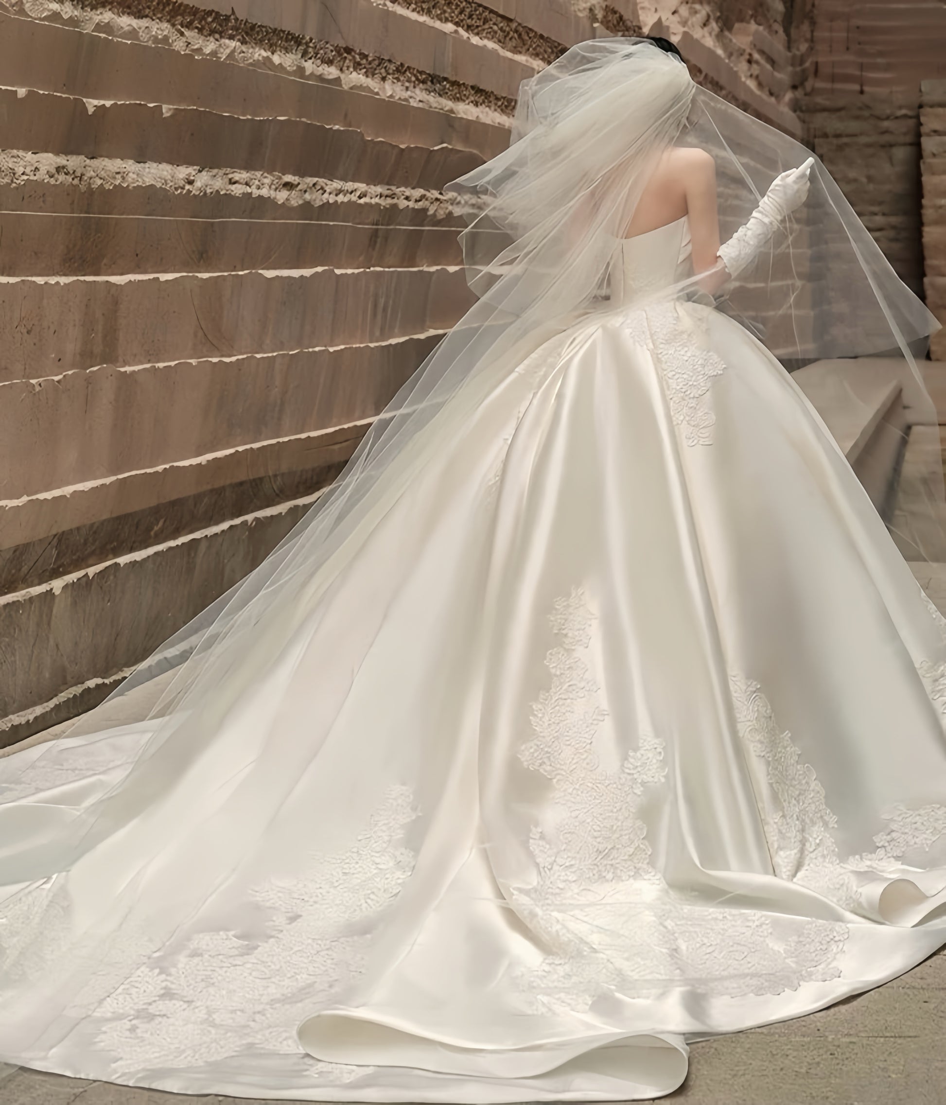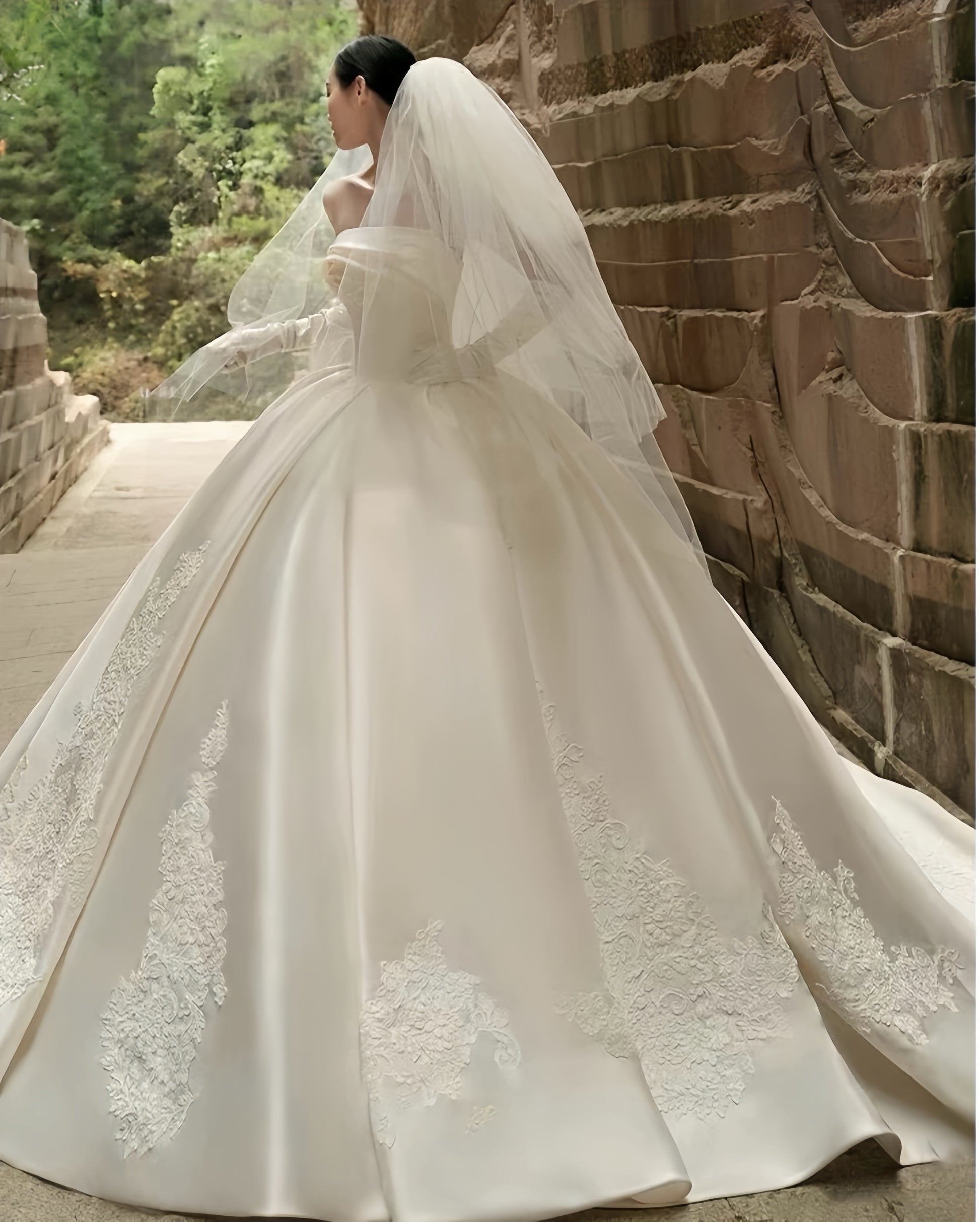 洗練されたシルエットと繊細なレースが魅力のAラインウェディングドレス。上品なストラップレスデザインがデコルテを美しく引き立て、クラシカルな雰囲気を演出します。