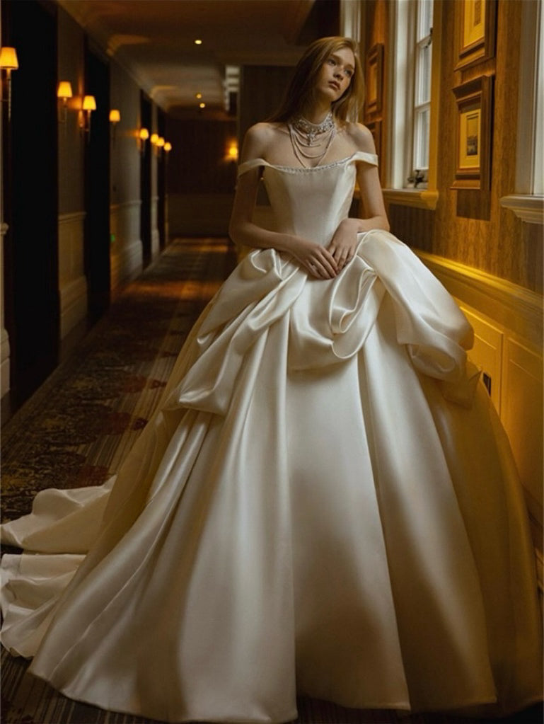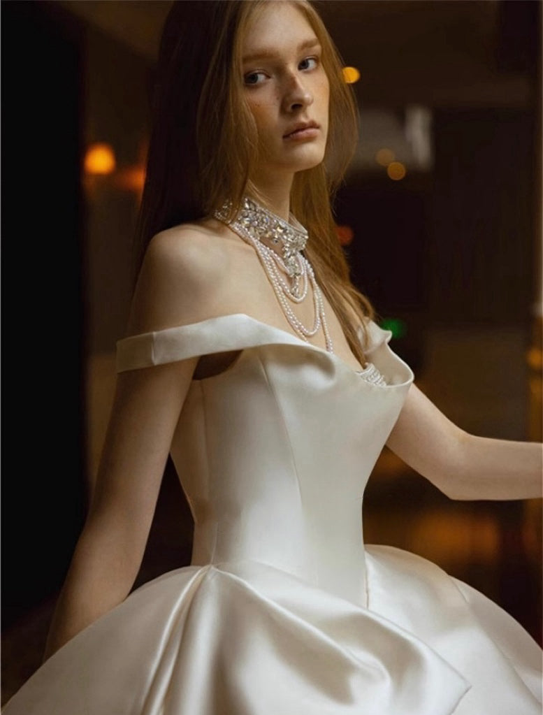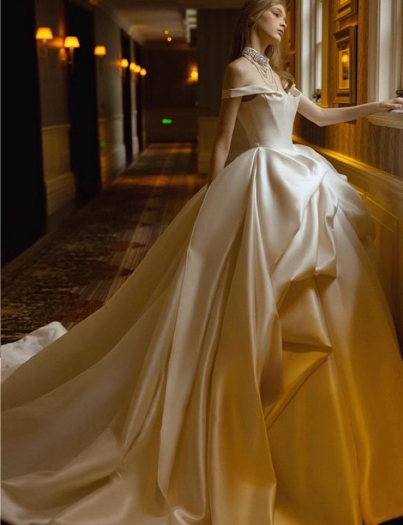 優雅で華やかな存在感を放つオフショルダーのウェディングドレス。繊細なシルエットを描くコルセットトップは、女性らしいラインを引き立て、上品さを演出します。流れるようなドレープが施されたスカート部分は、ボリューム感たっぷりで、ドラマチックな印象を与えます。