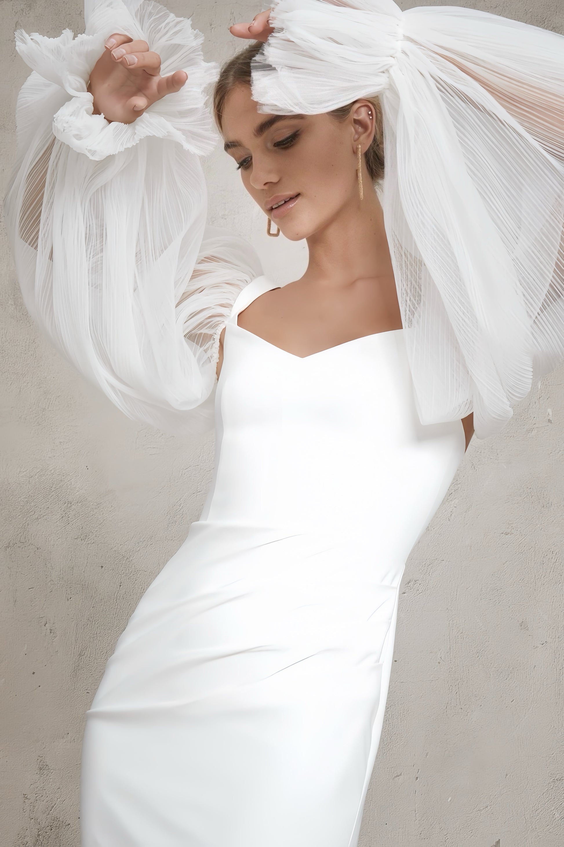洗練されたシルエットと、ロマンティックなディテールが融合したスレンダーラインのウェディングドレス。シンプルながらも美しくボディラインを引き立てるデザインは、都会的でスタイリッシュな花嫁にぴったり。