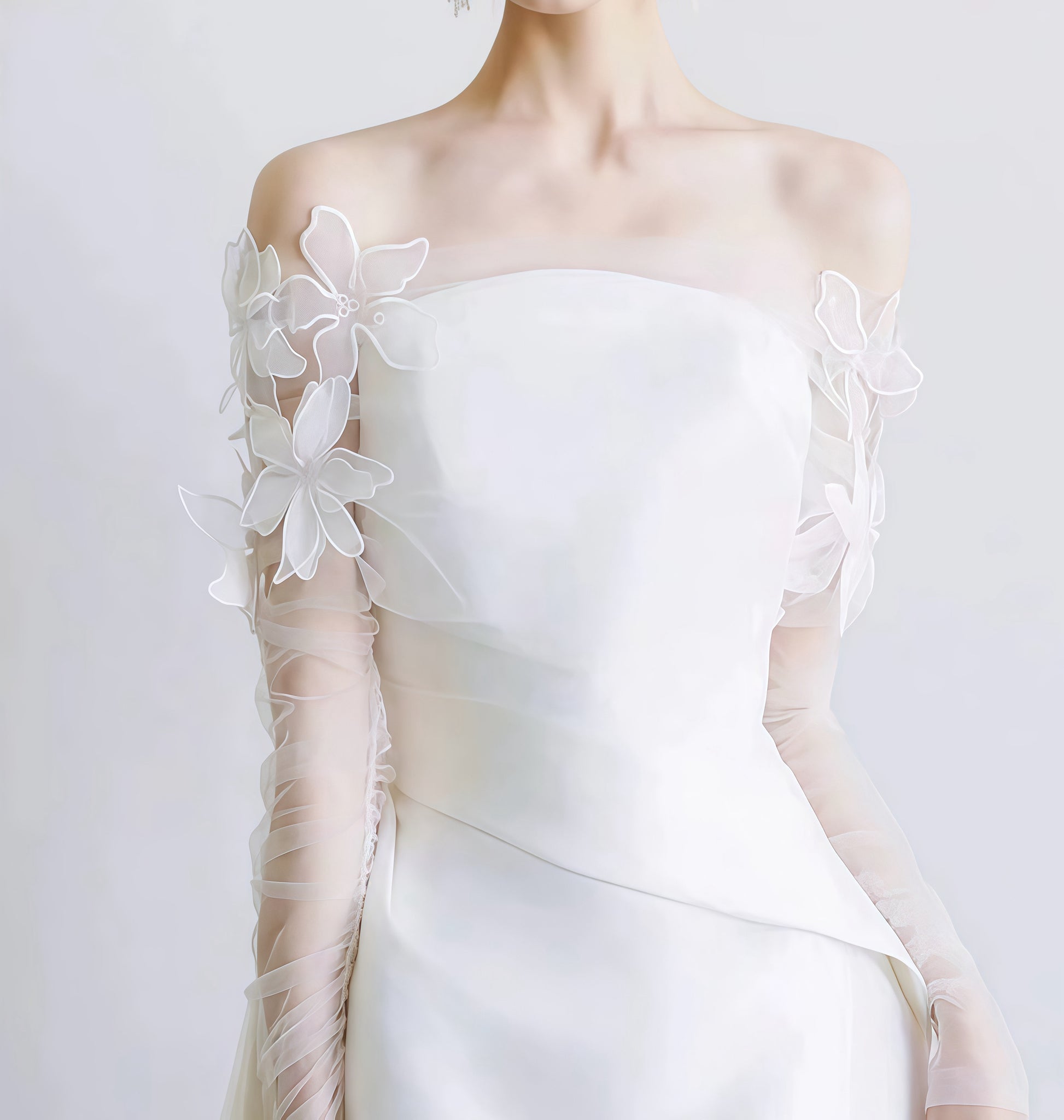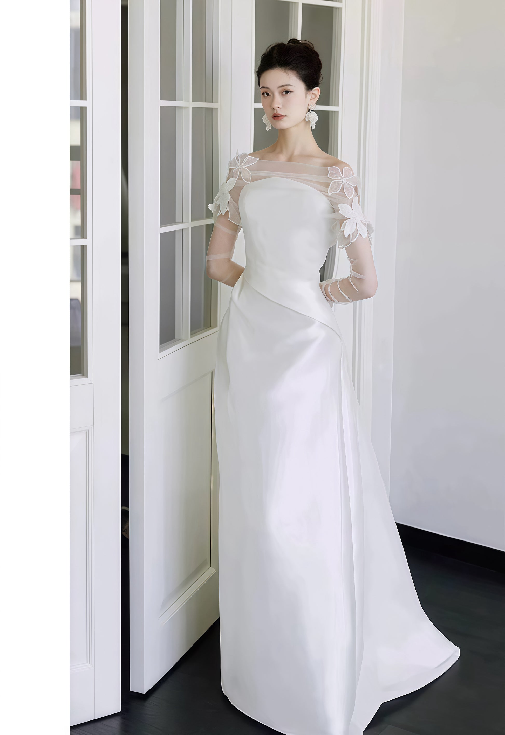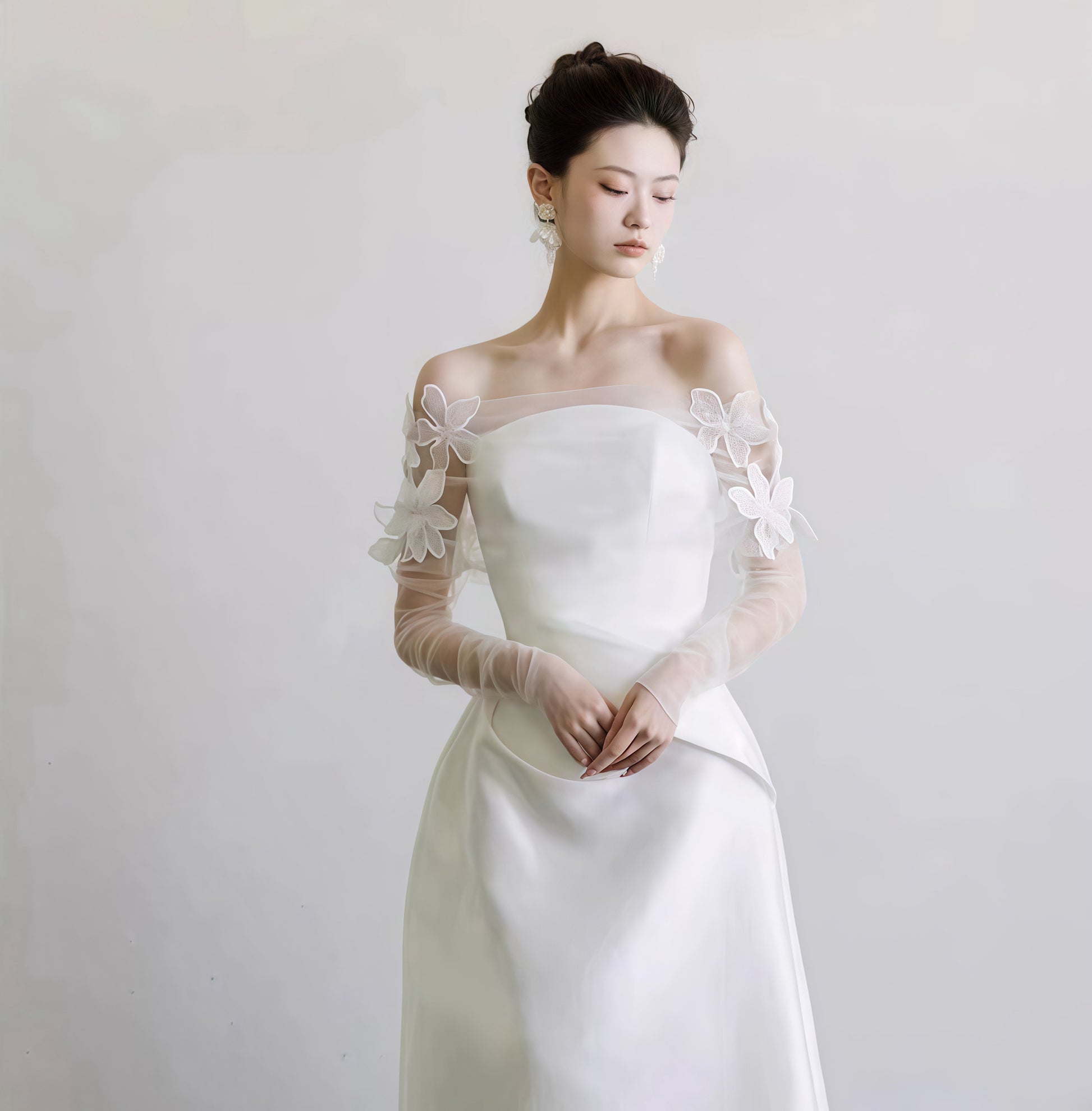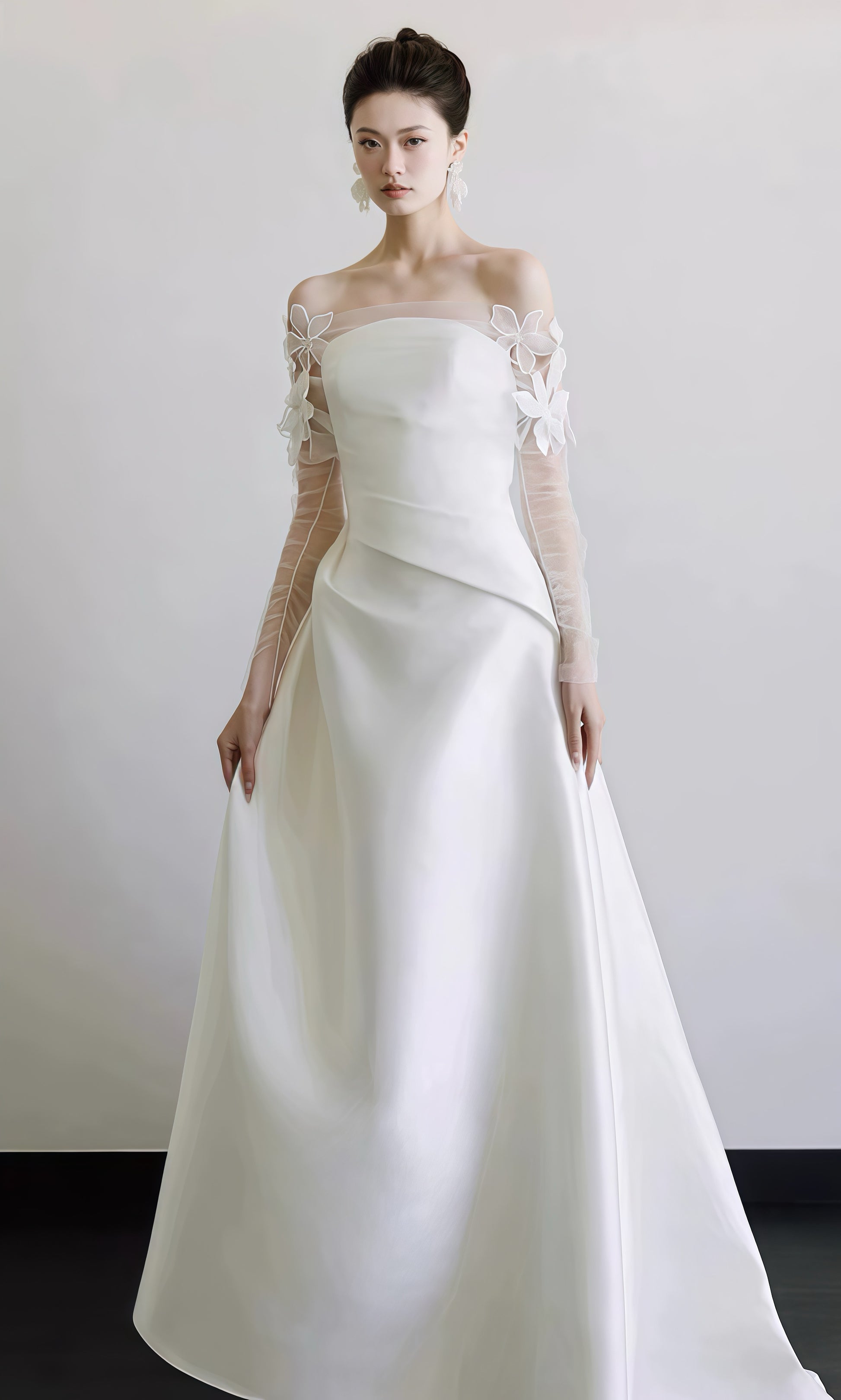 洗練されたシンプルな美しさが際立つ、モダンなオフショルダーウェディングドレス。滑らかなサテン生地が上品な光沢を放ち、流れるようなAラインシルエットがエレガントな印象を演出します。