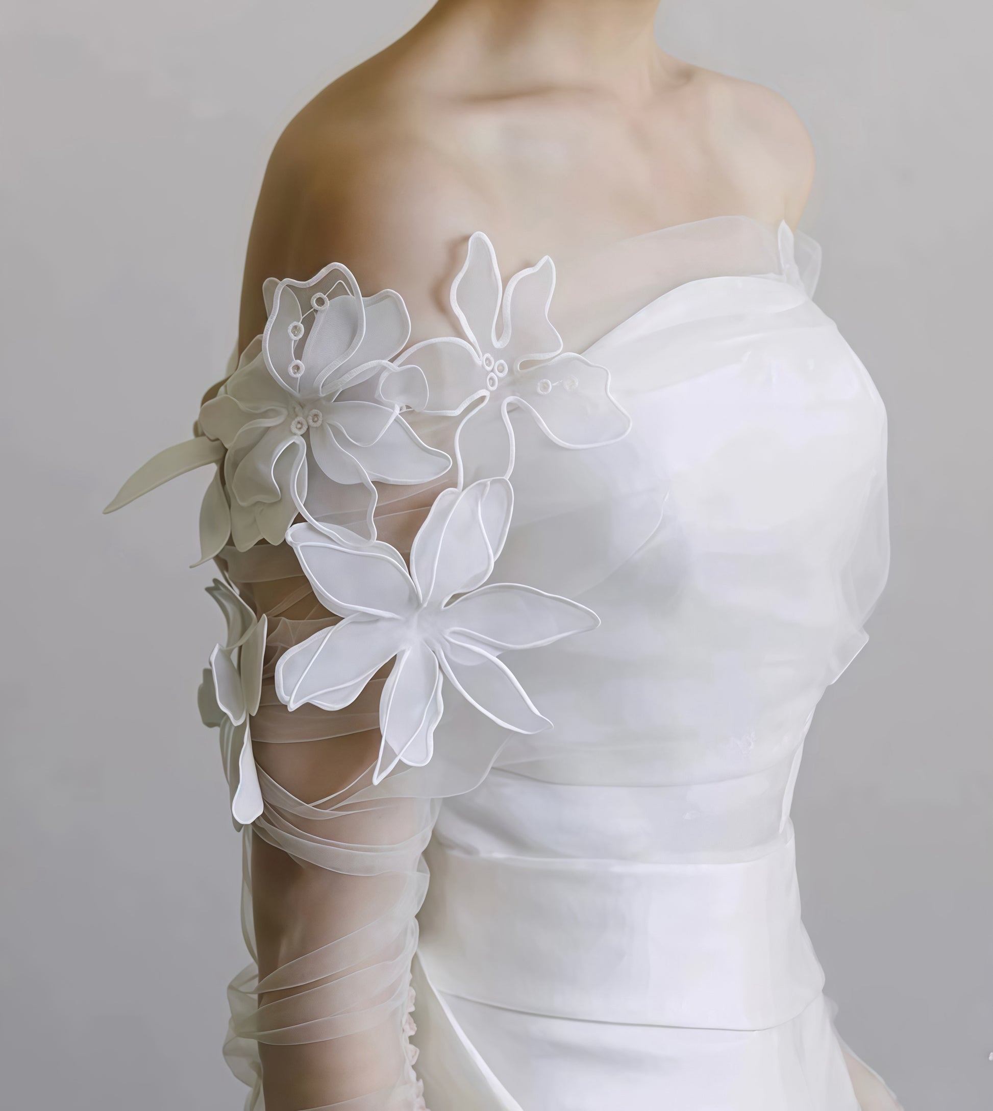 特徴的なアシンメトリーのドレープデザインが洗練されたスタイルを際立たせ、透け感のあるロングスリーブには繊細なフラワーモチーフが施され、フェミニンな魅力をプラス。
