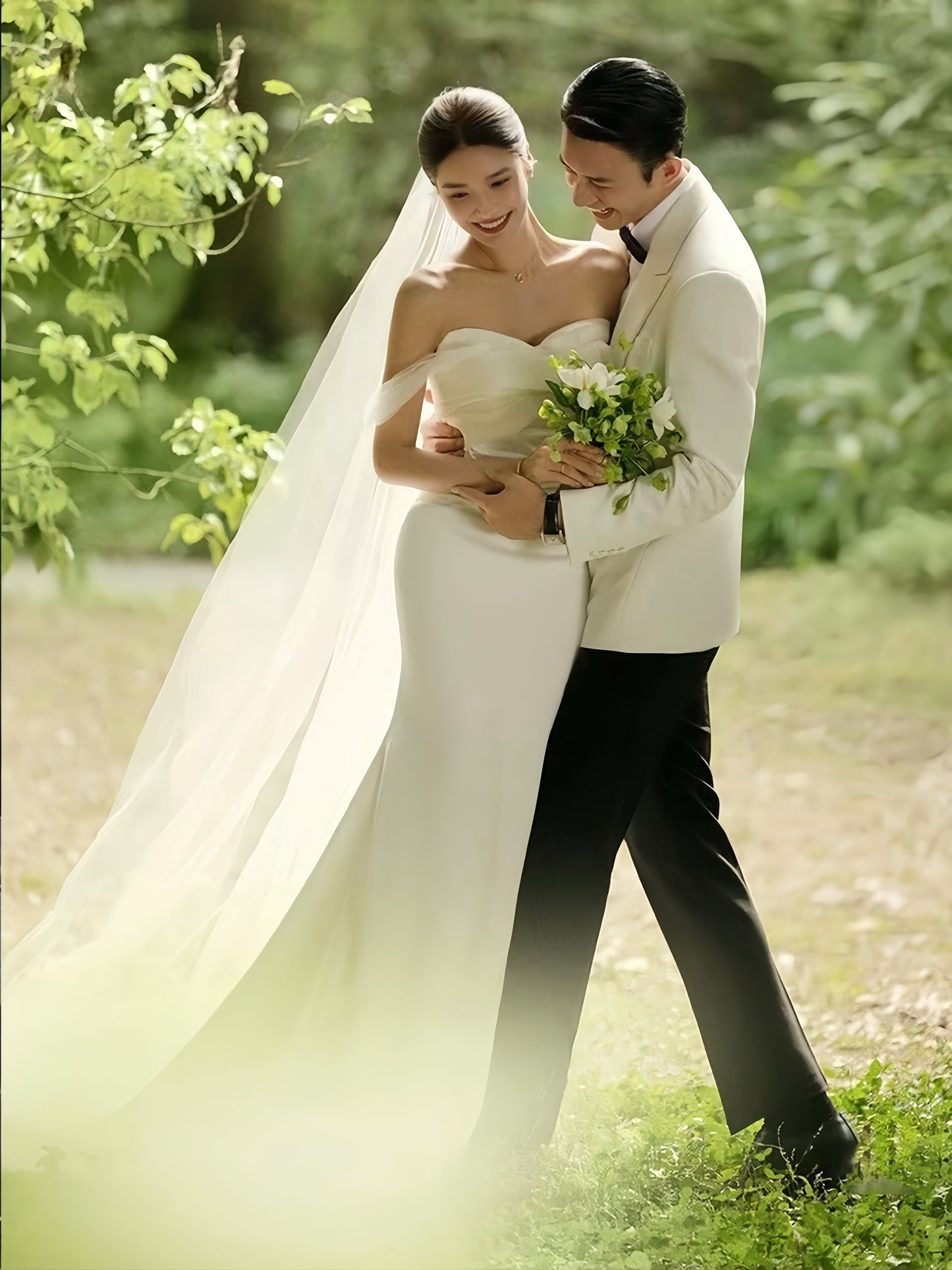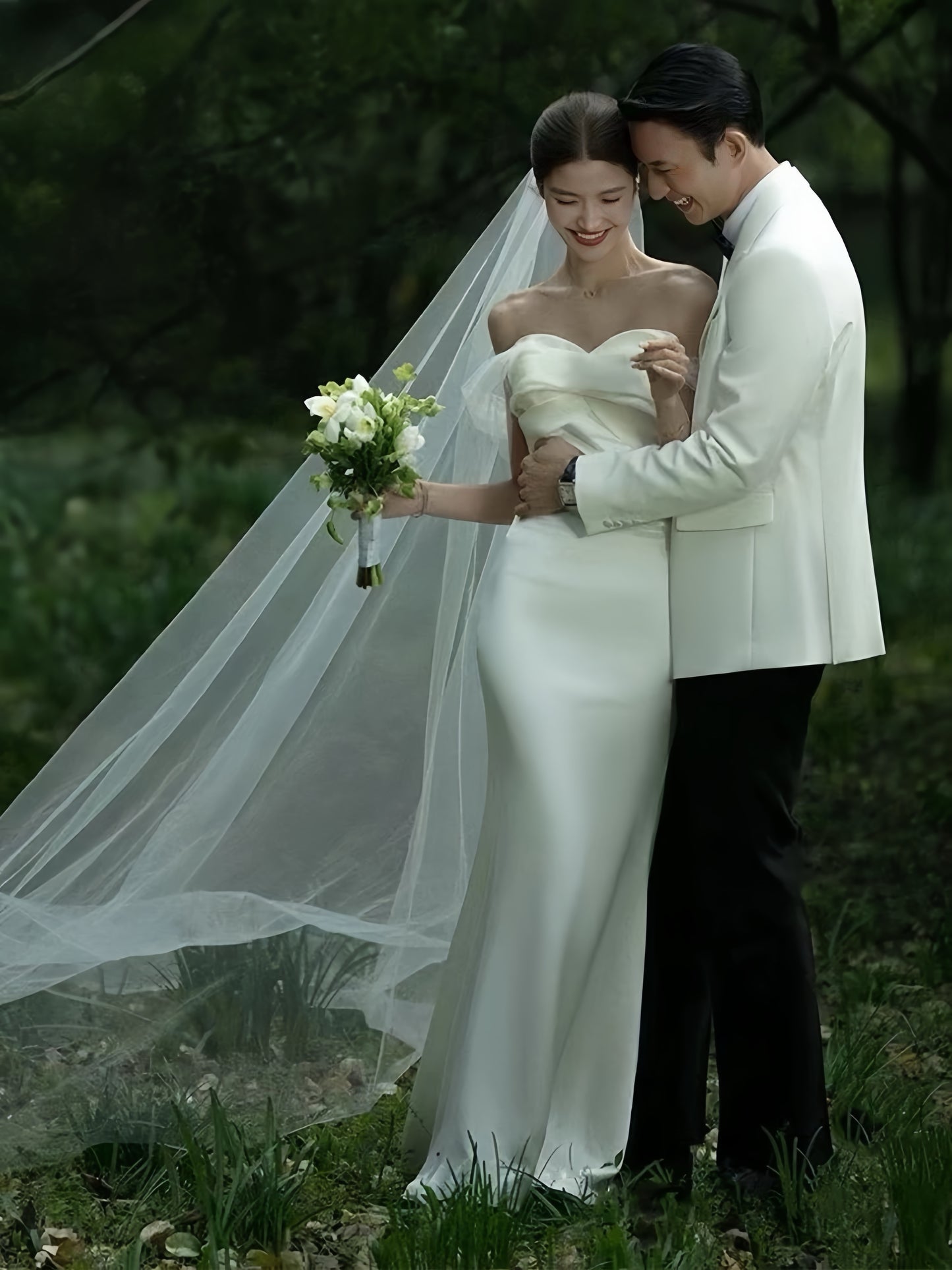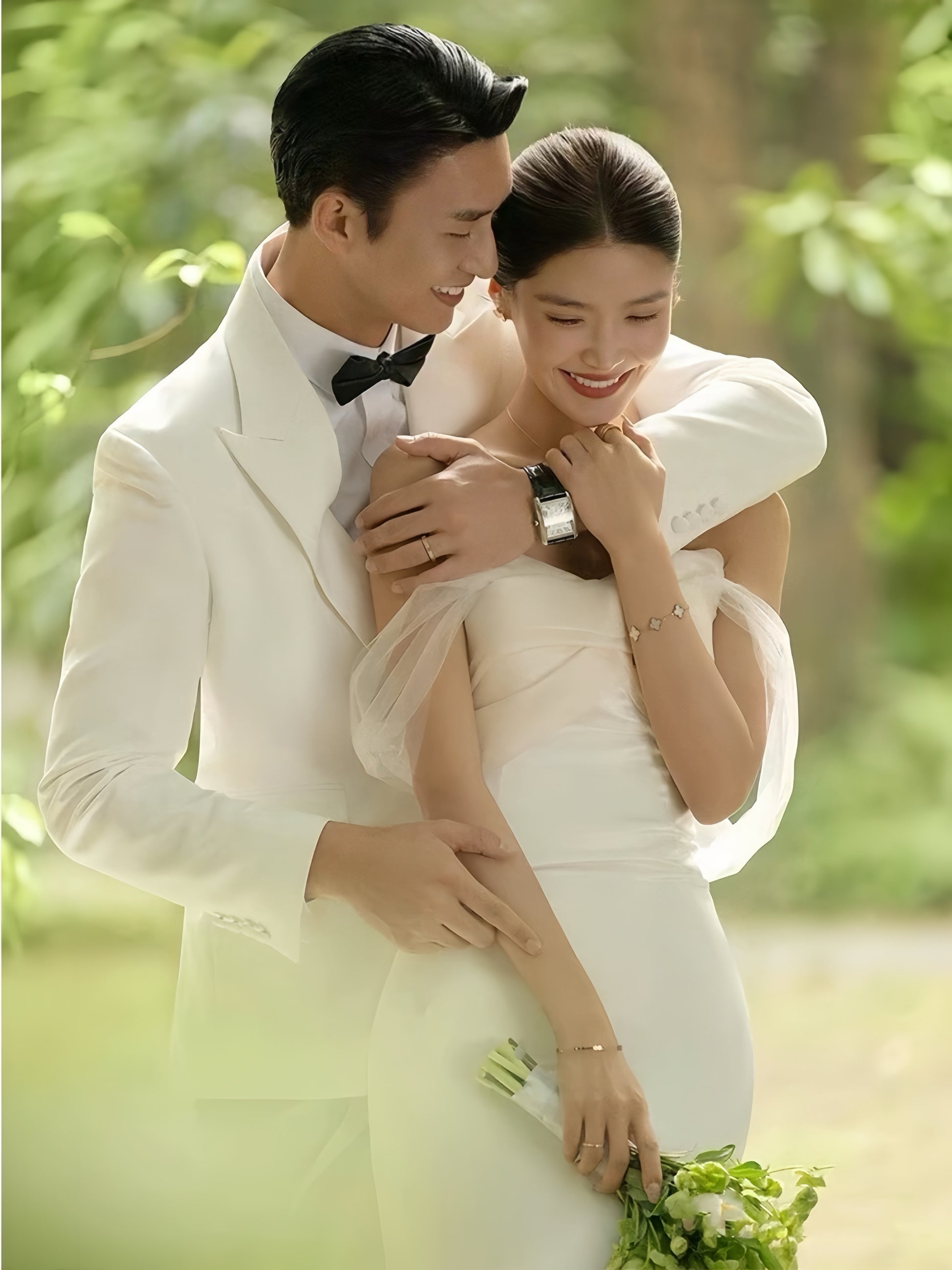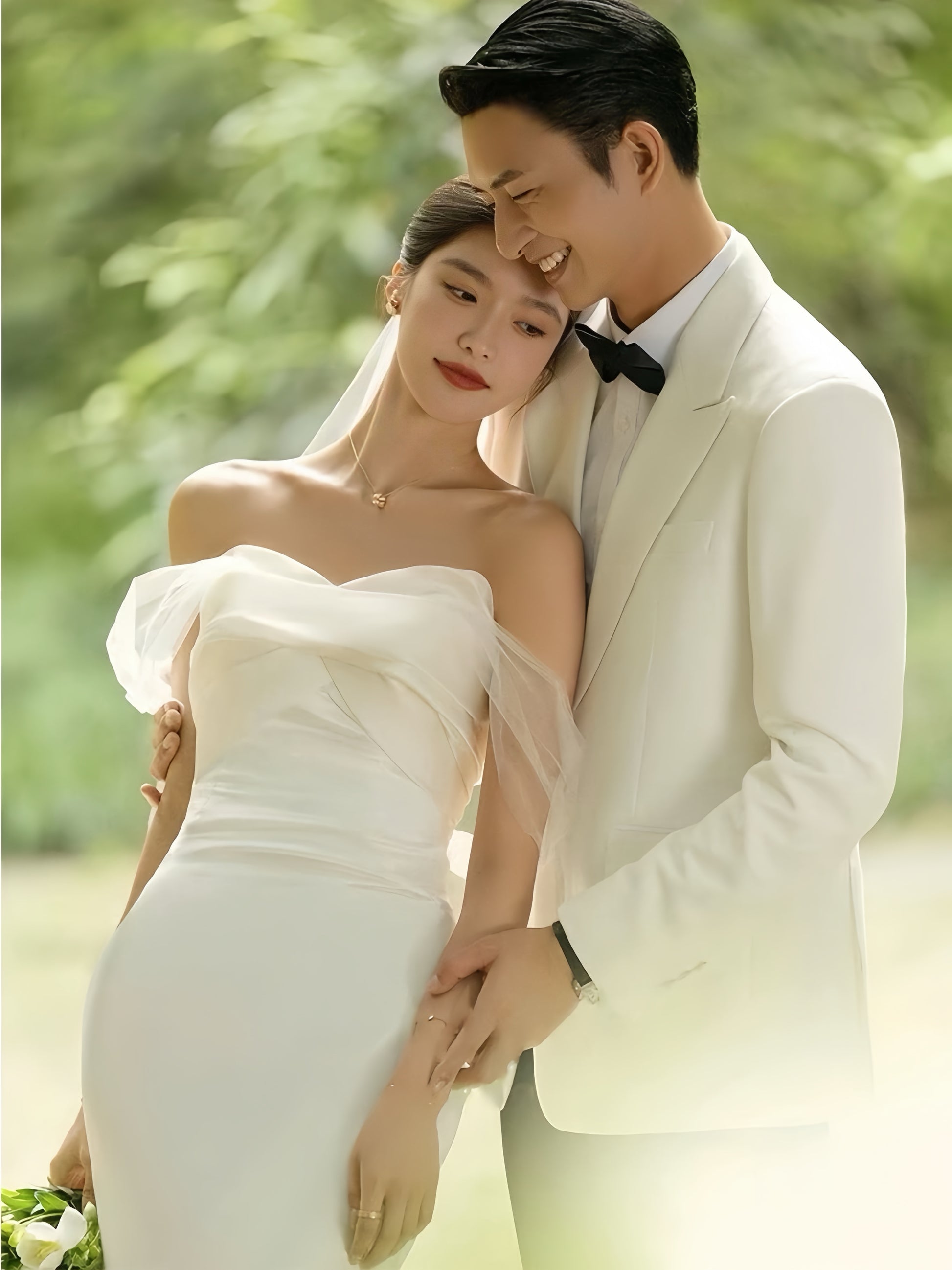 上質なサテンの輝きが際立つ、エレガントでミニマルなデザインのウェディングドレス。オフショルダーのディテールがデコルテを美しく引き立て、自然に流れるラインが花嫁のシルエットを一層華奢で上品に見せます。シンプルでありながらも洗練されたデザインは、どんなシーンにも調和し、ガーデンウェディングやチャペル挙式に最適です。