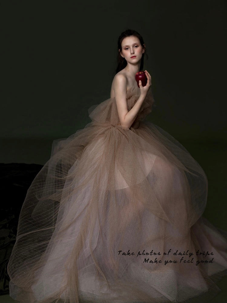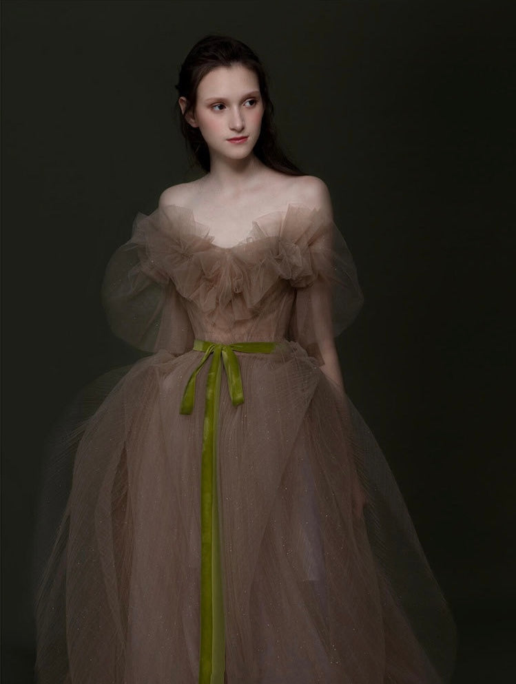 幻想的な美しさをまとう、ヴィンテージ感あふれるオフショルダードレス。繊細なチュールが幾重にも重なり、柔らかく流れるようなシルエットを生み出します。アンティークなカラーがクラシックな雰囲気を醸し出し、まるで絵画の中のヒロインのような優雅さを演出。