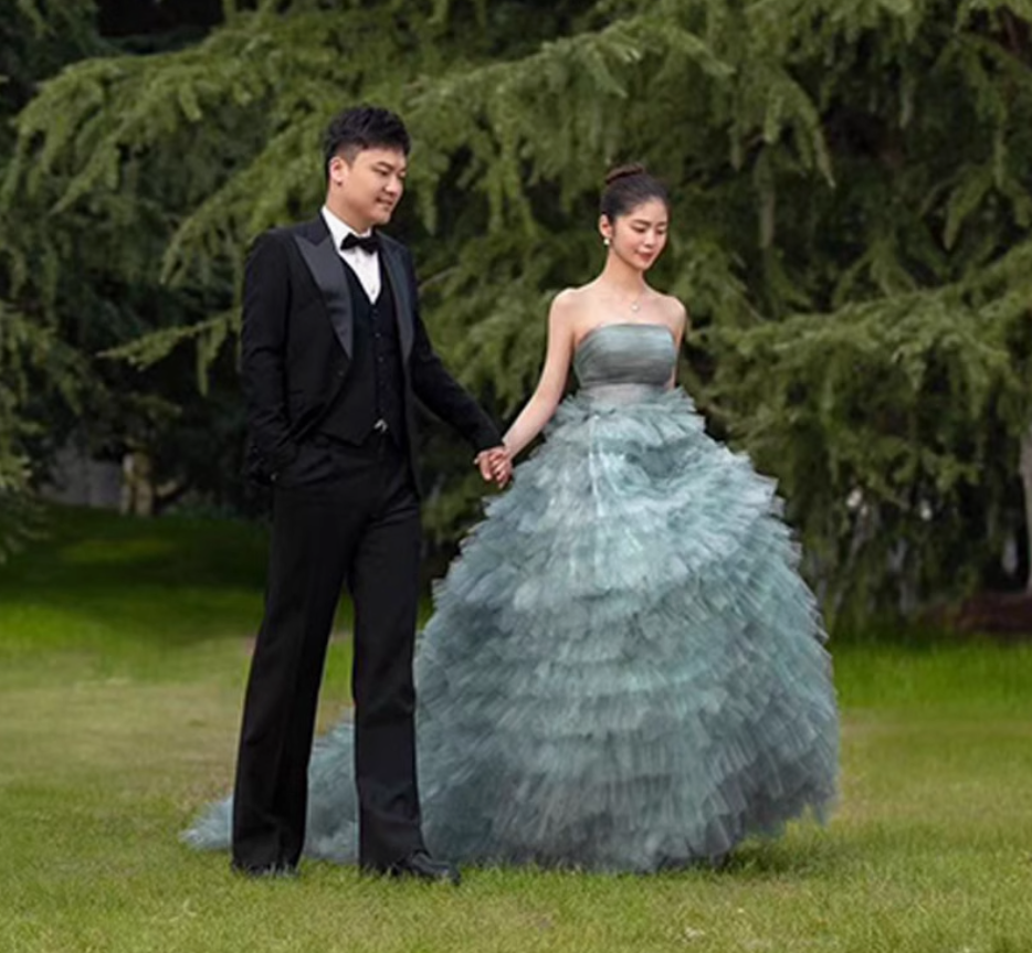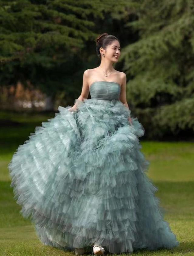 鮮やかなグリーンカラーとフリルが特徴の華やかなチュールドレス。
