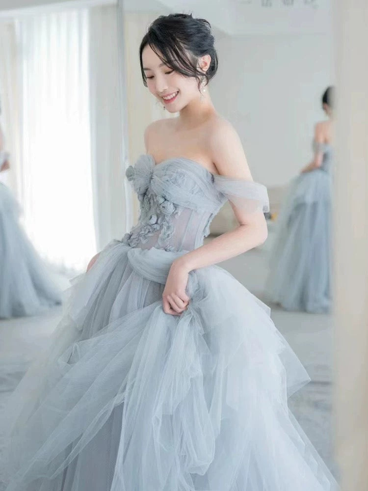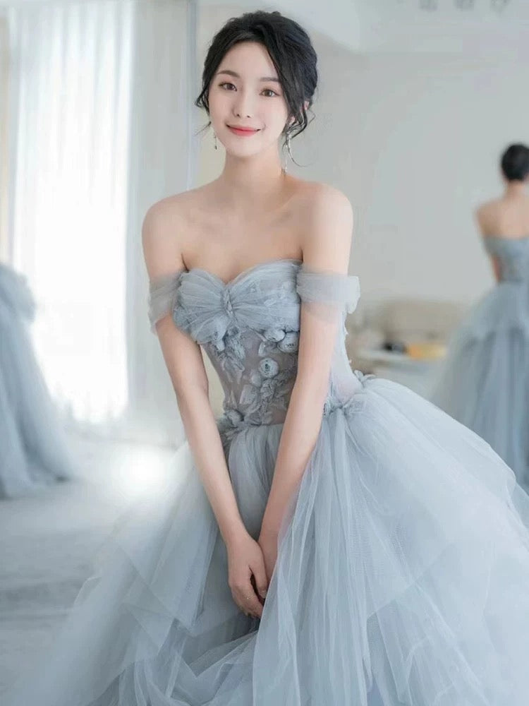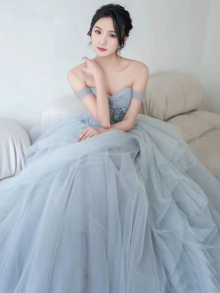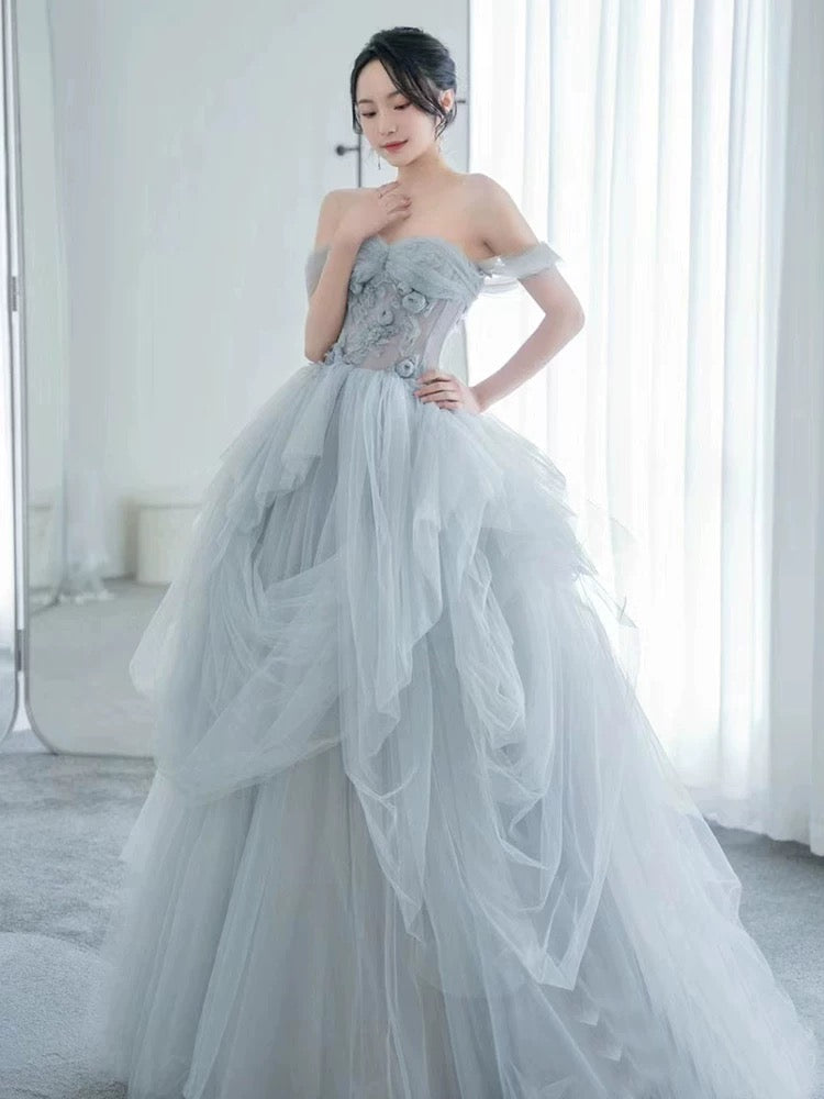 エレガントなブルーグレーが特徴の、ロマンティックでフェミニンなウェディングドレスです。柔らかなチュール素材が幾重にも重なり、夢のような軽やかさを演出。繊細なフラワーディテールが胸元を彩り、デコルテラインを美しく引き立てます。オフショルダーデザインは女性らしい柔らかさを表現し、リラックスした中にも上品さを感じさせる仕上がりです。