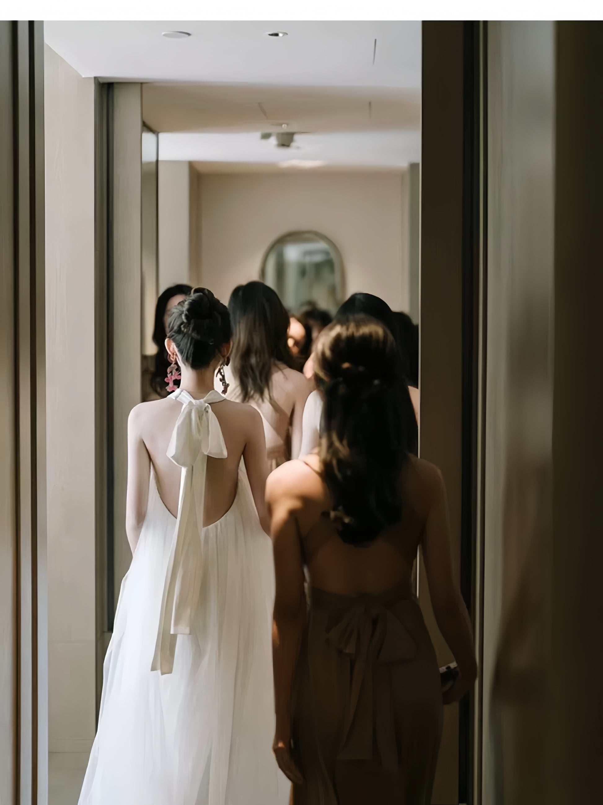シンプルでありながら上品さを極めたデザインが特徴です。柔らかなチュール素材が体にふんわりと寄り添い、軽やかな動きを演出します。ハイネックデザインがクラシカルな雰囲気を引き立てつつ、女性らしさを最大限に引き出します。